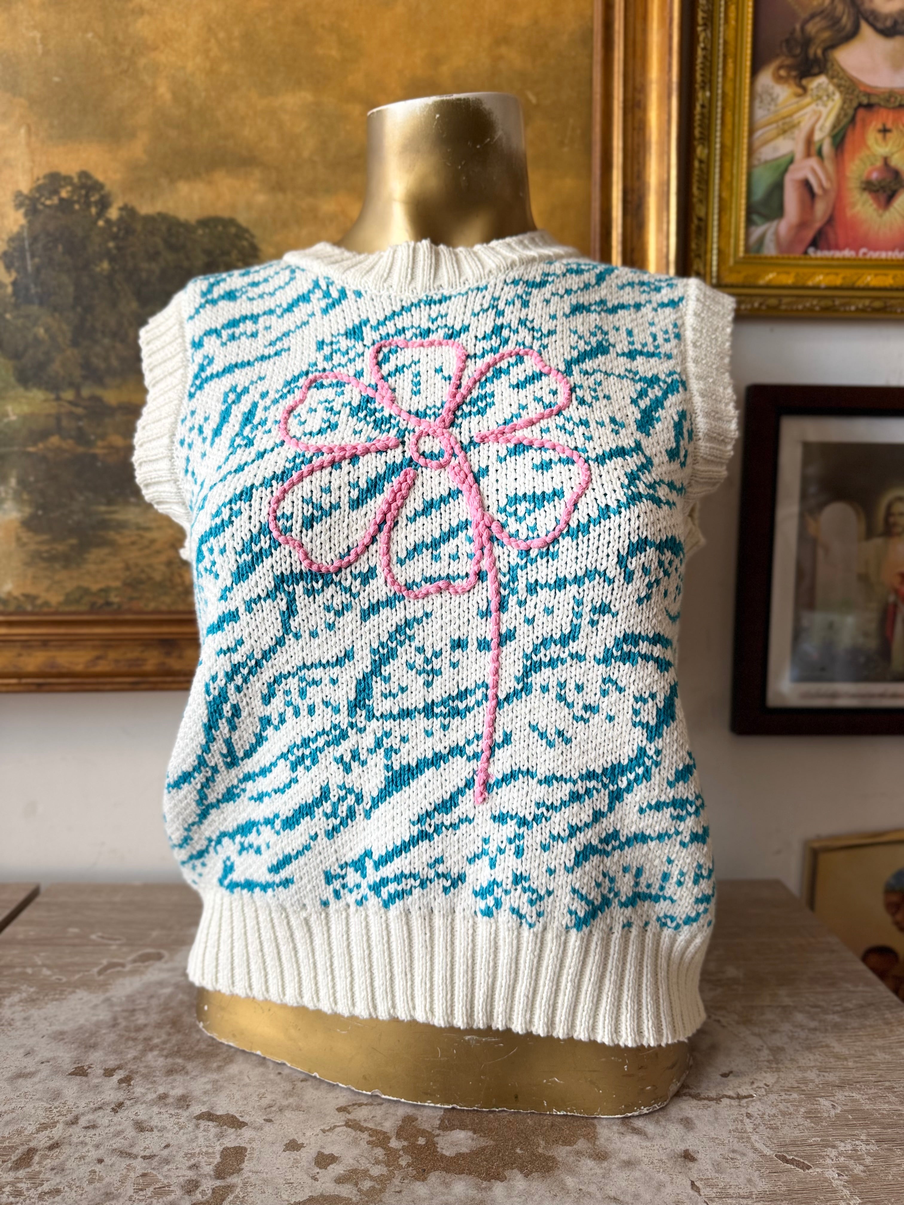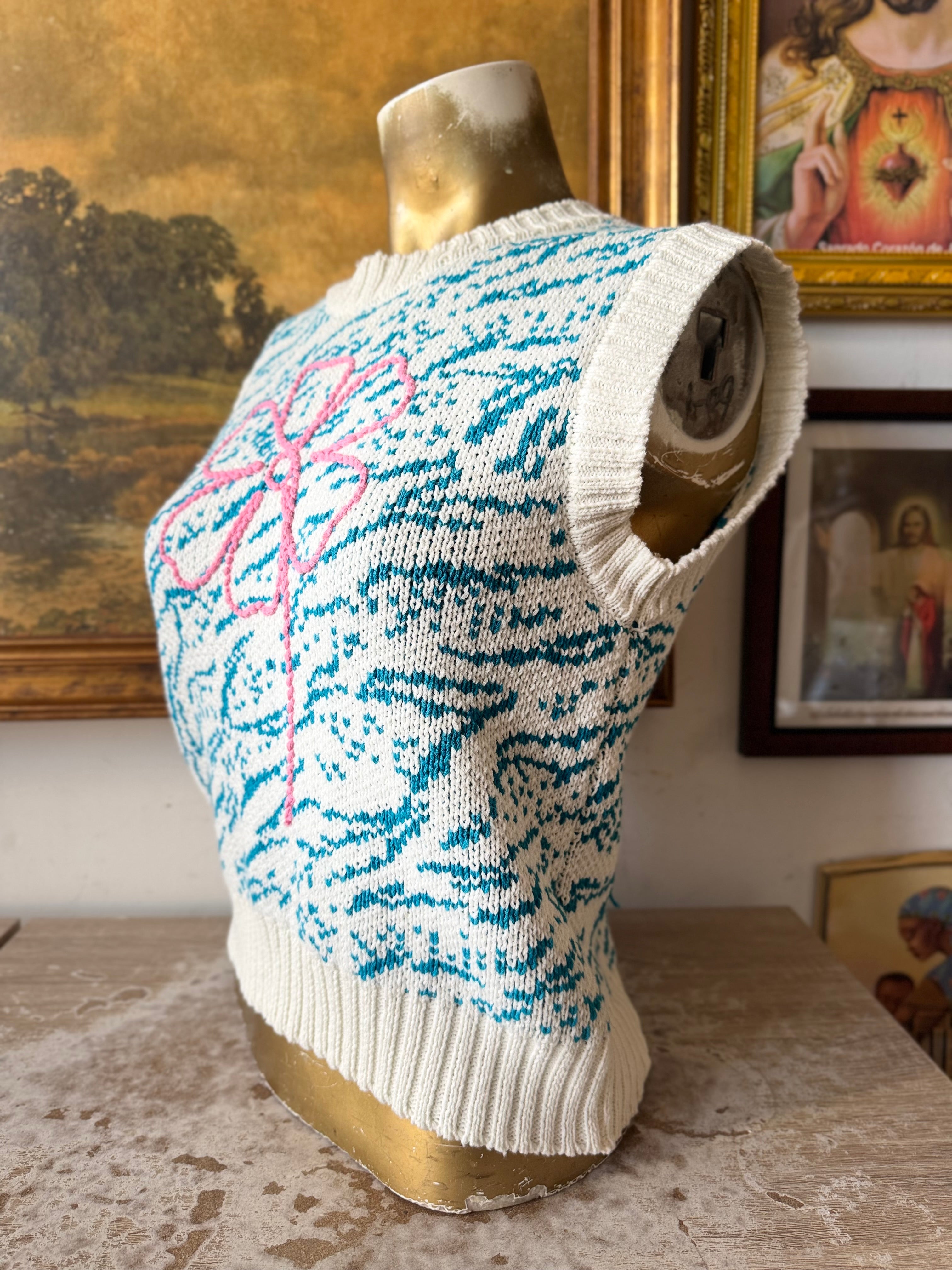 Zara Blue and Pink Floral Embroidered Short Sleeve Sweater Size Medium