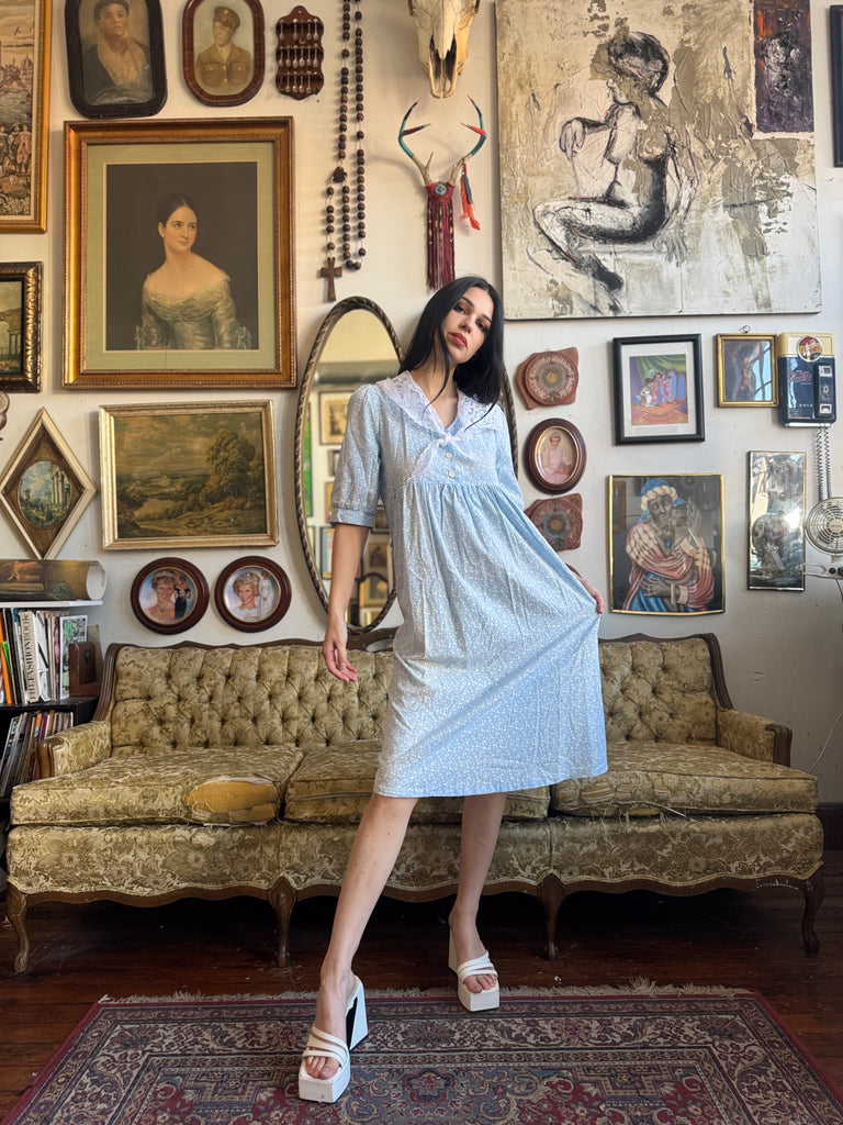 70s Blue Floral Cotton Trimmed Nightgown with Lace on Collar and Sleeves Large