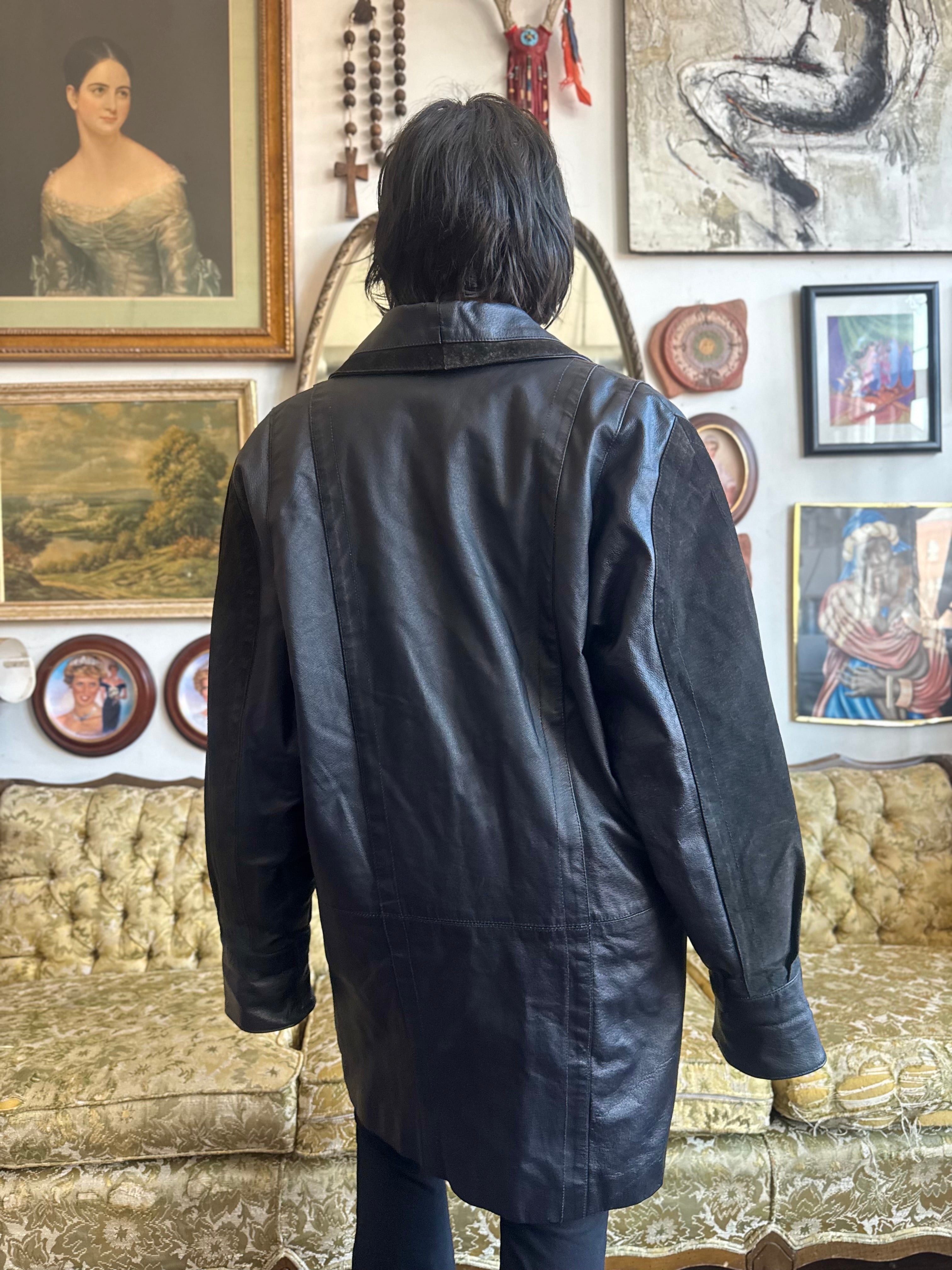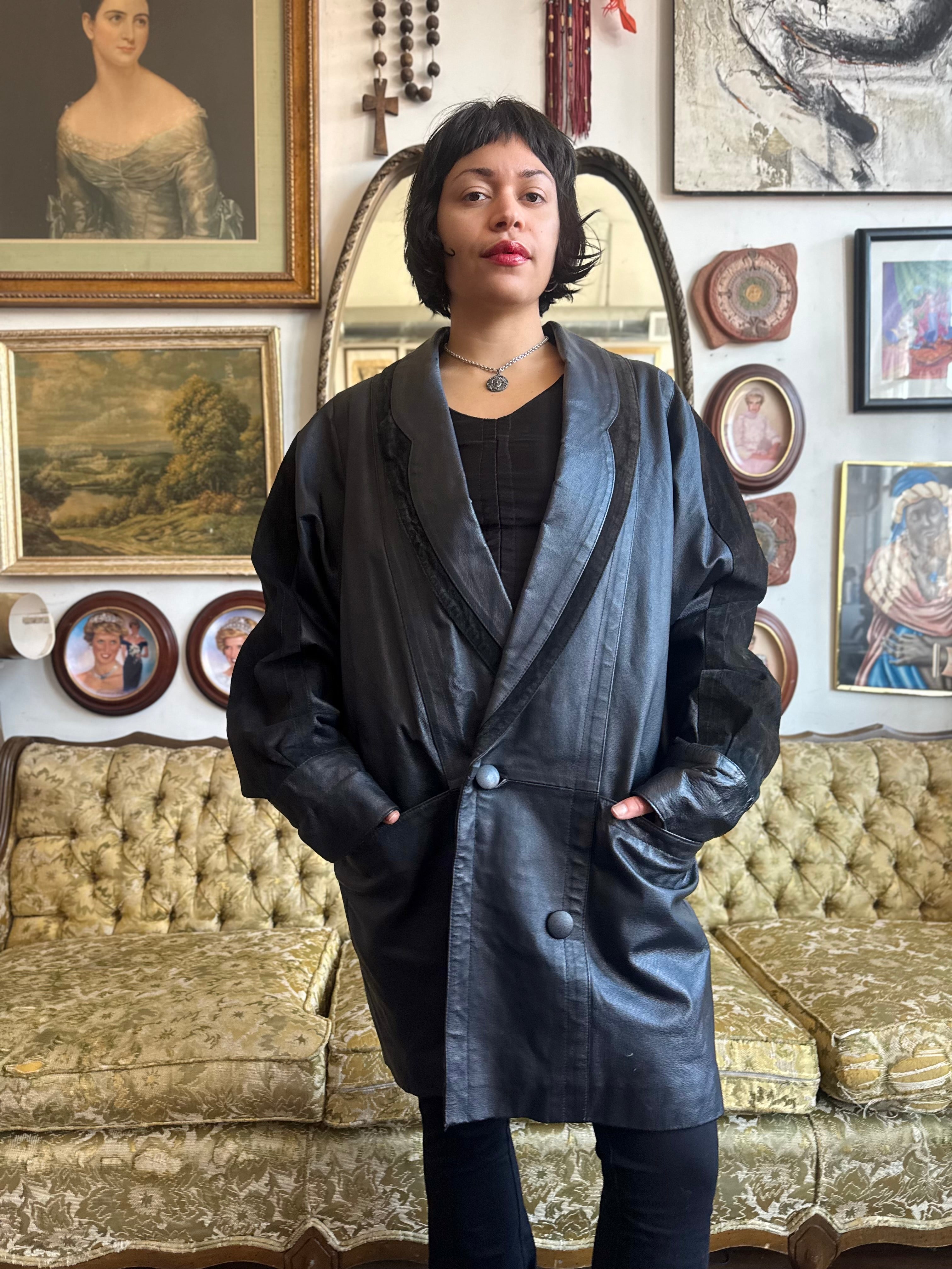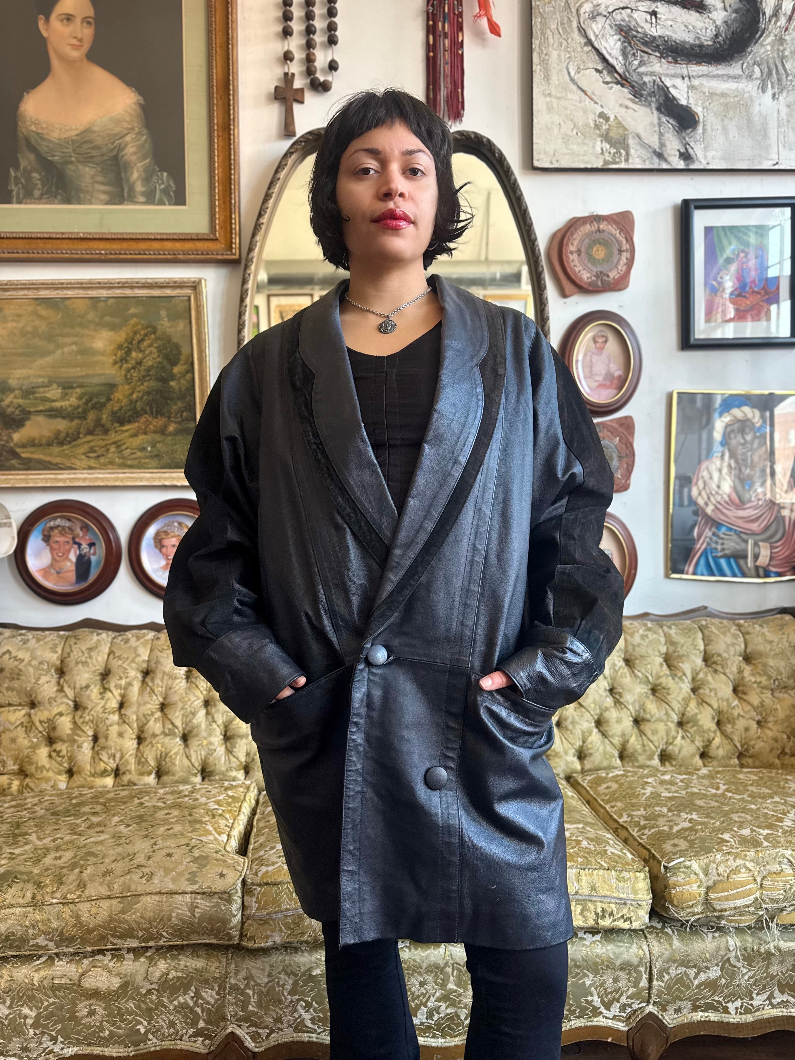 Vintage 1980s Black Leather Oversized Blazer Coat w Lining Size Small