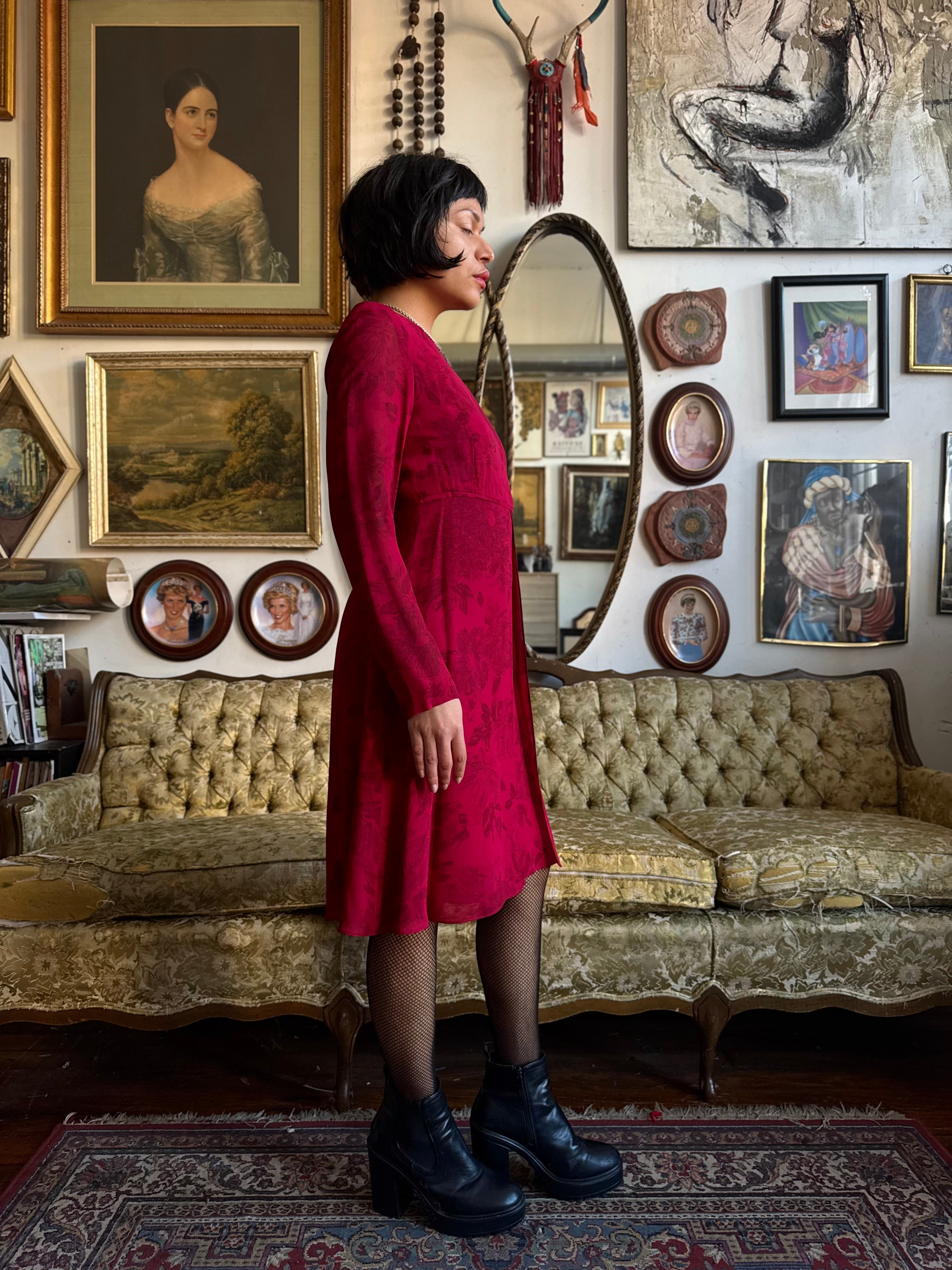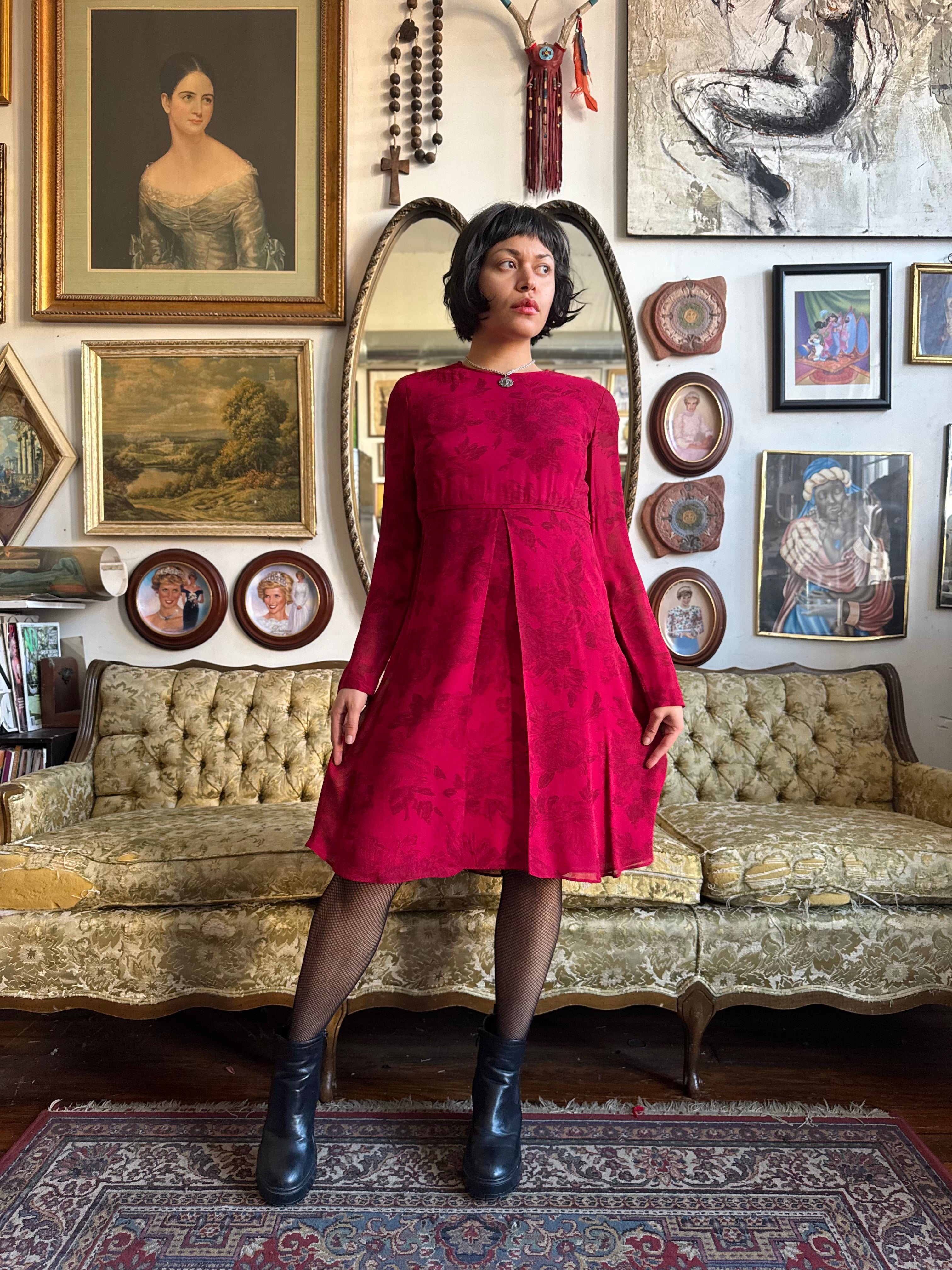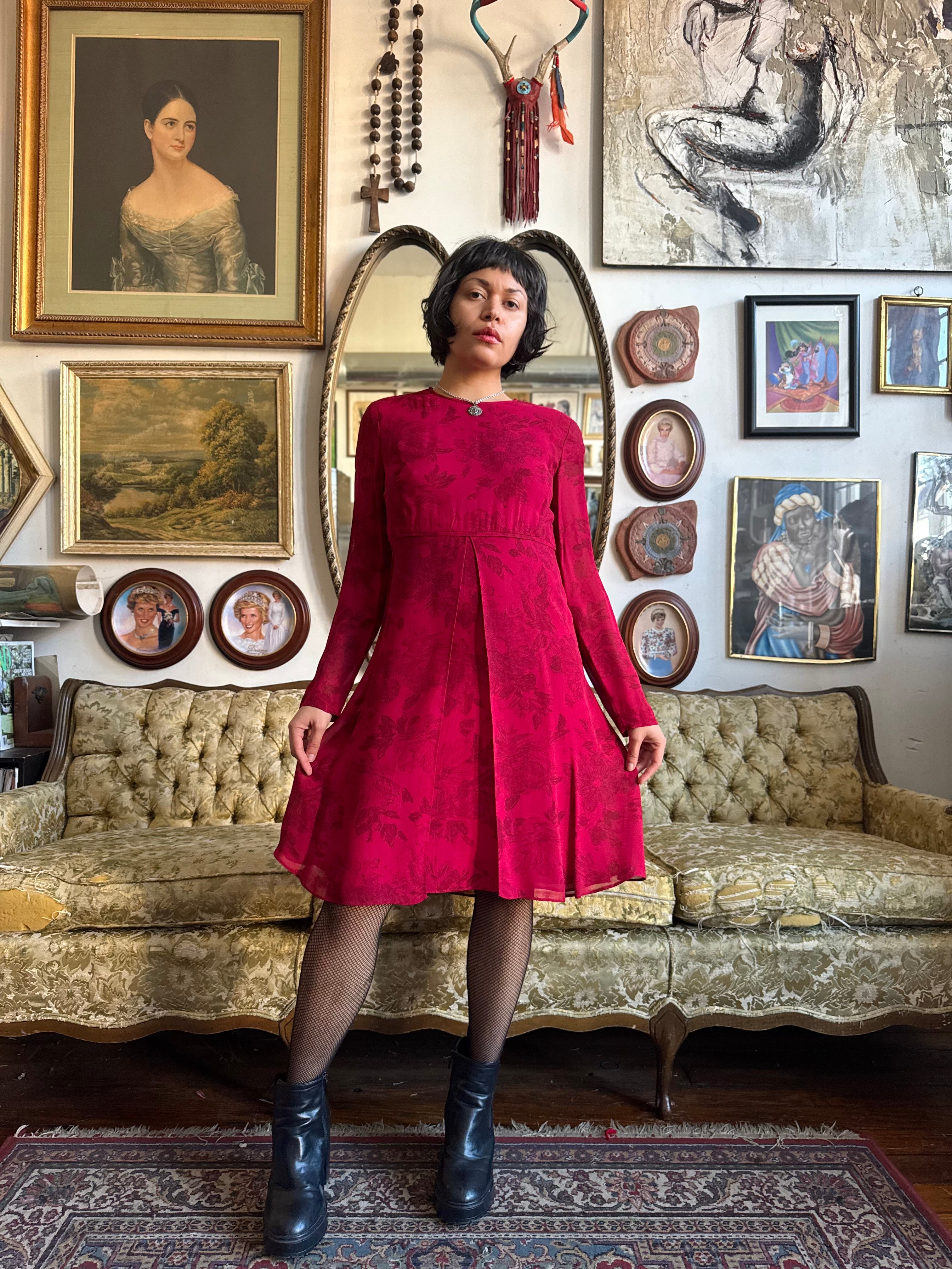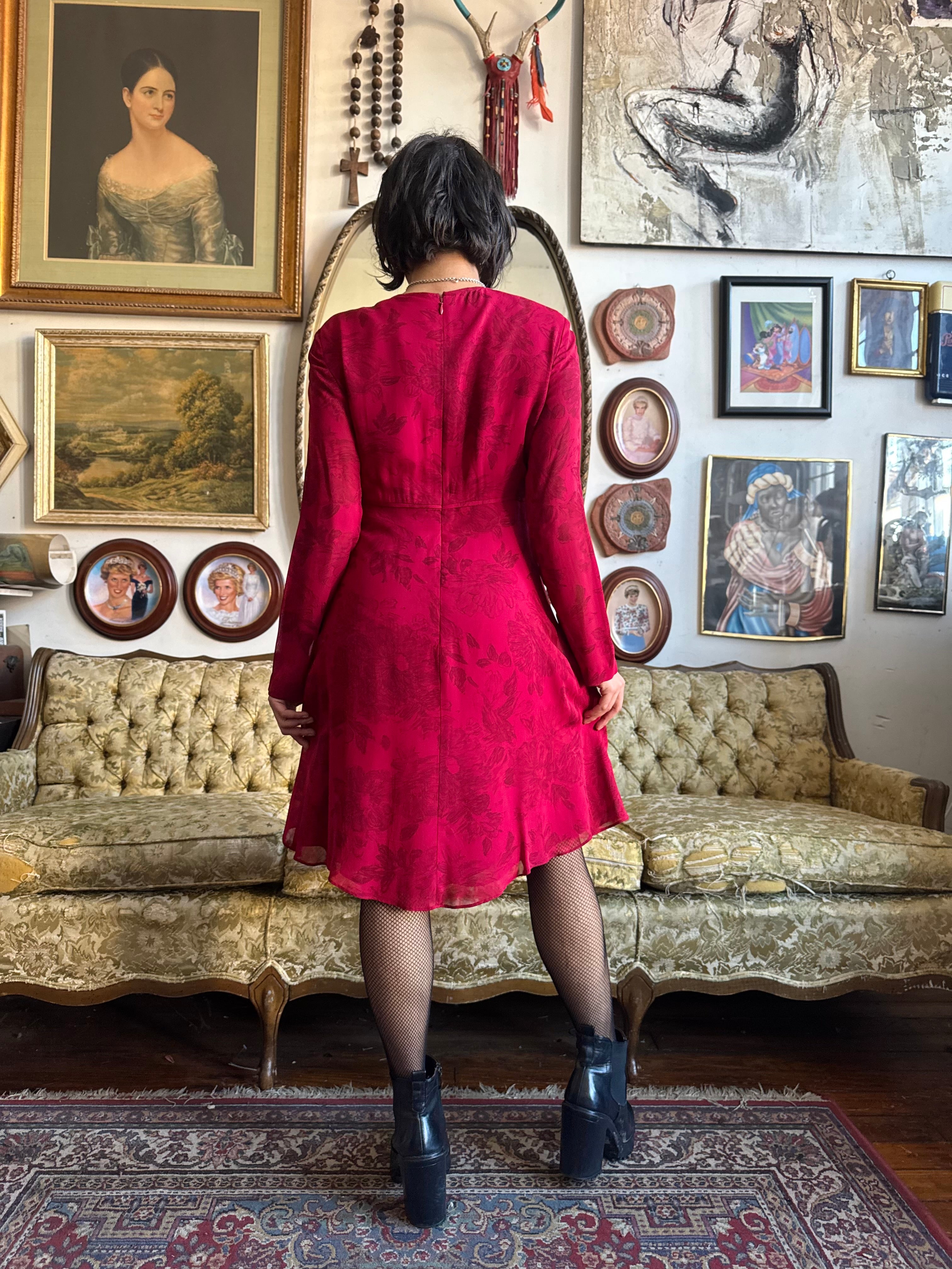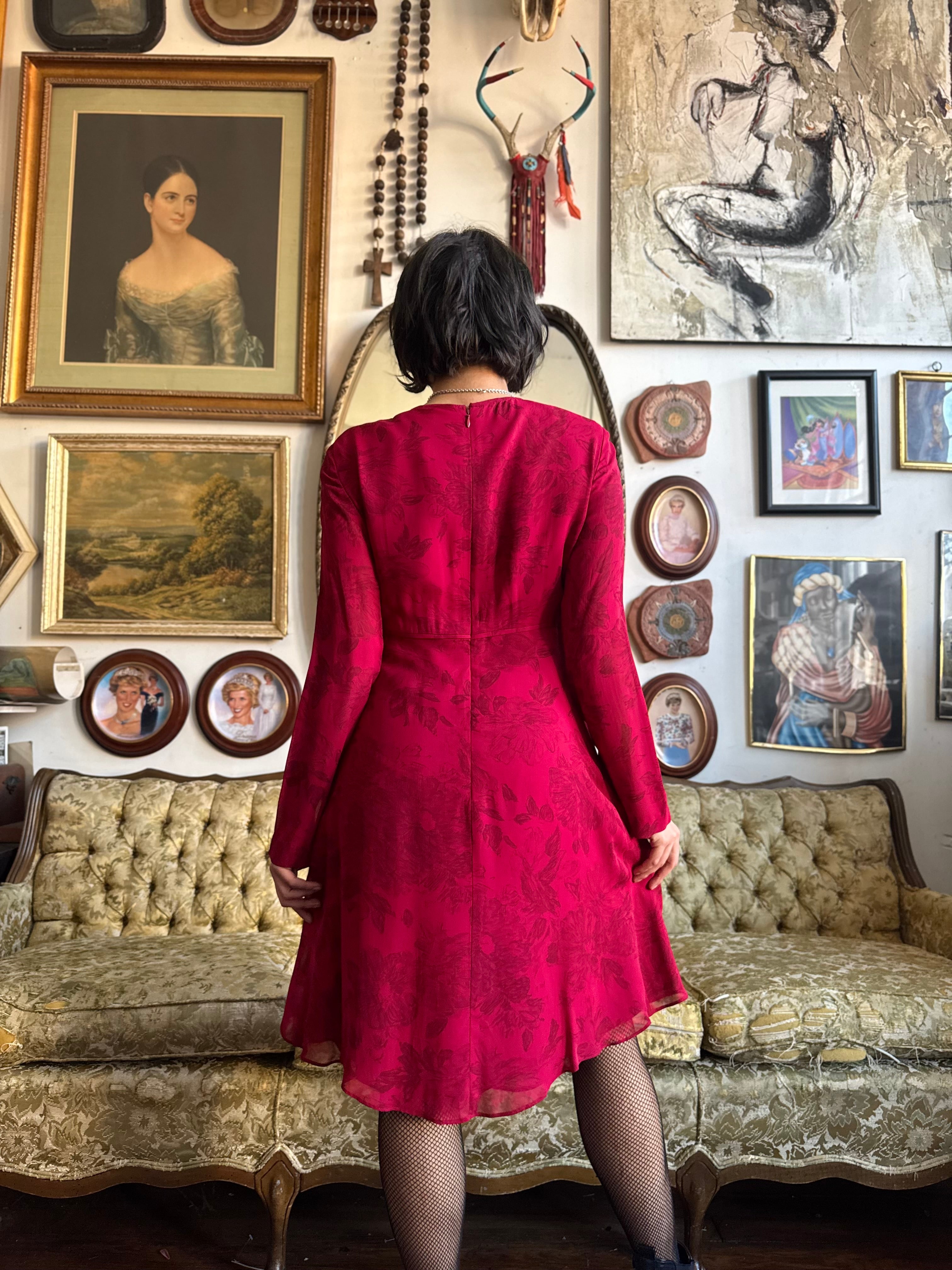 90s Red Floral Long Sleeve Vibrant Red Rayon Dress Size 4