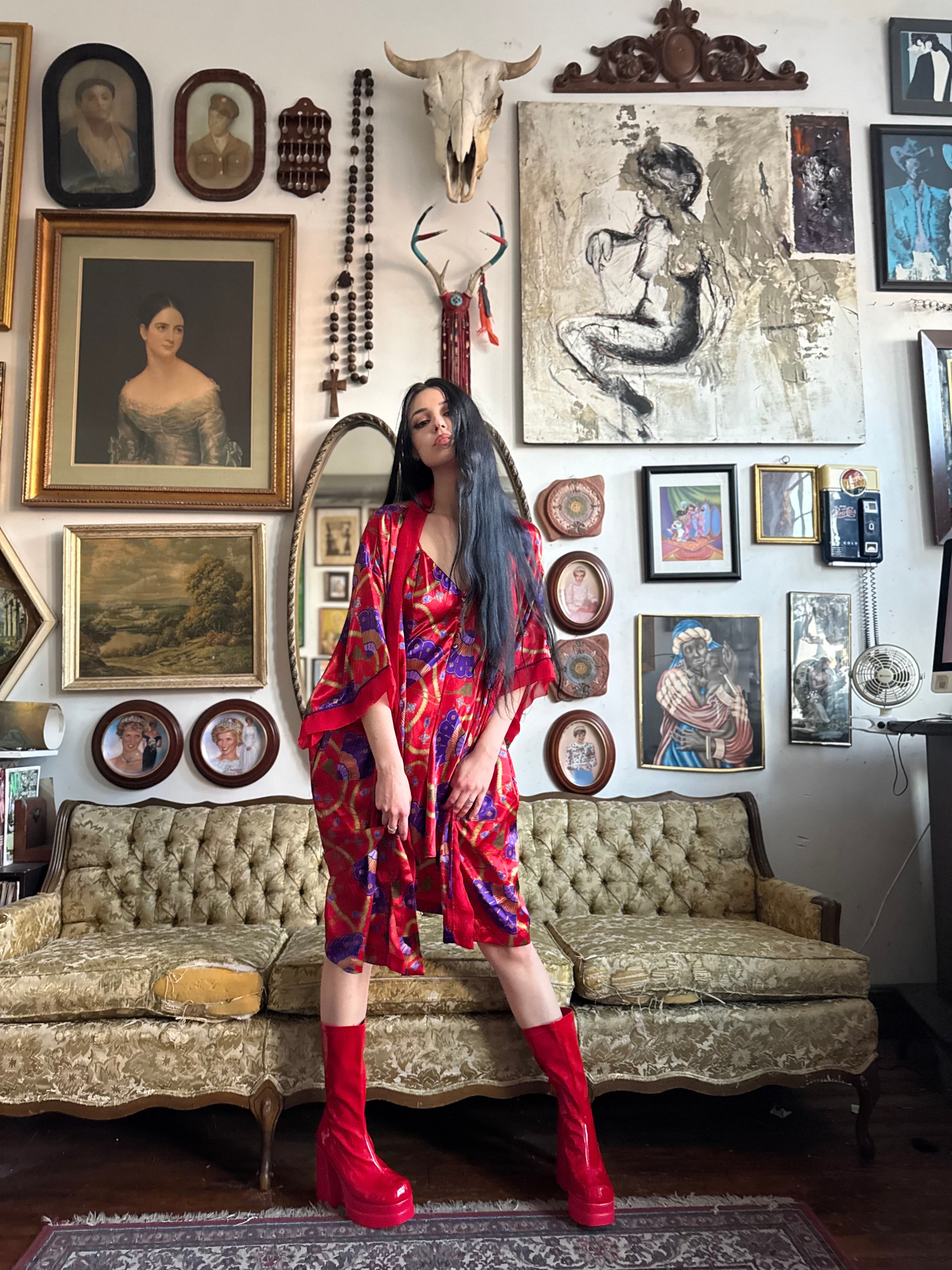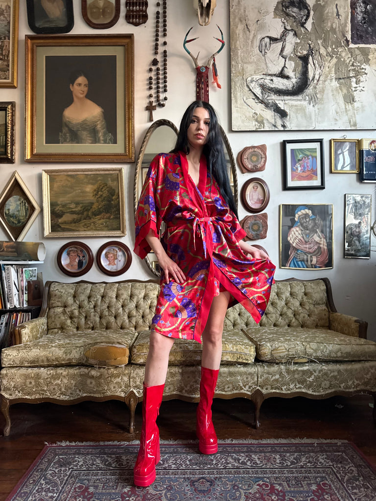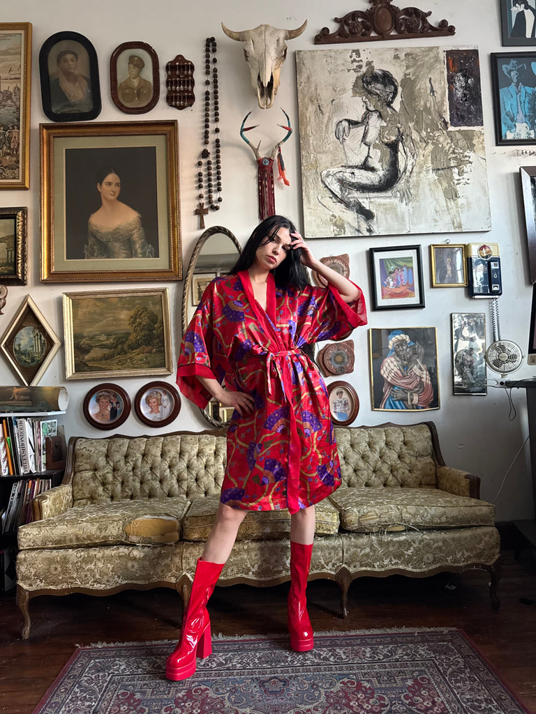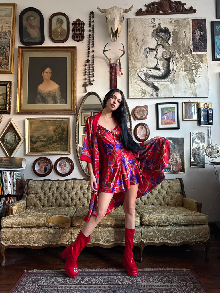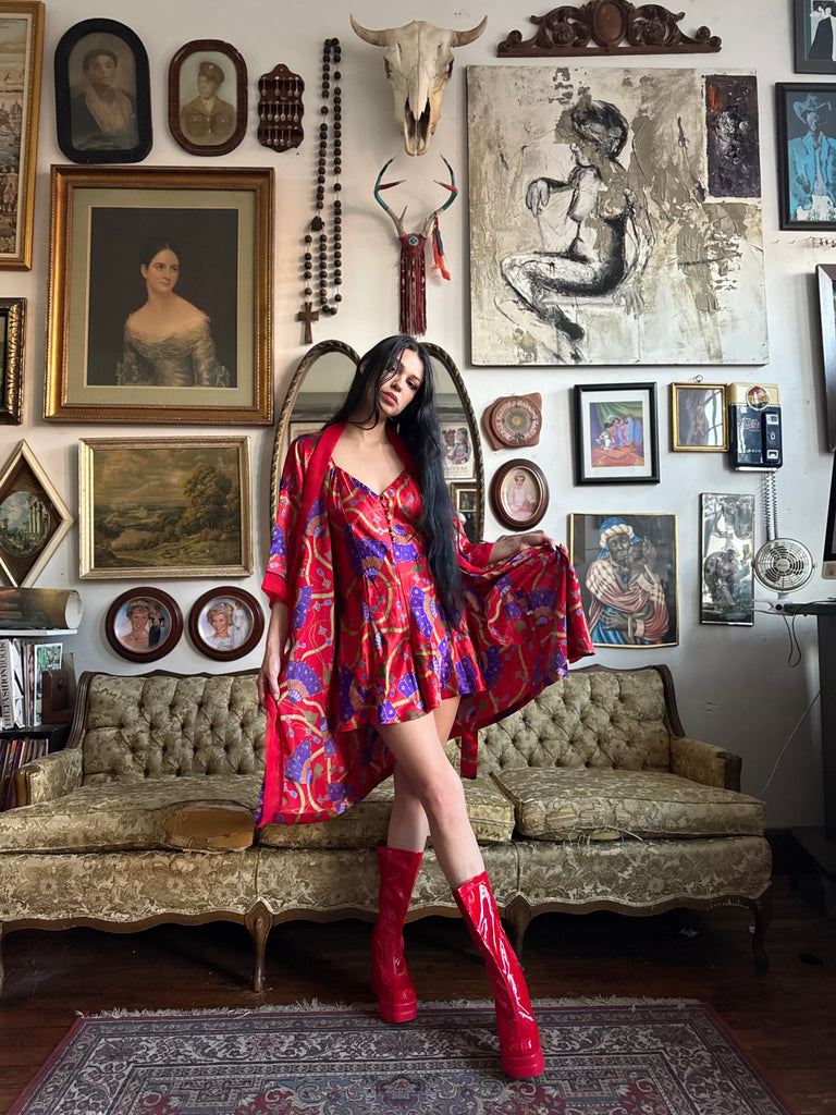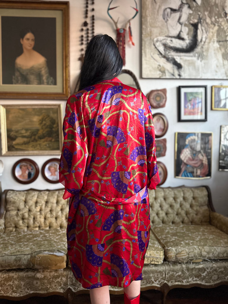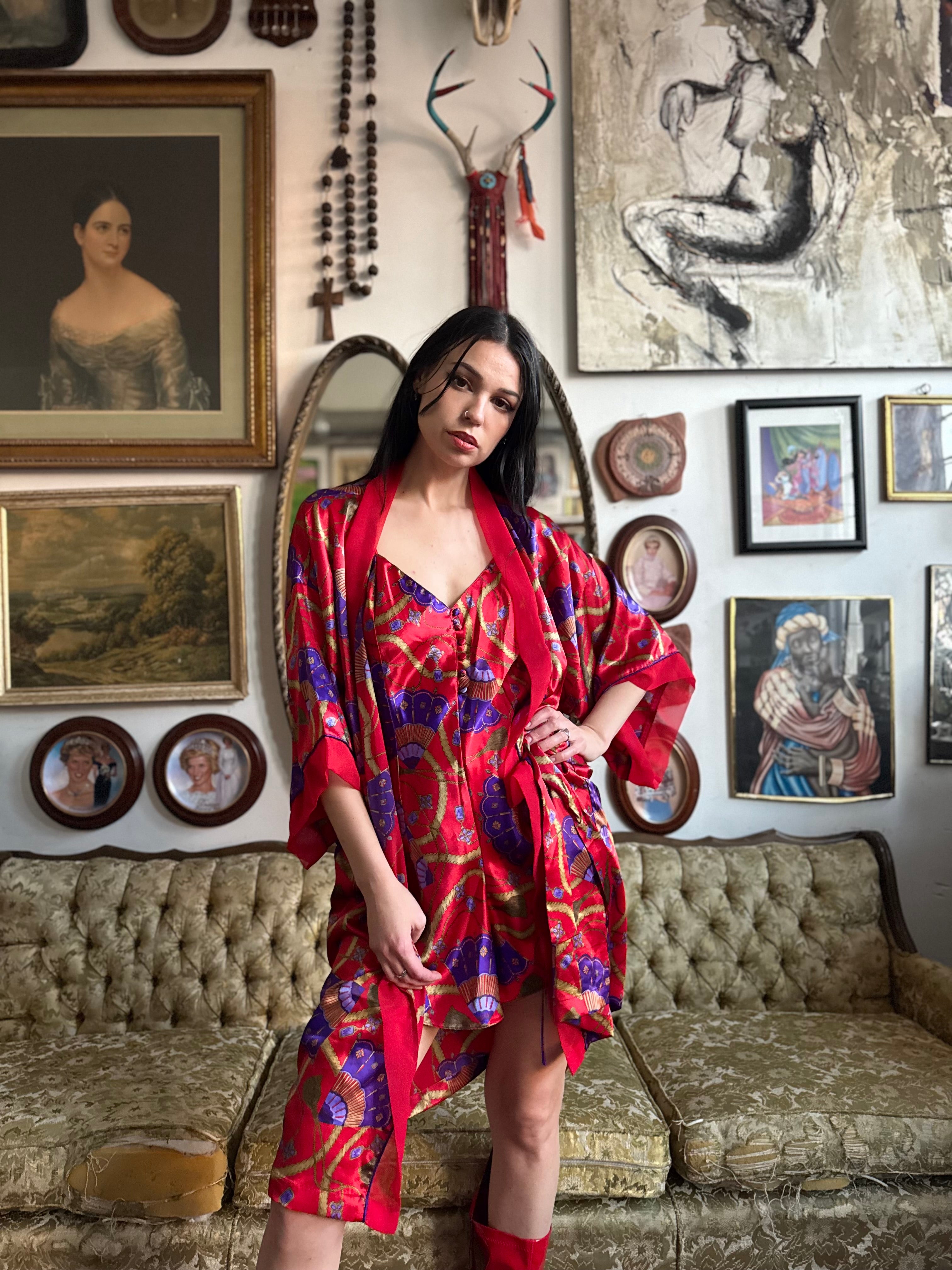 Red and Purple Fan Print Rode and Slip Dress Set Size L