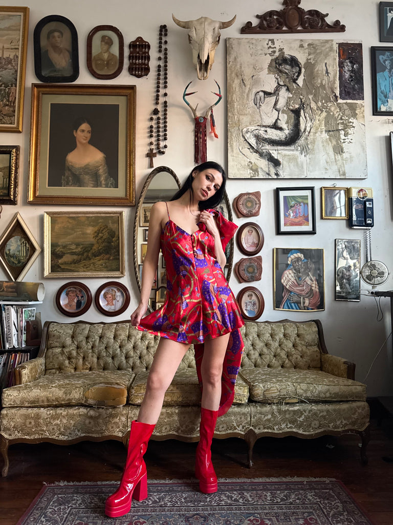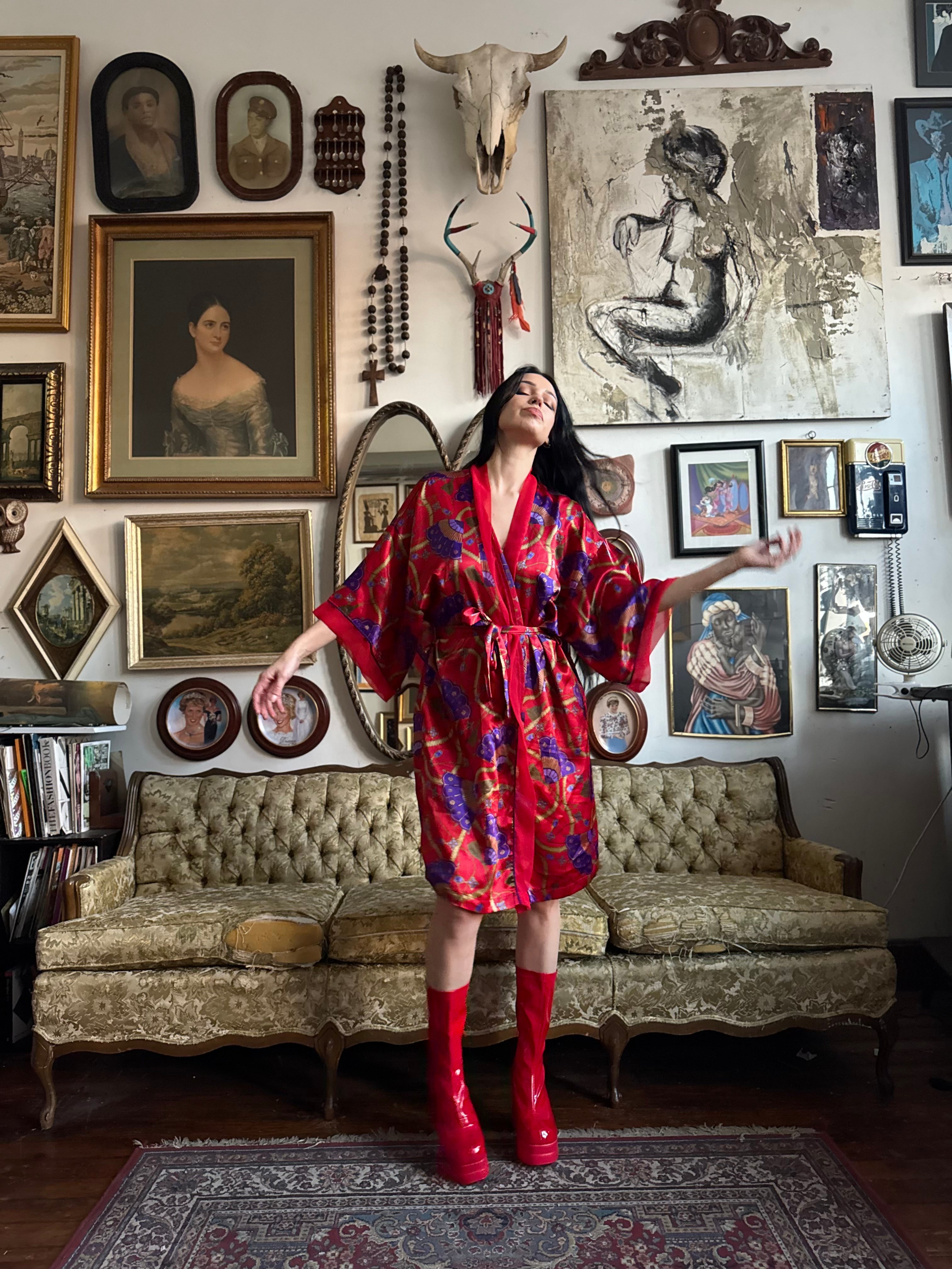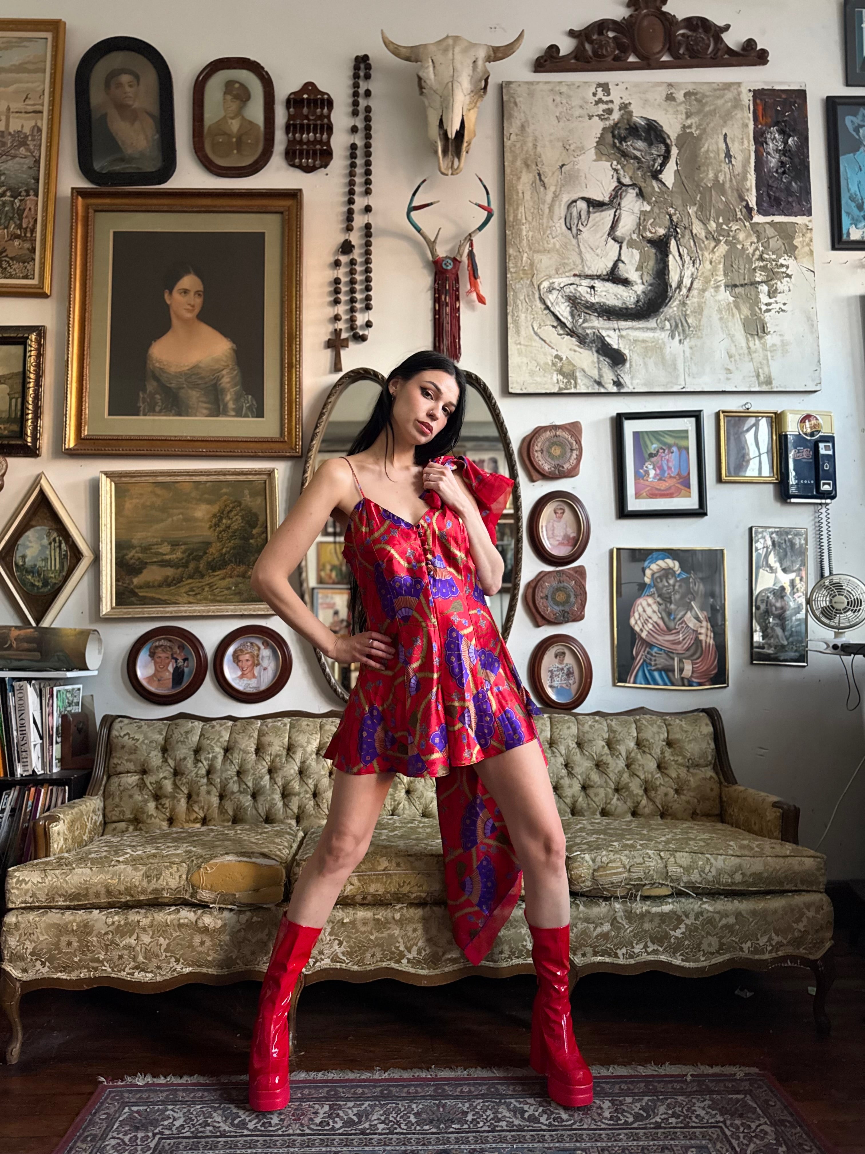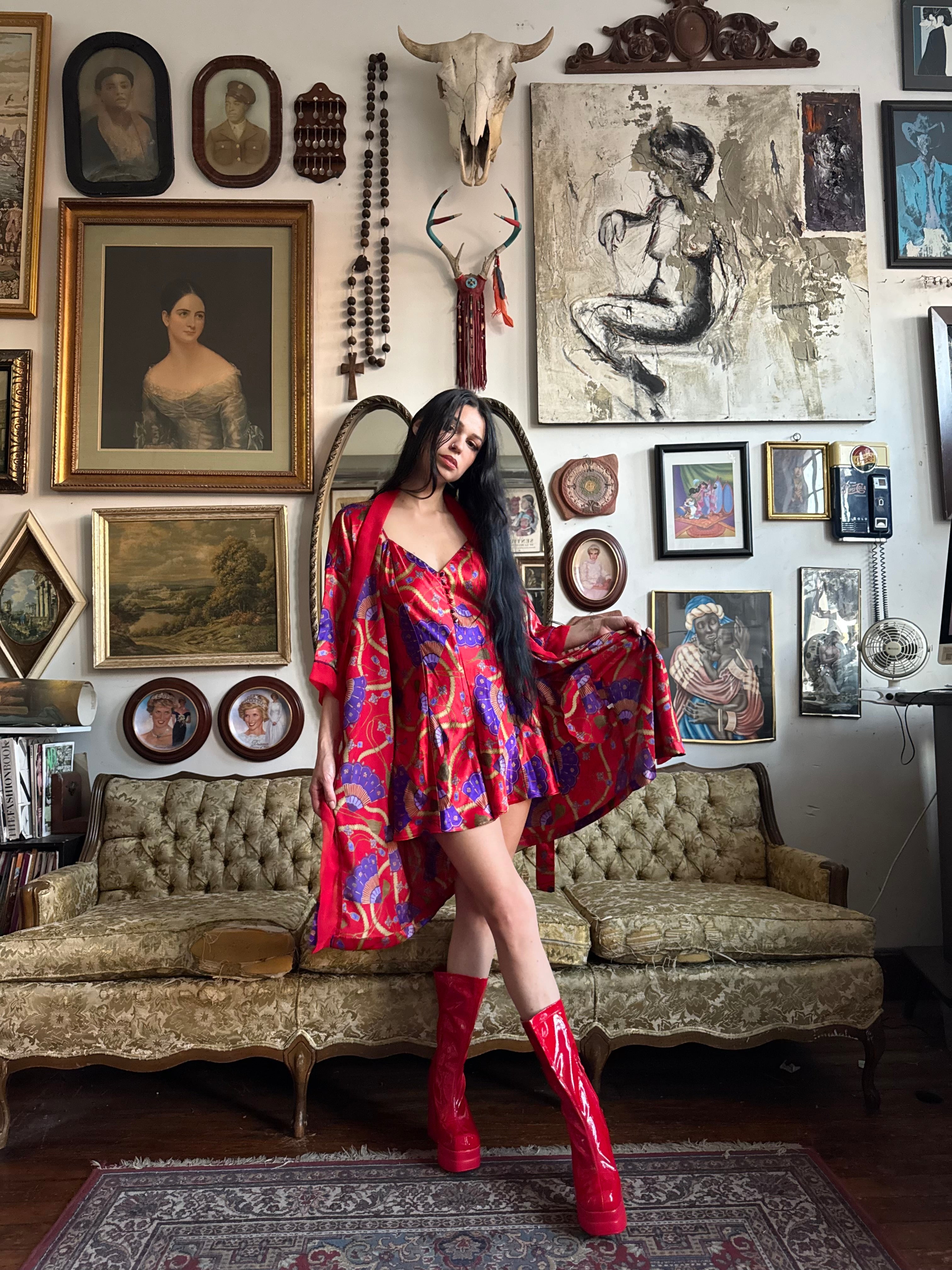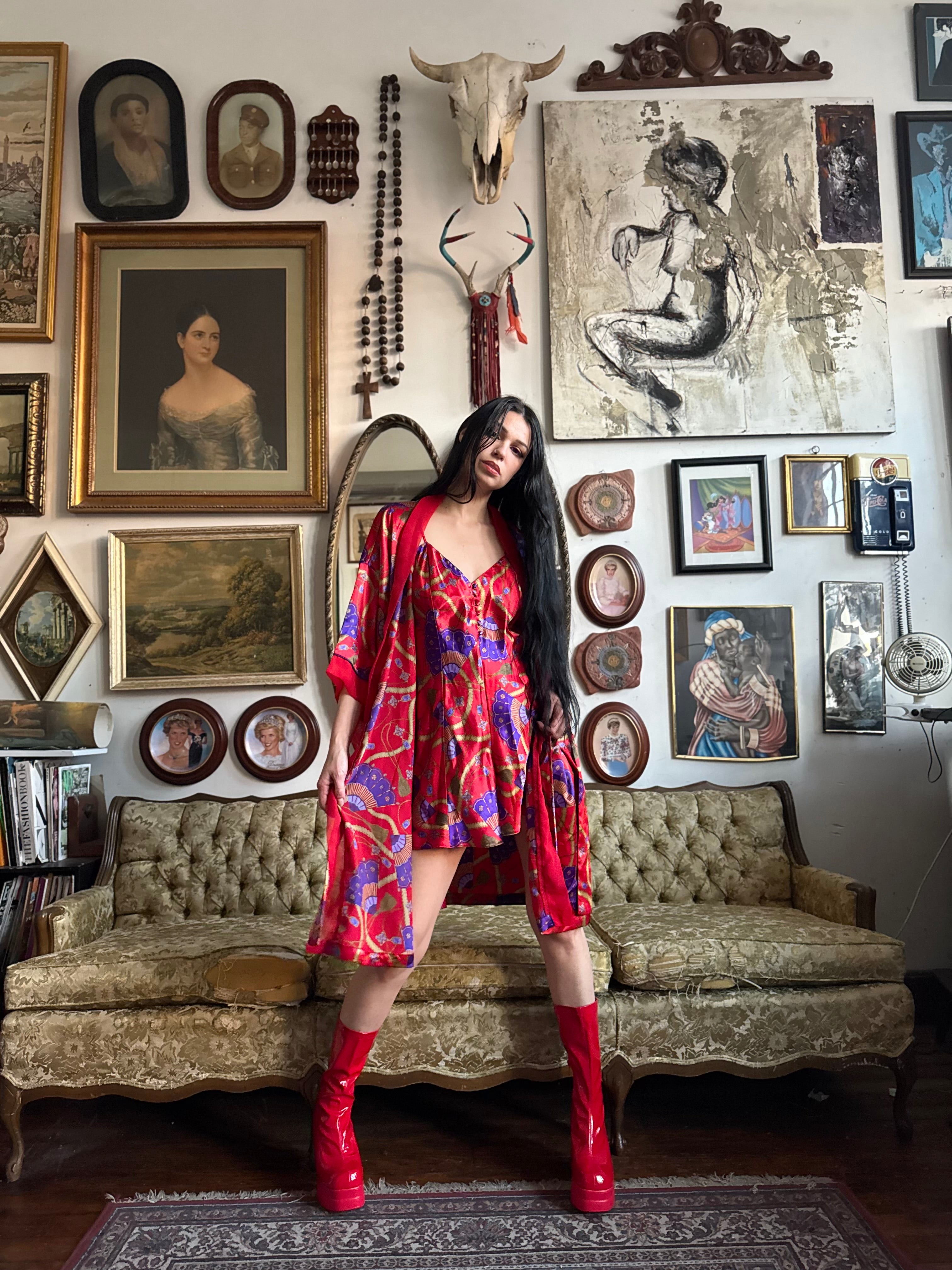 Red and Purple Fan Print Rode and Slip Dress Set Size L