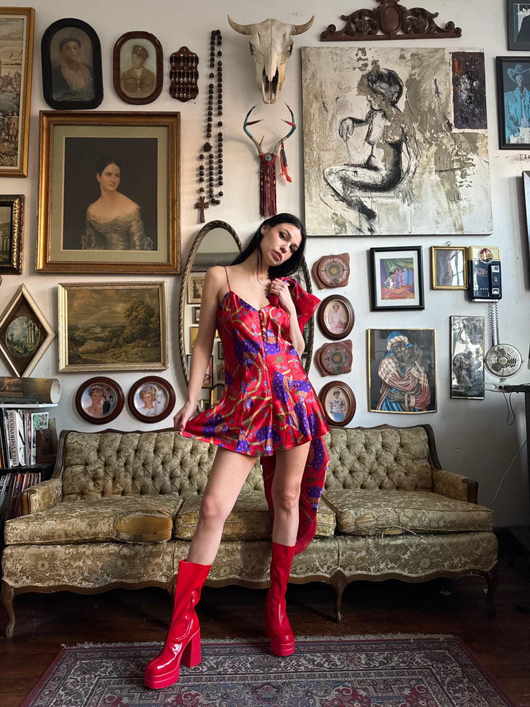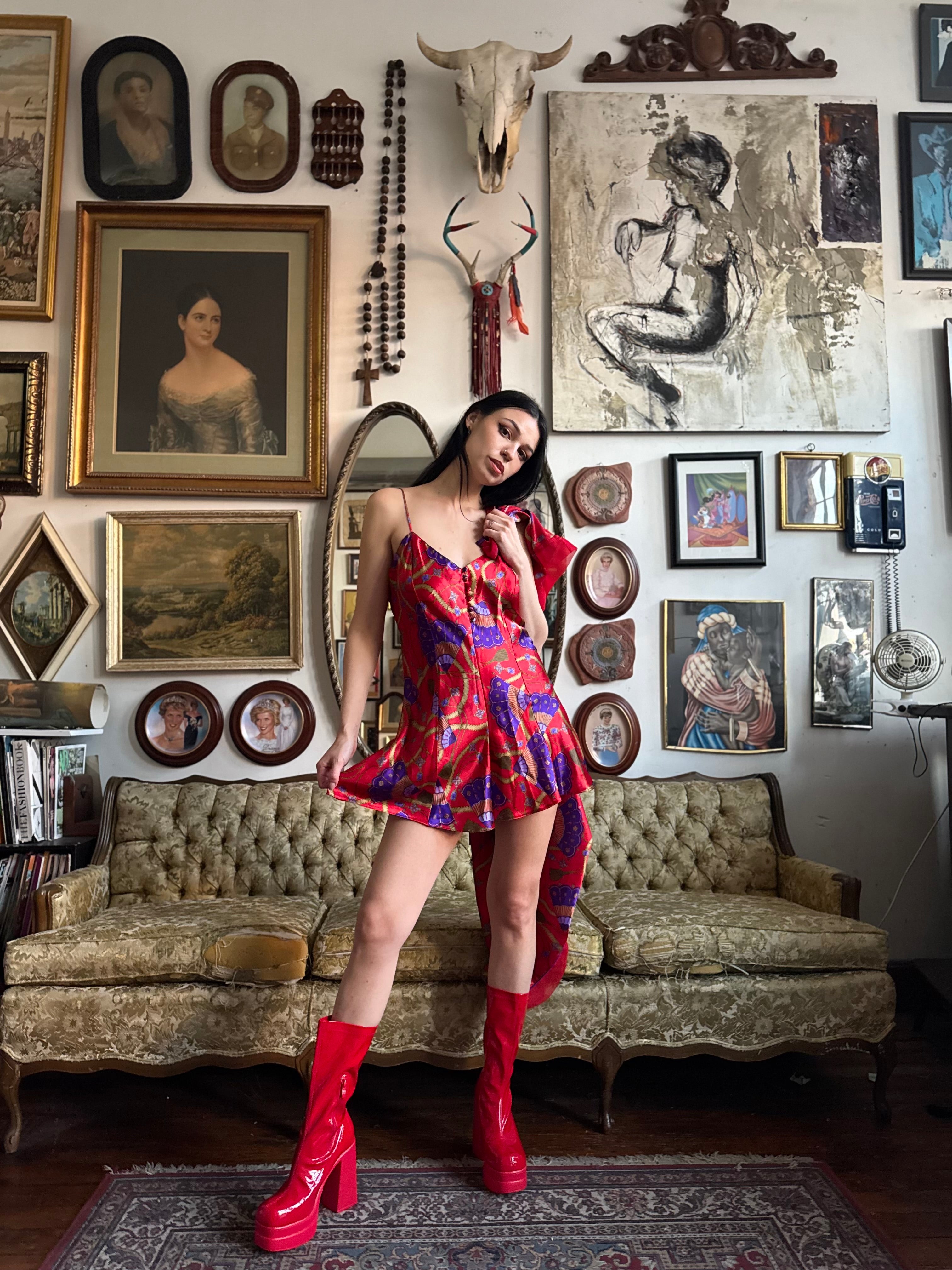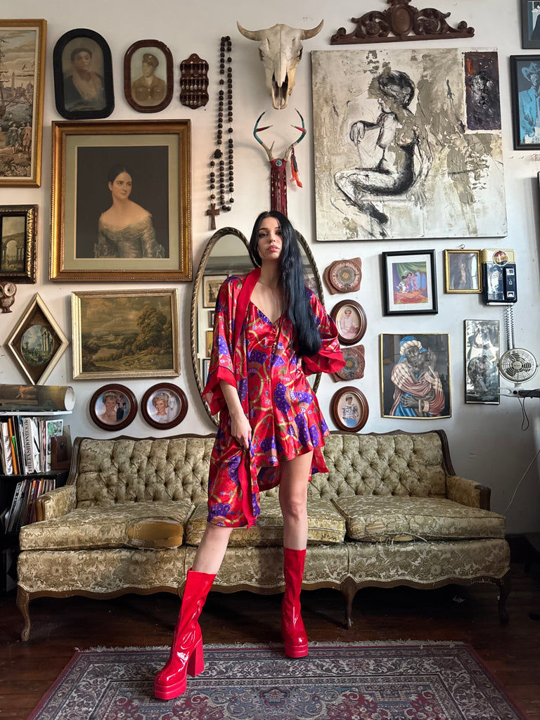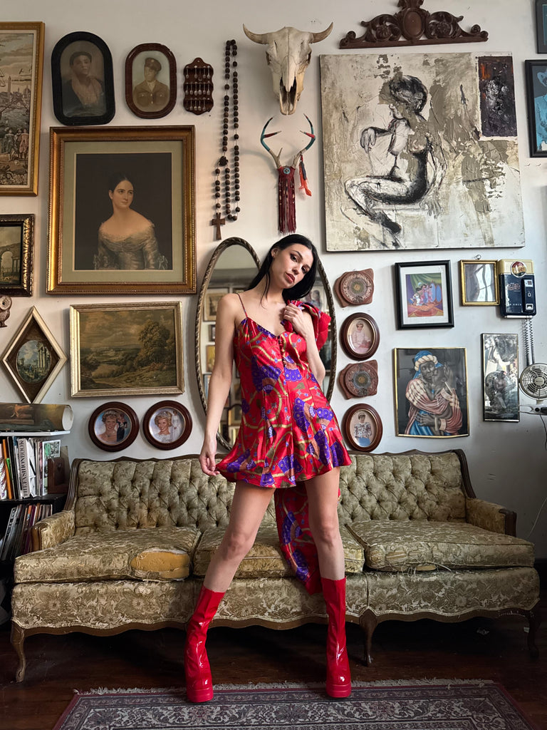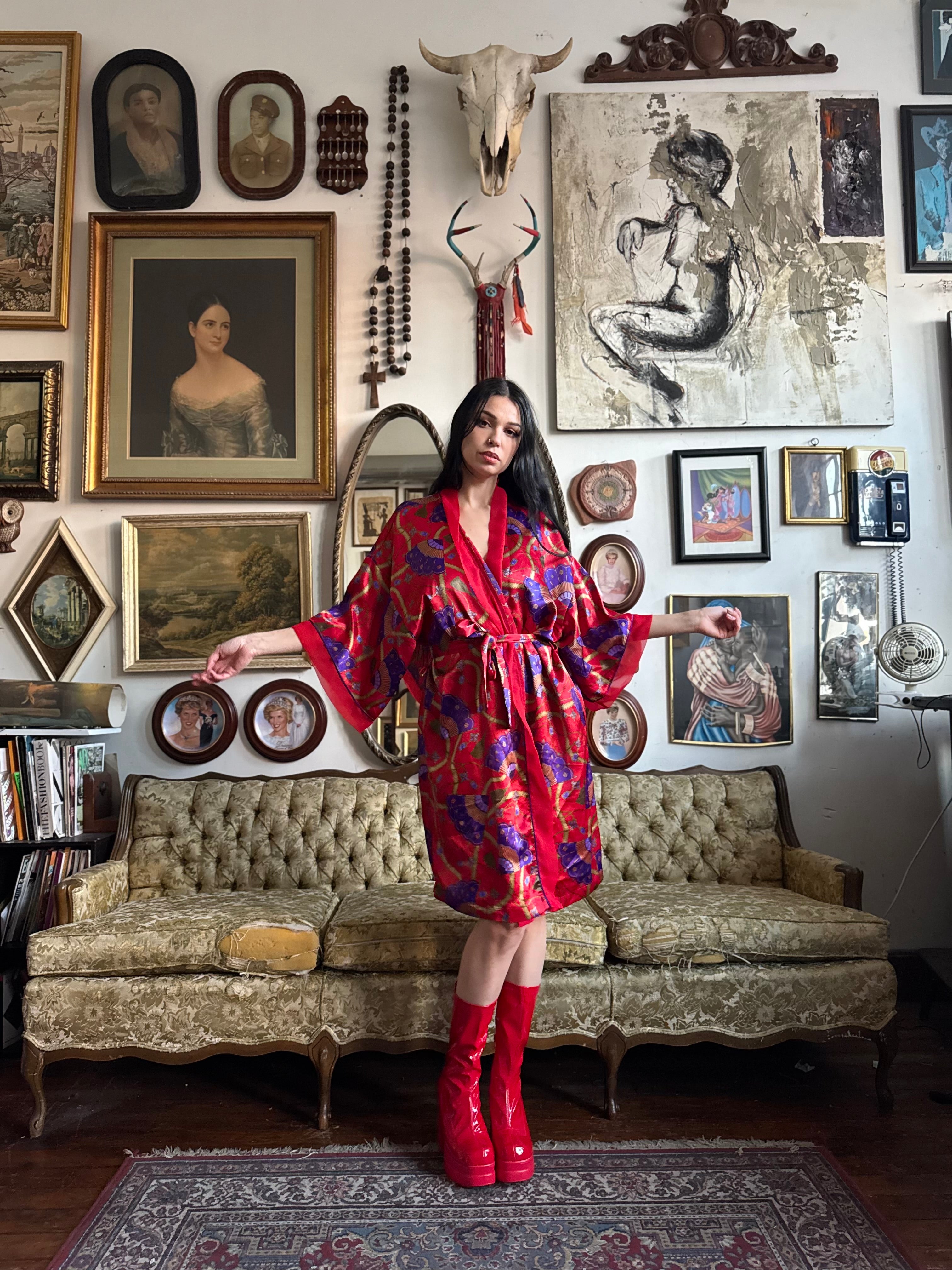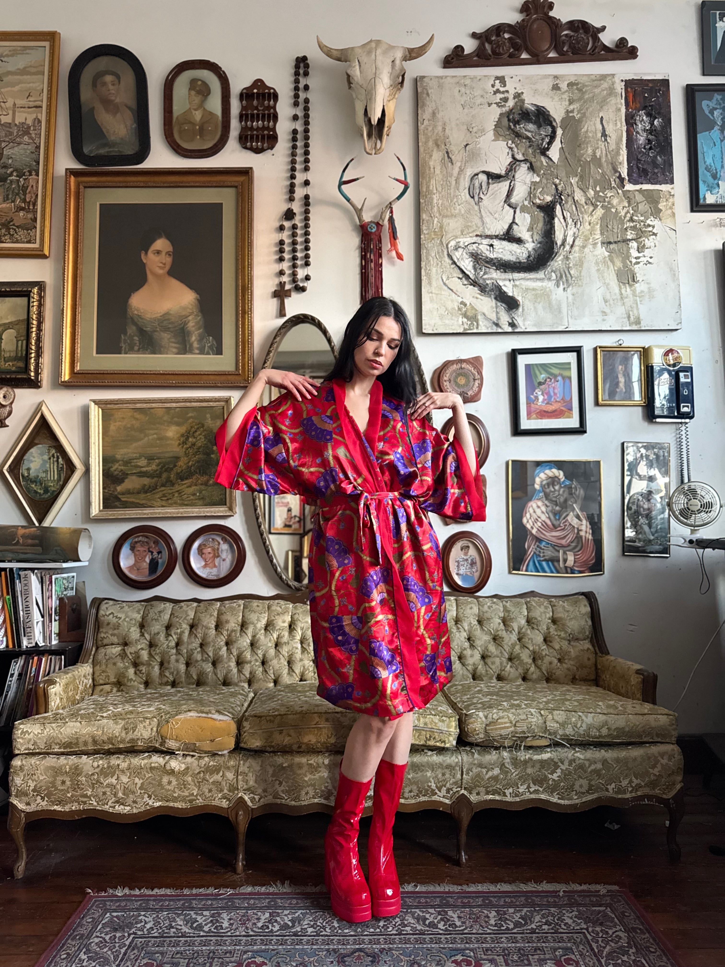 Red and Purple Fan Print Rode and Slip Dress Set Size L