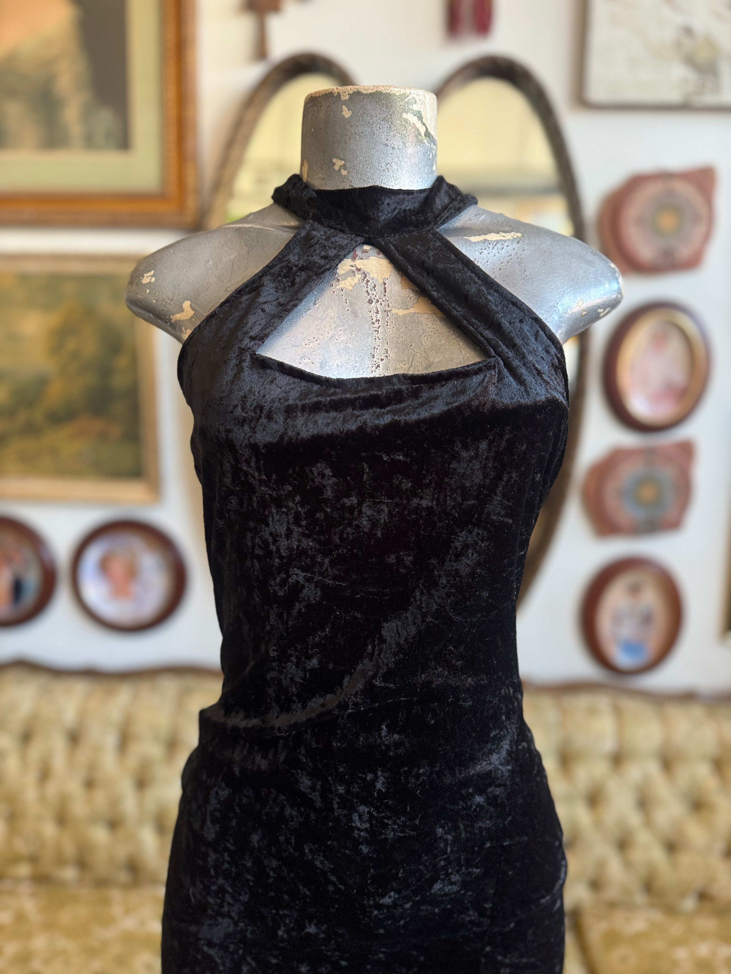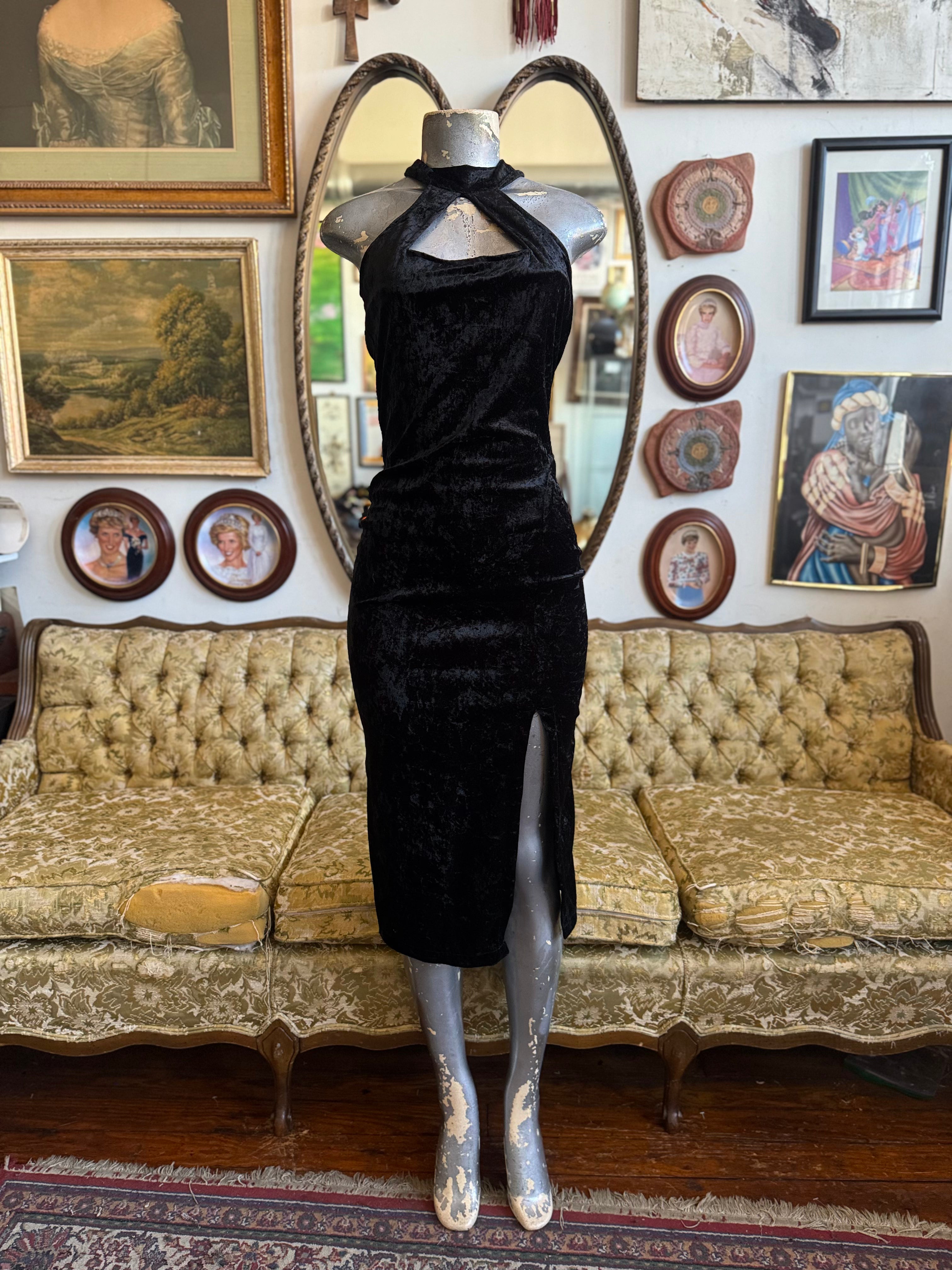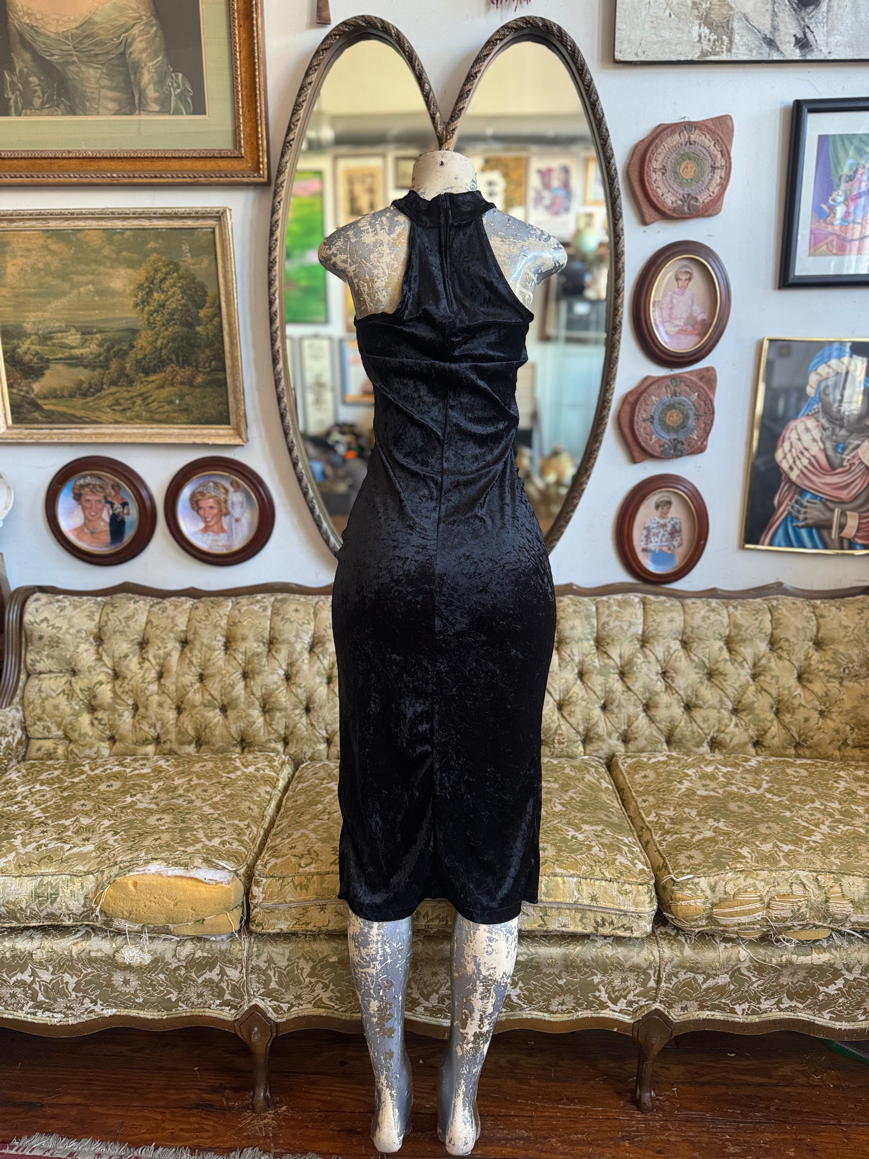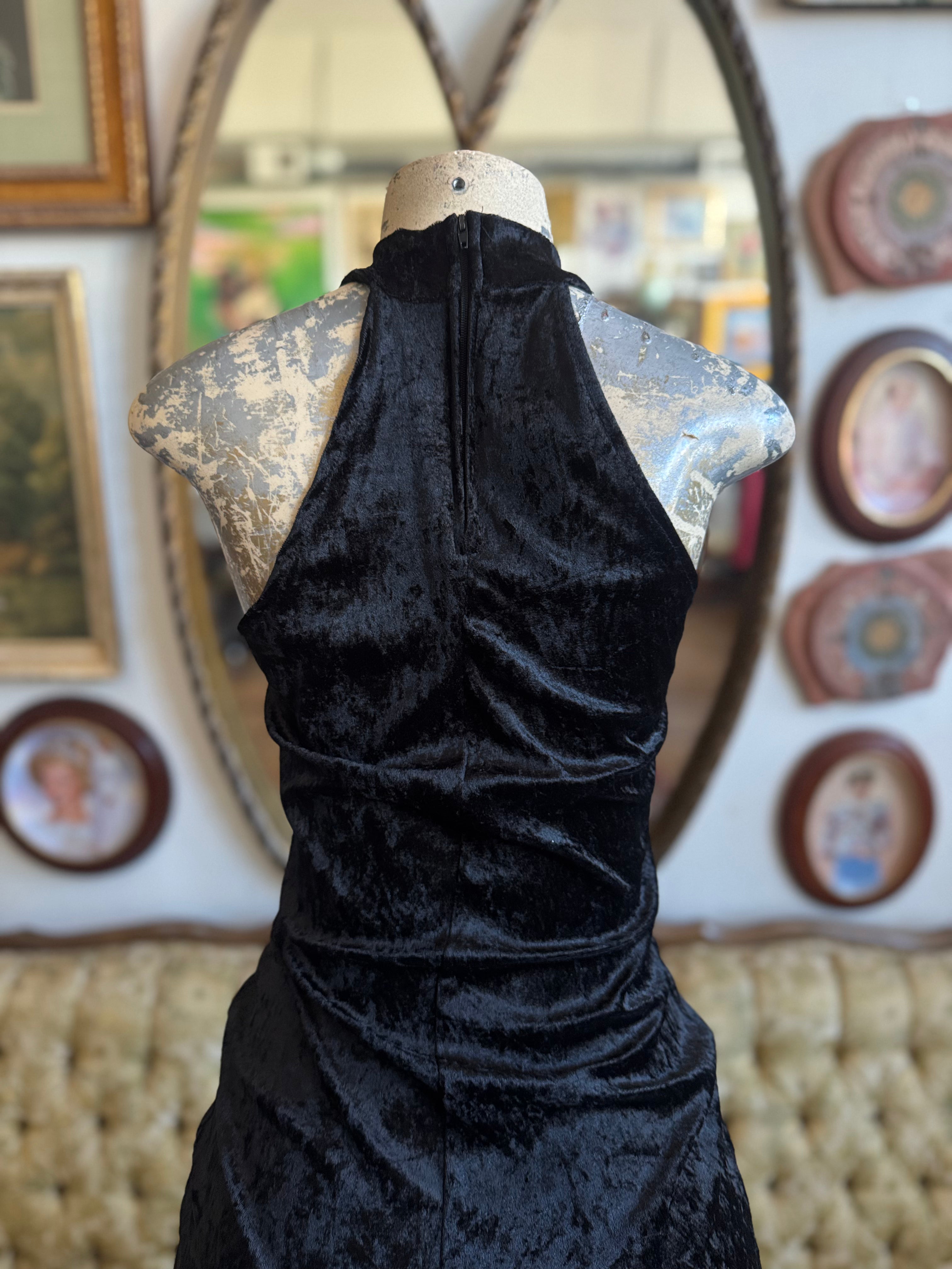 Description: Vintage Crushed Velvet High Neck Dress. Back zipper, high leg slit, and racer back.