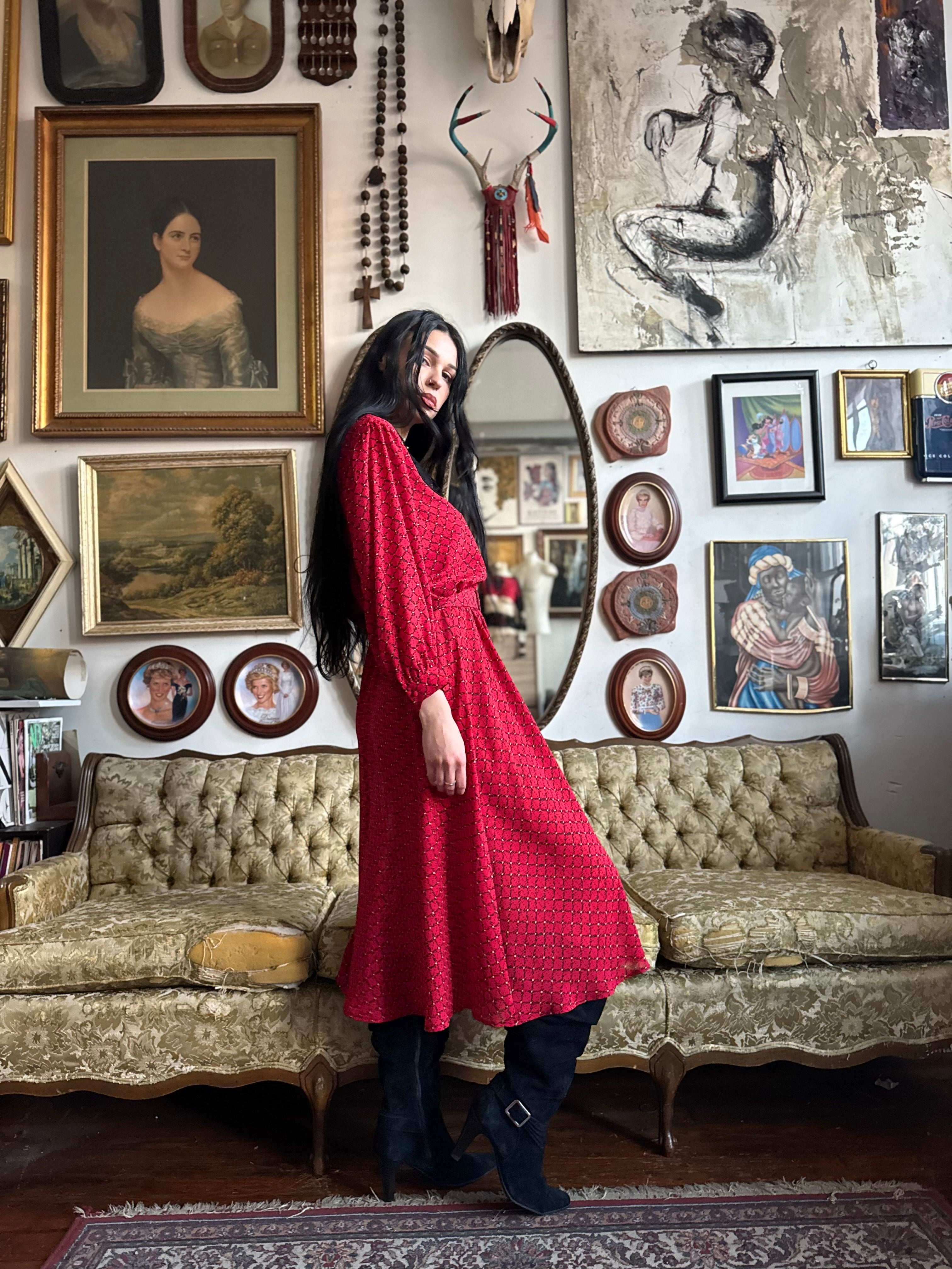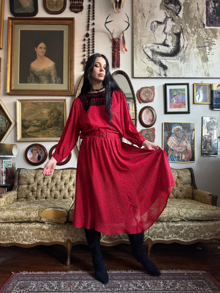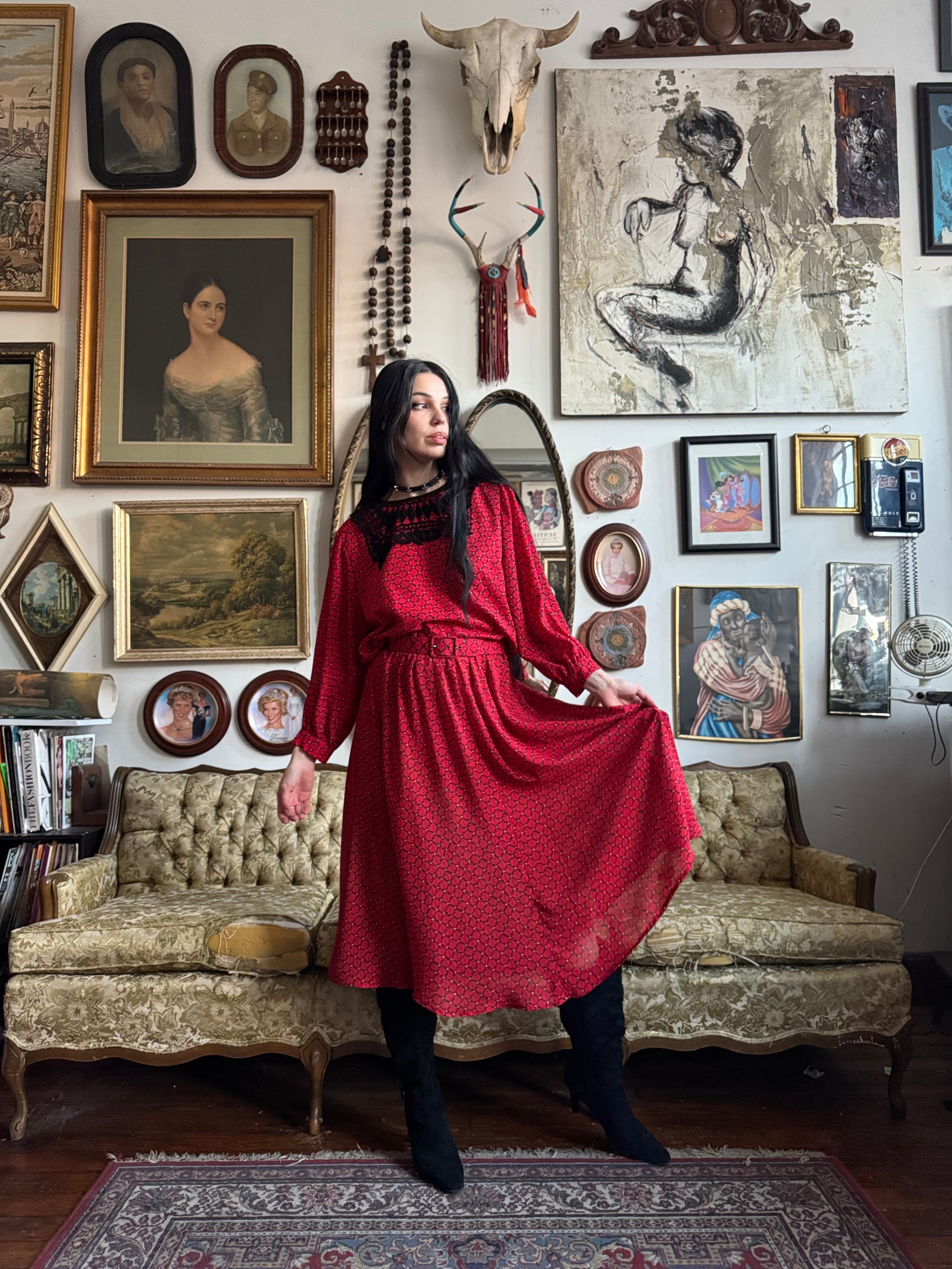 Saint of Goodwill Vintage 70s Red Prairie Dress w Lace Collar & Matching Belt Size 8