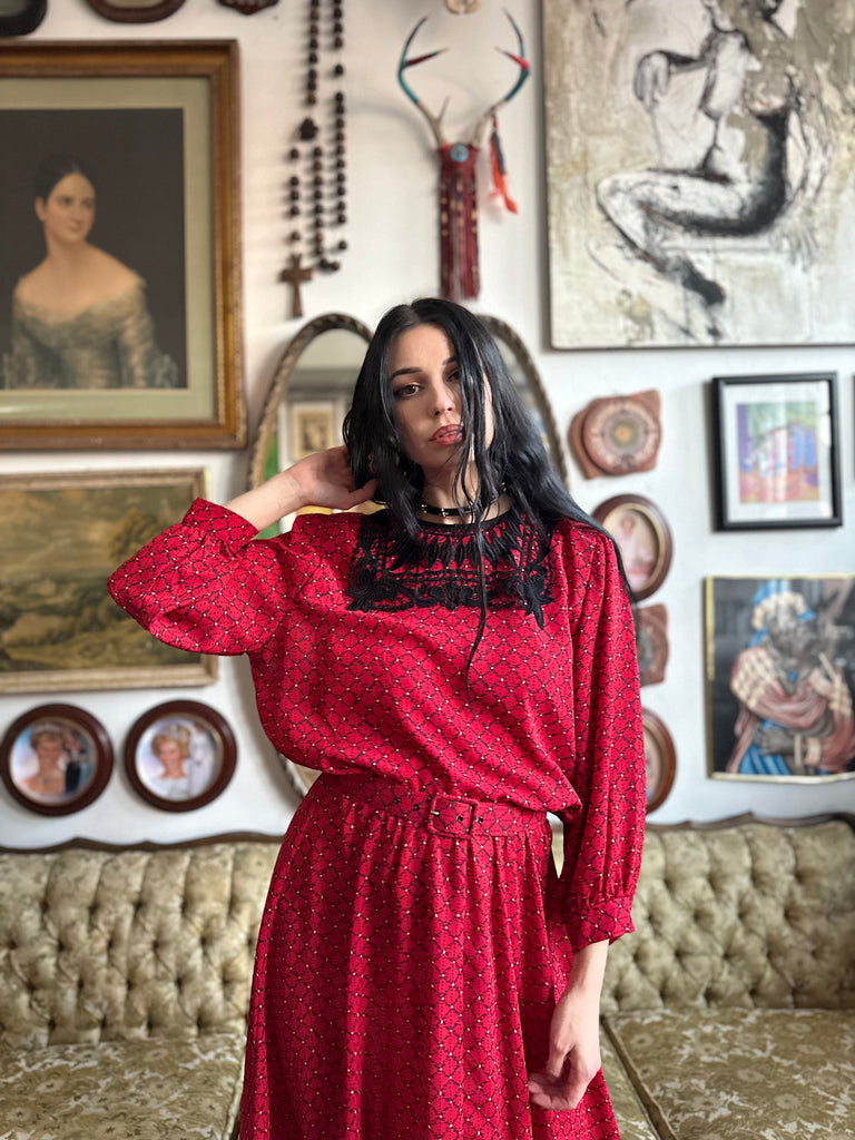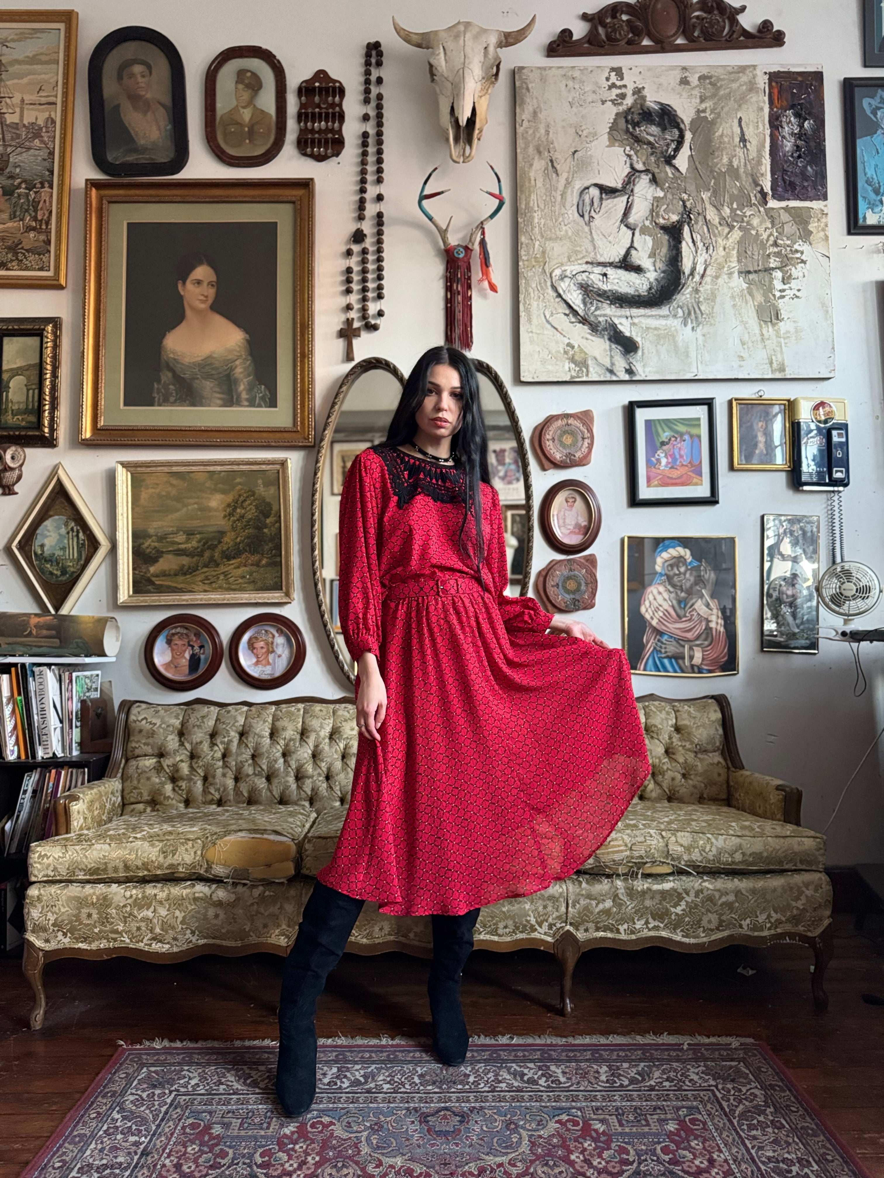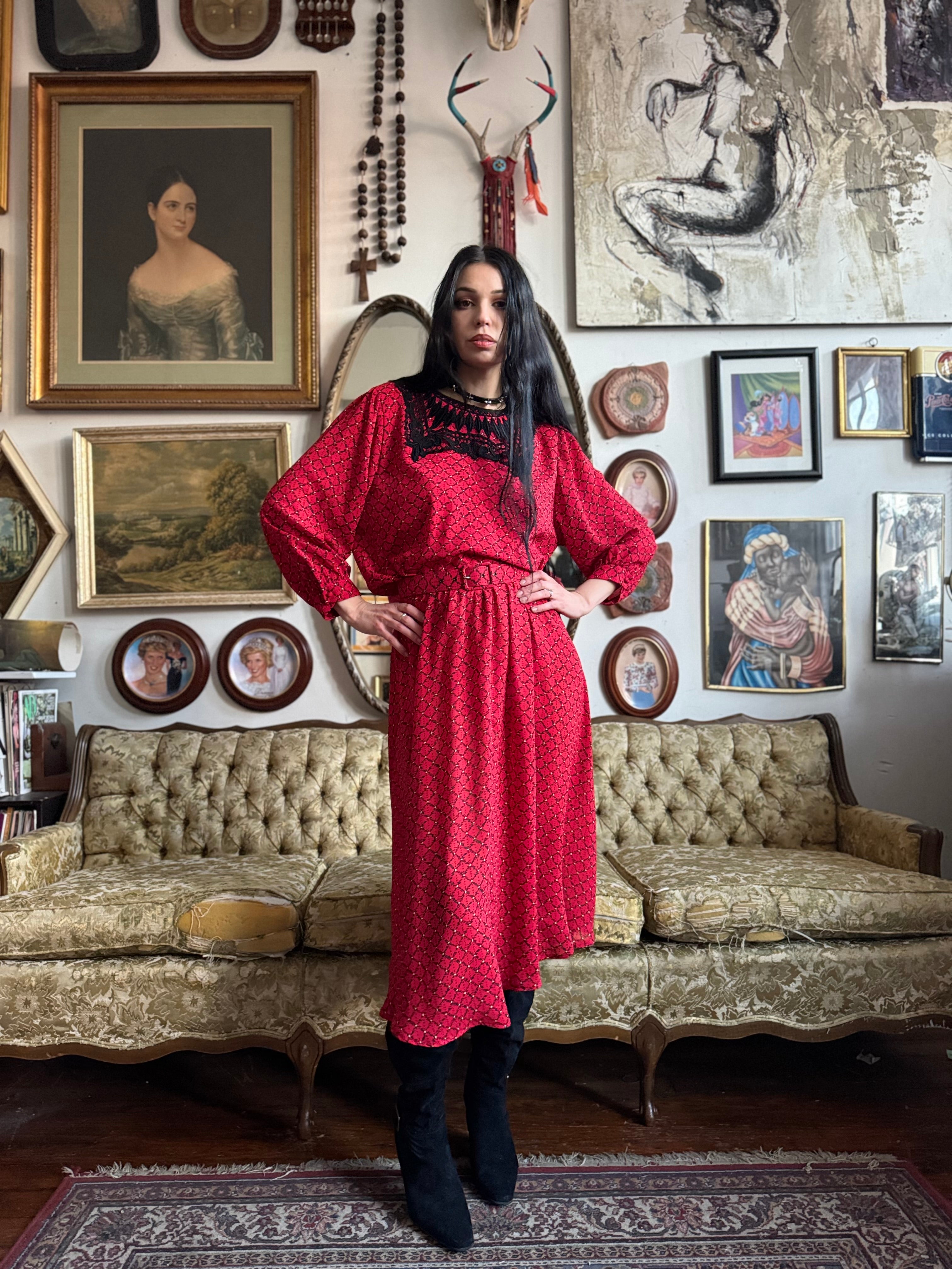 Vintage 70s Red Prairie Dress w Lace Collar & Matching Belt Size 8