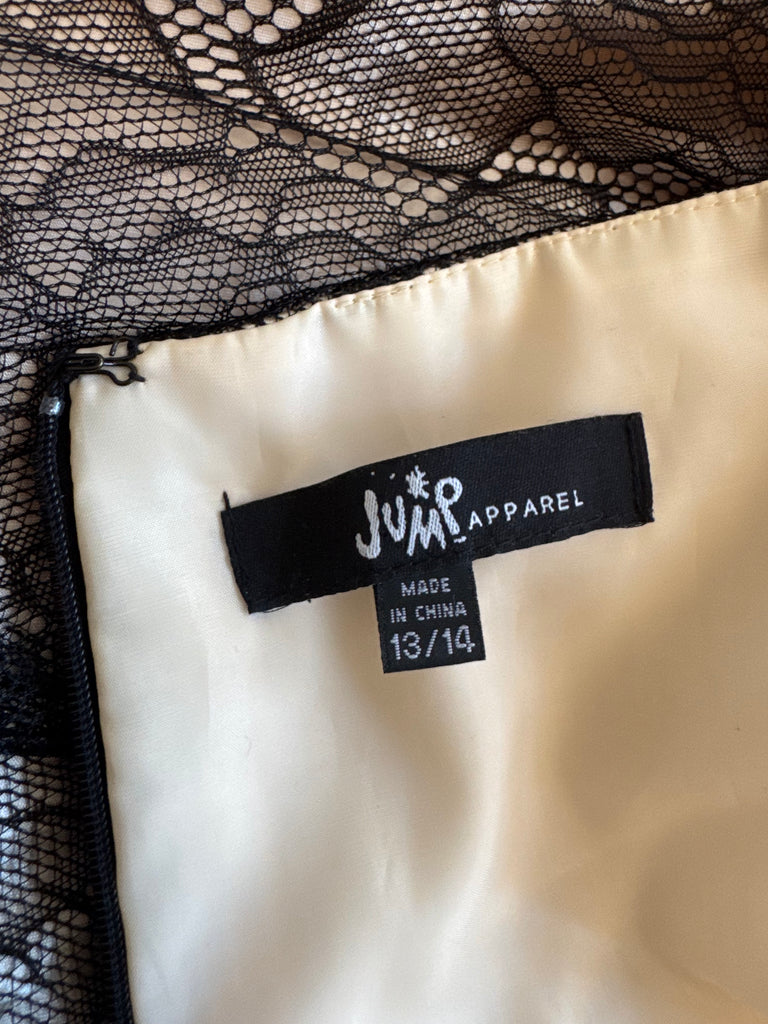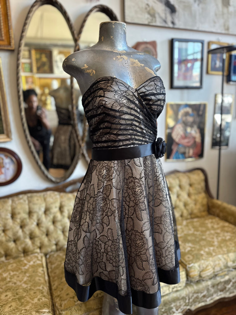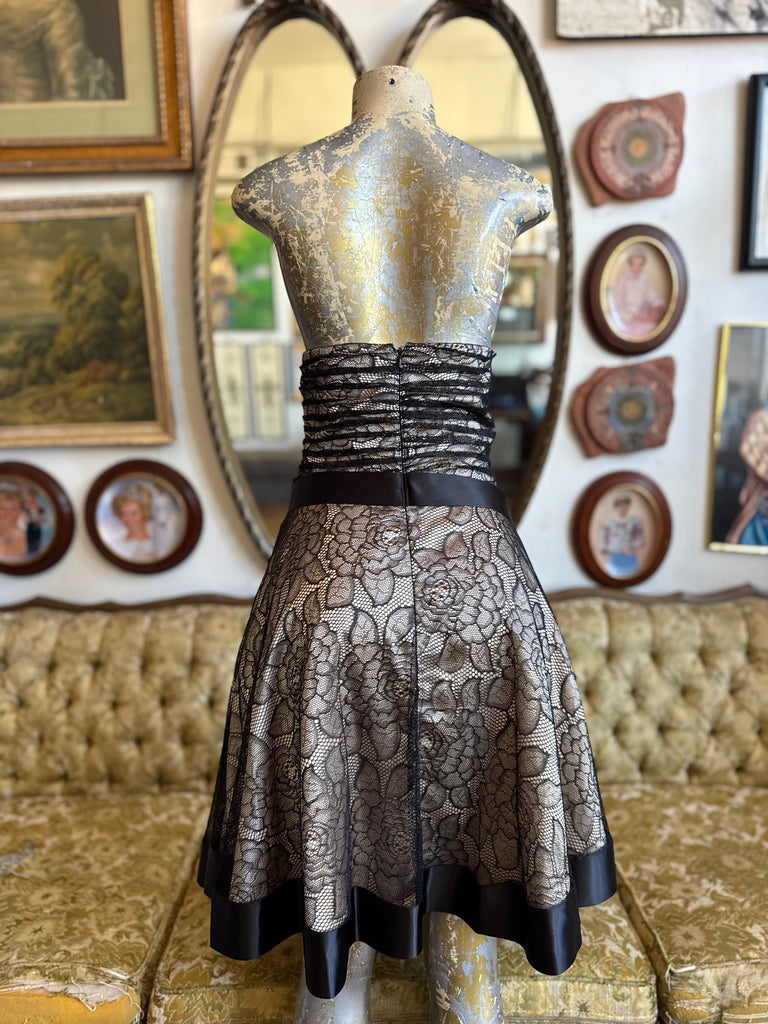 Black and Beige Lace Cocktail Dress w Satin Waist and Pleated Bodice Size 13/14