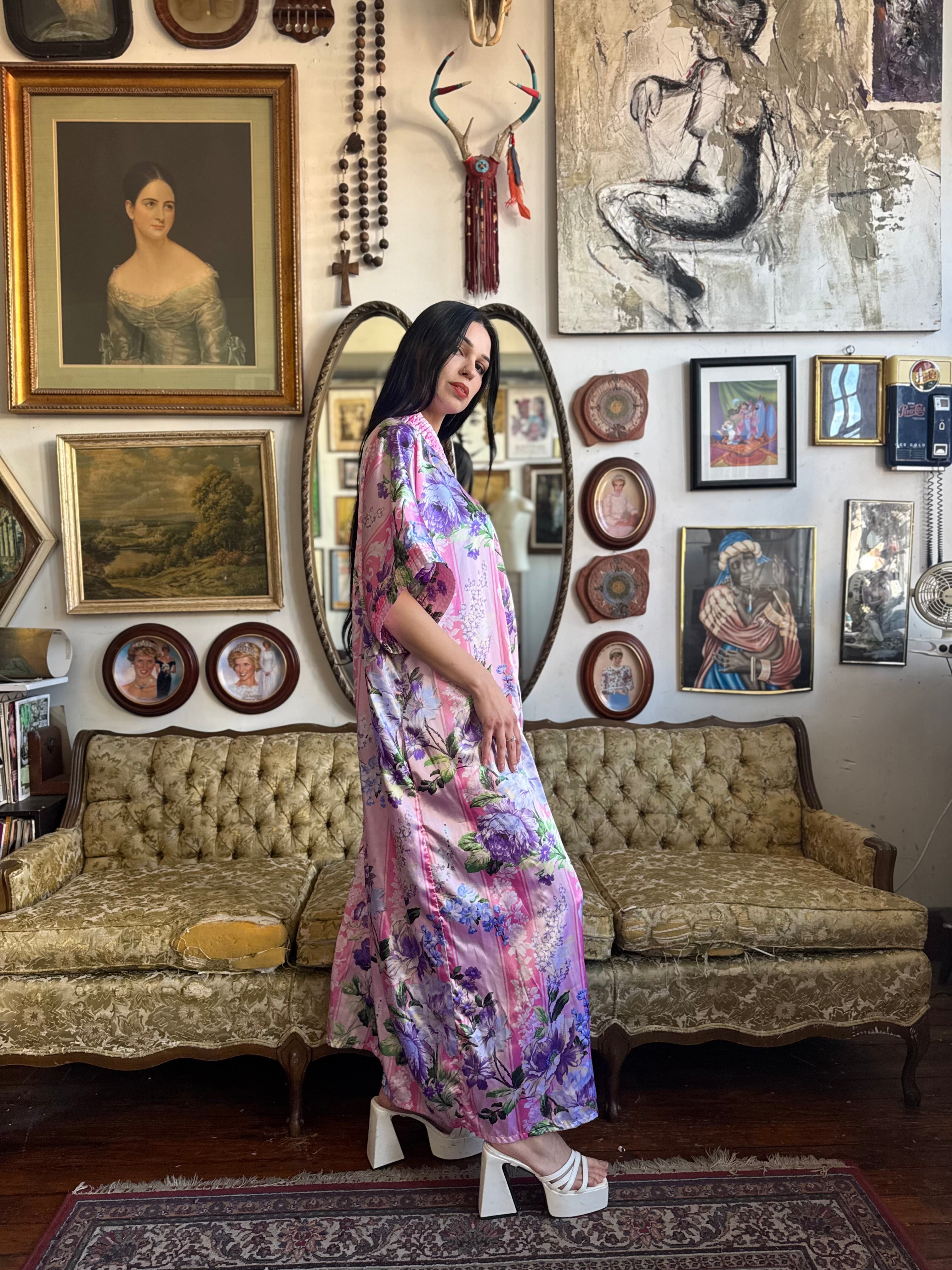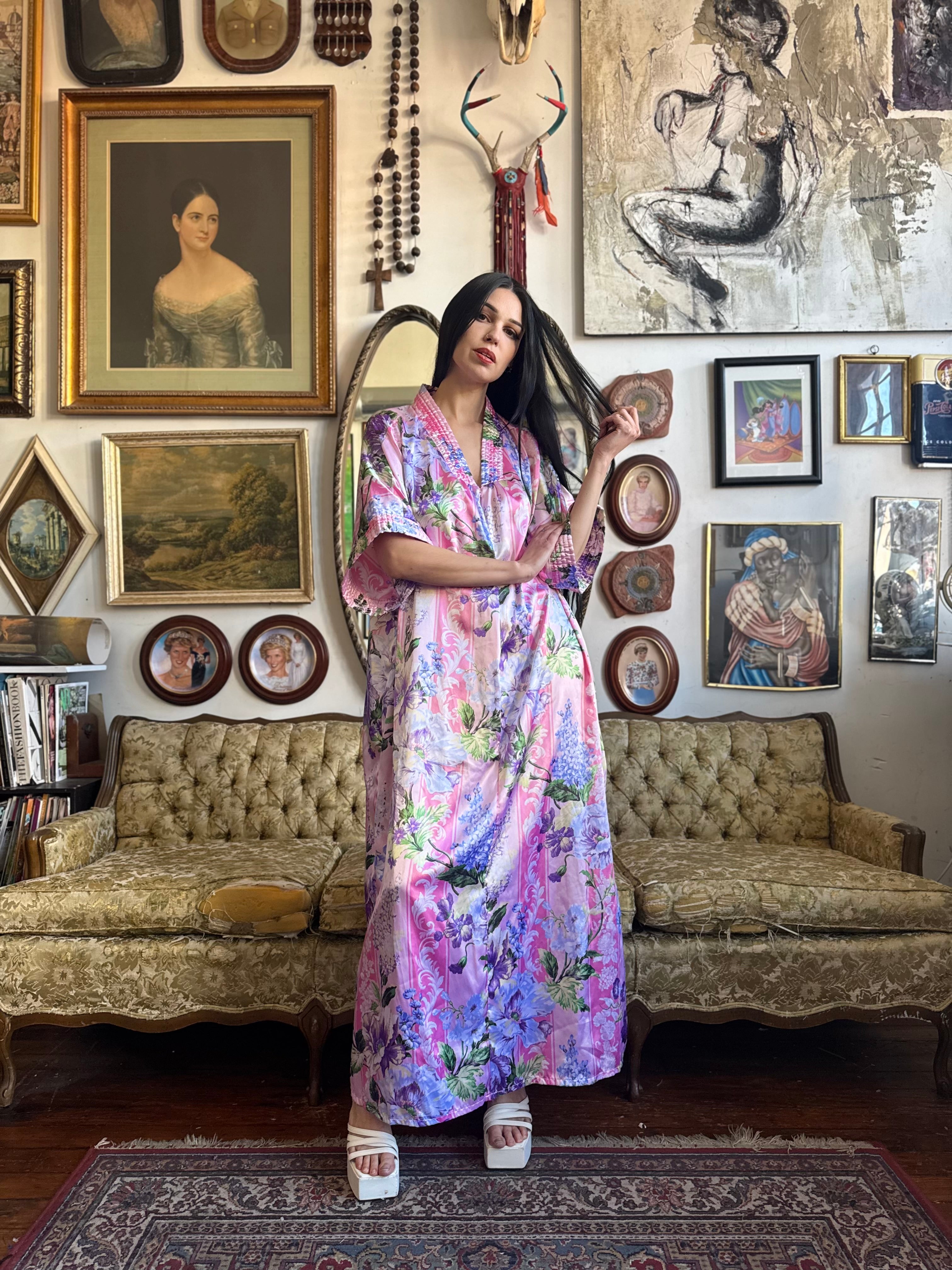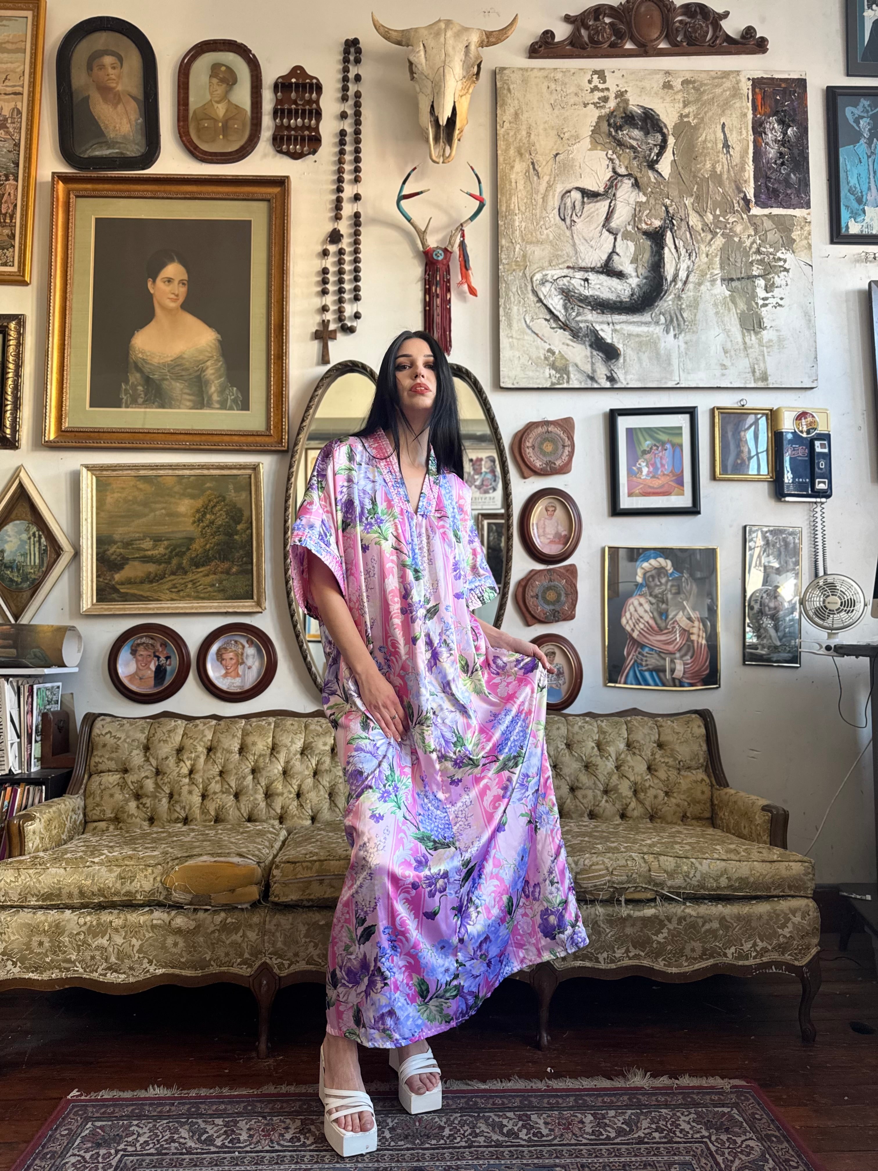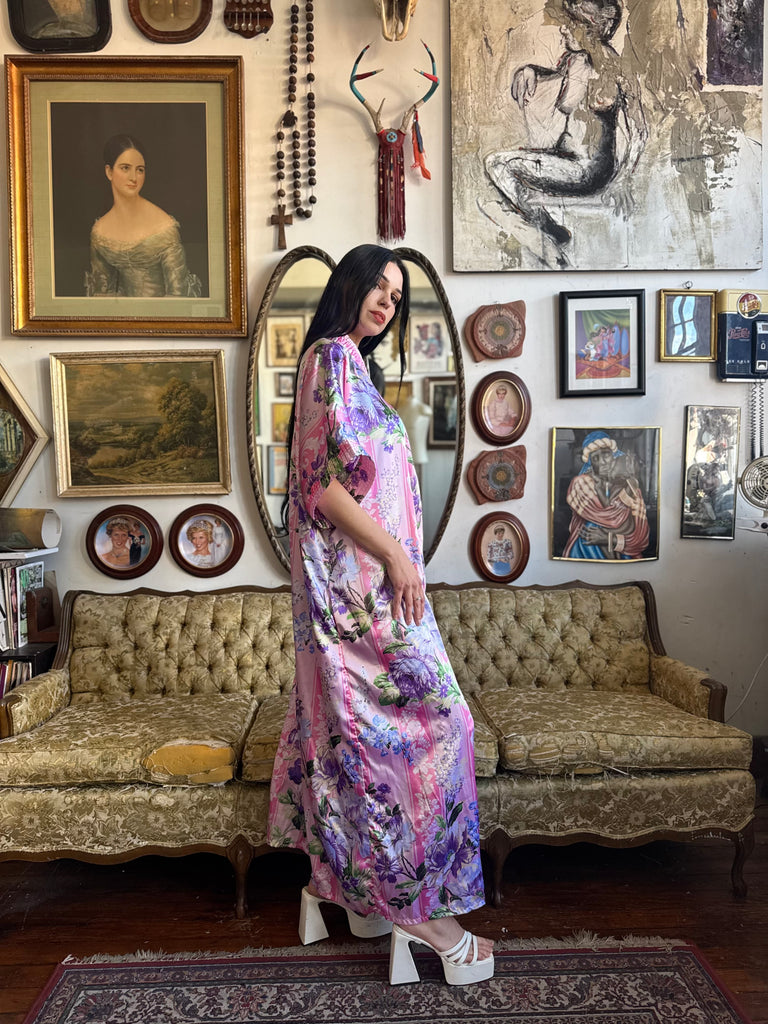 Vintage 90s Floral Print Pink Satin Mumu One Size