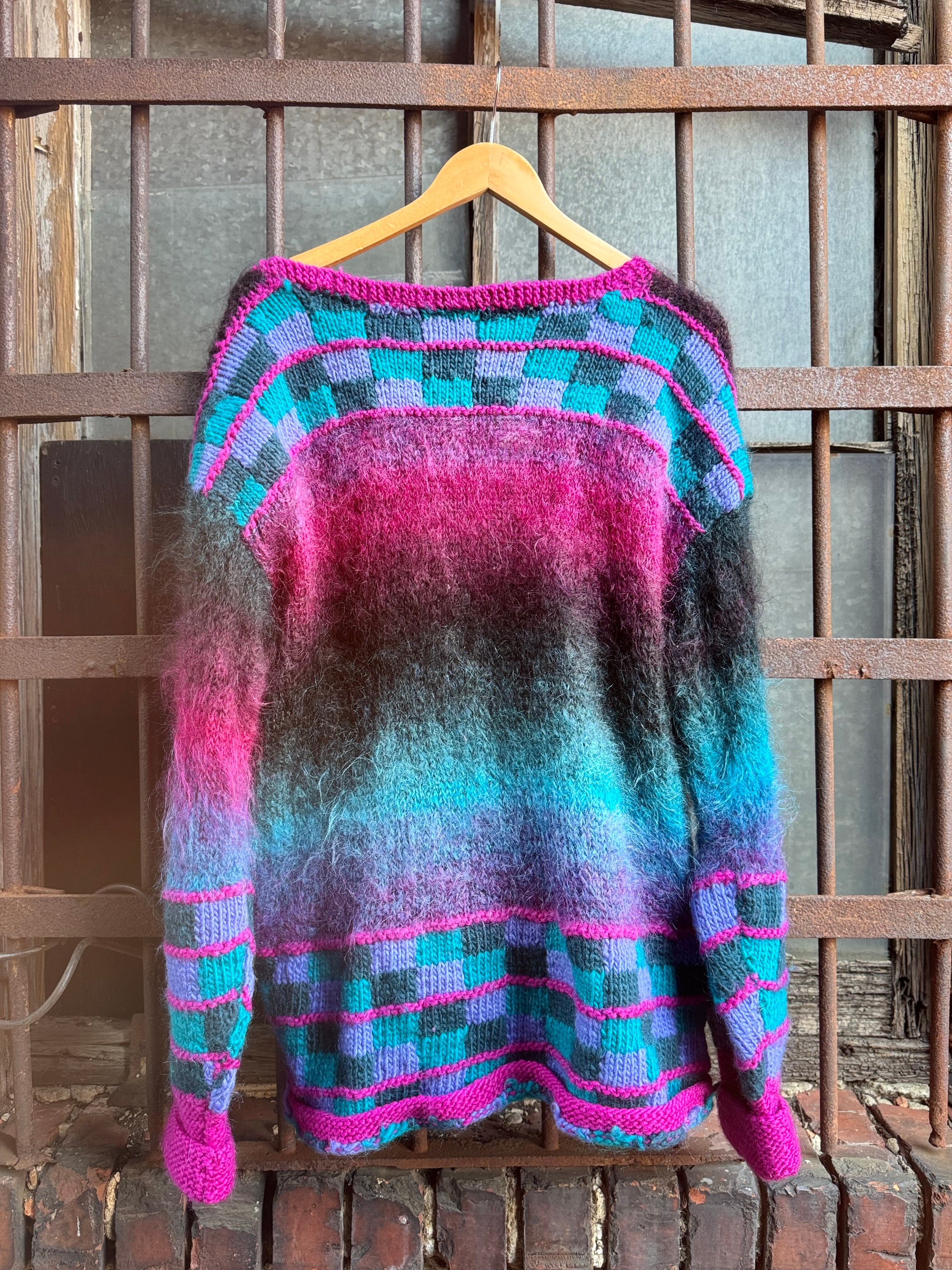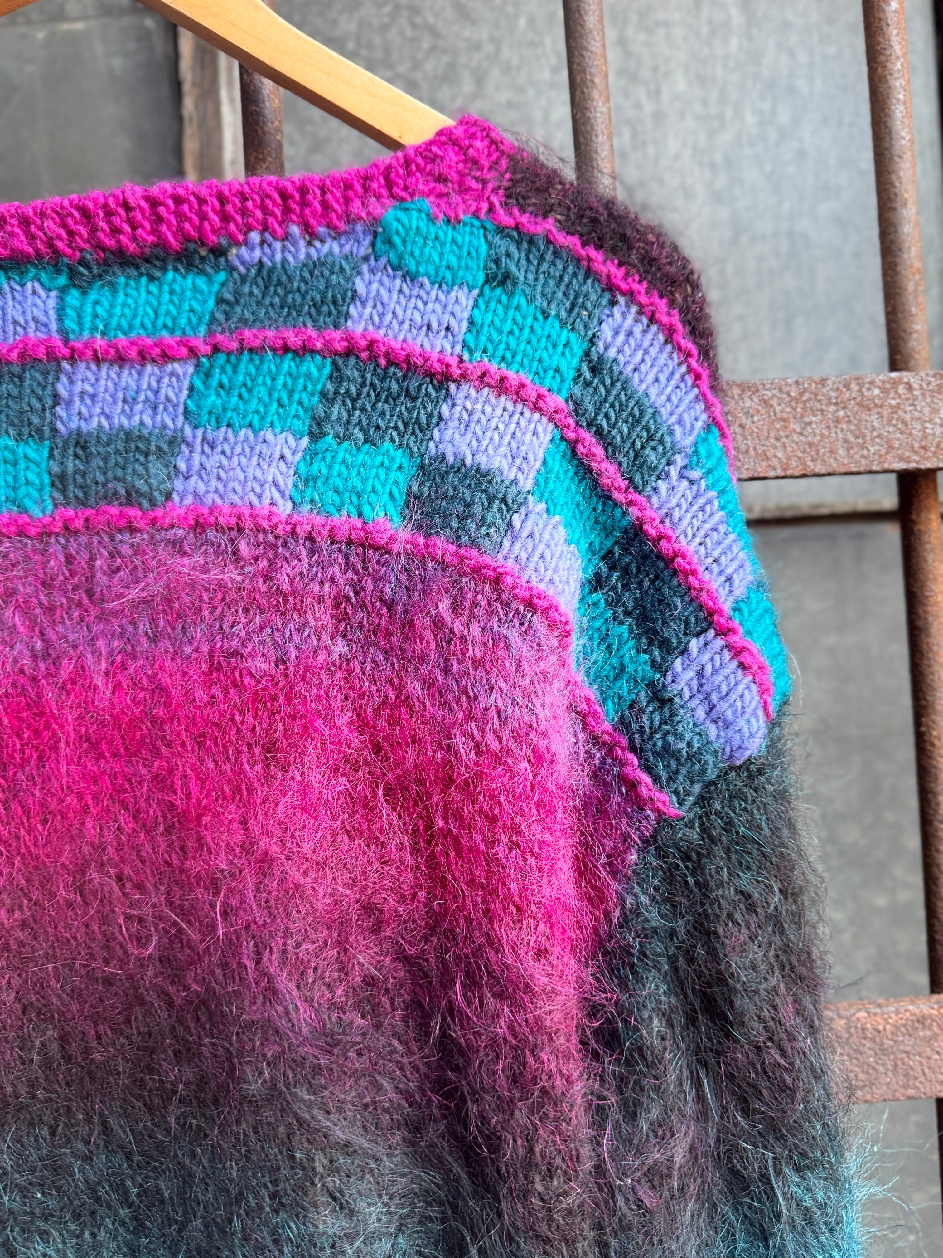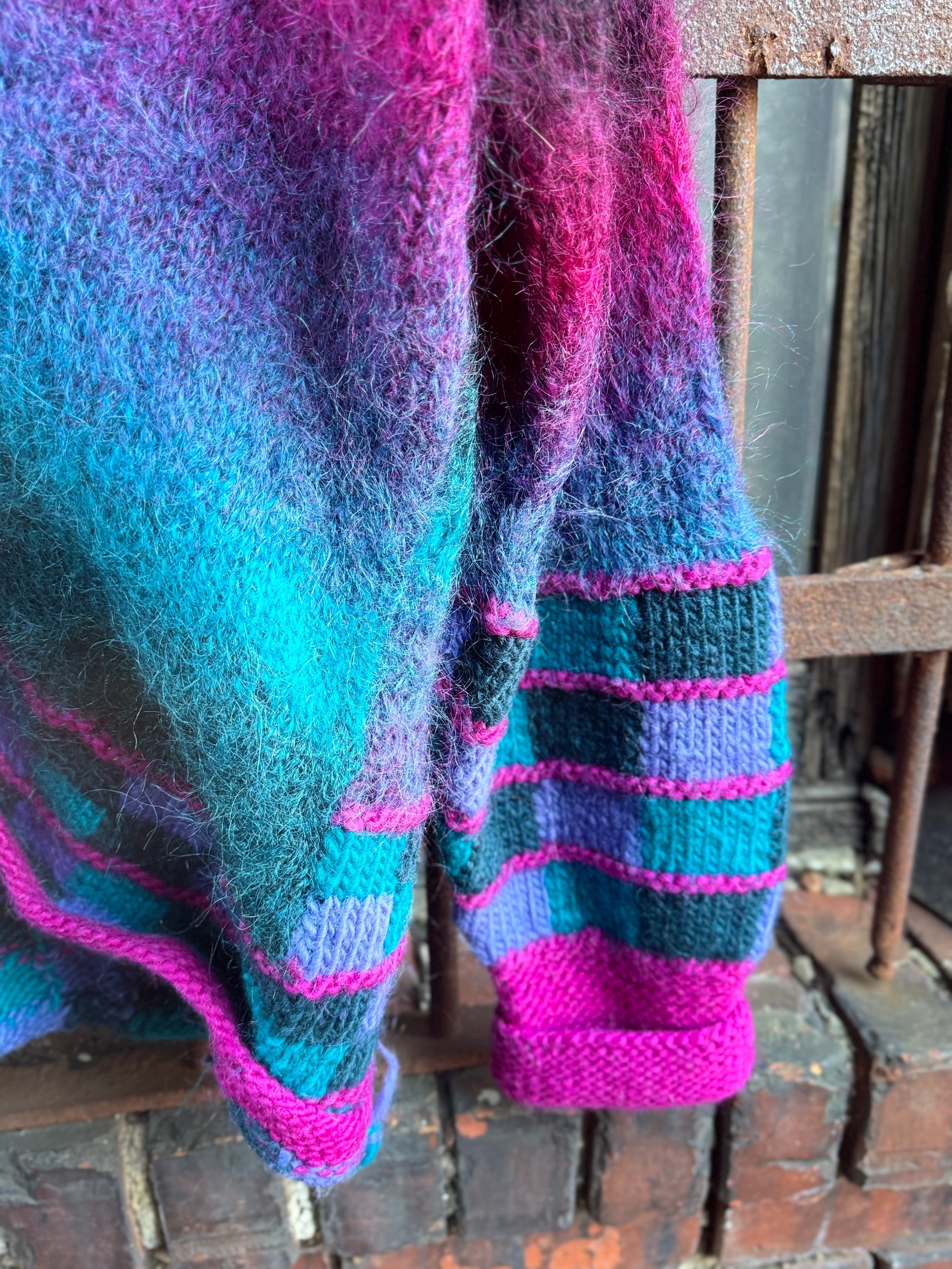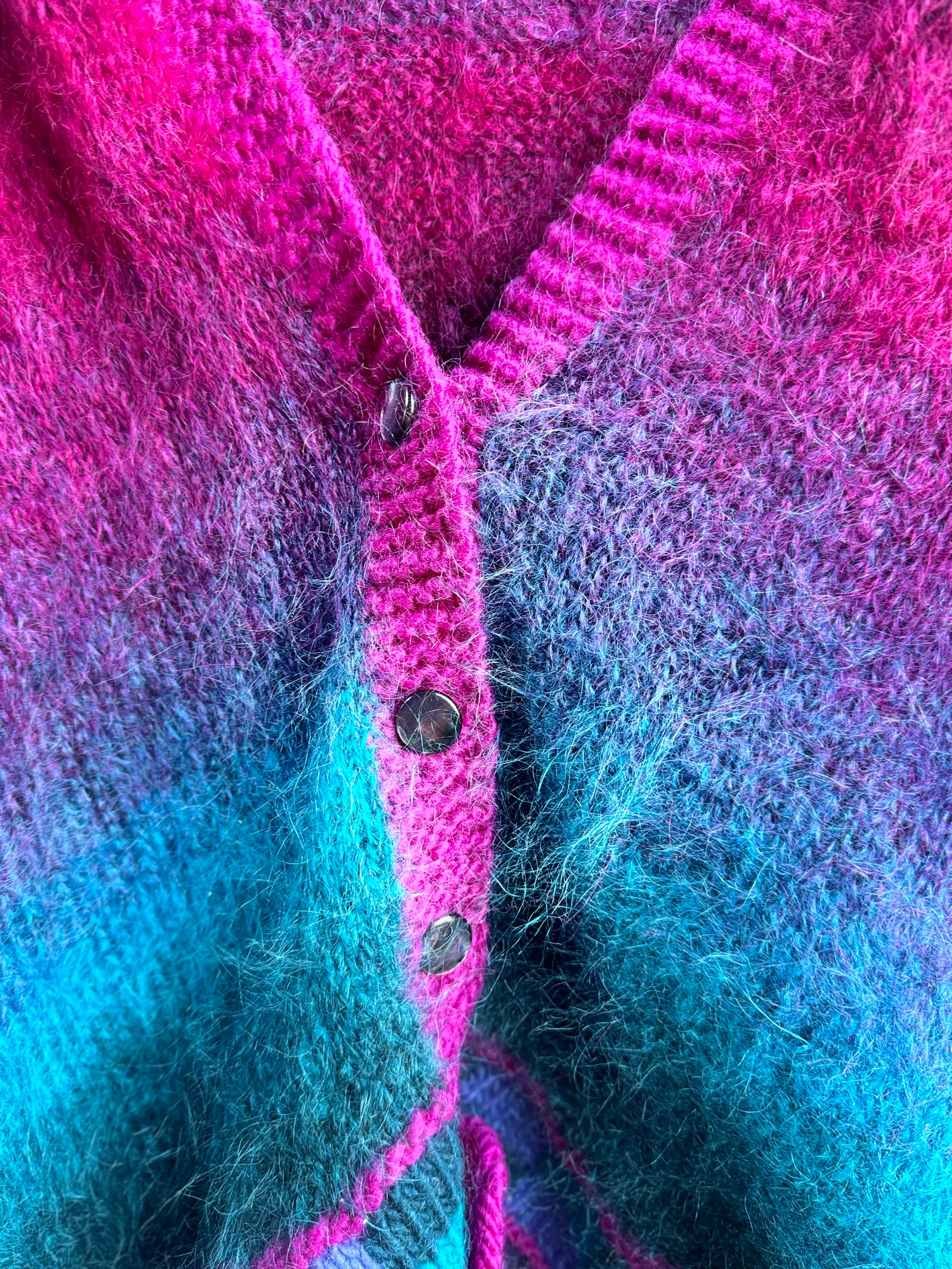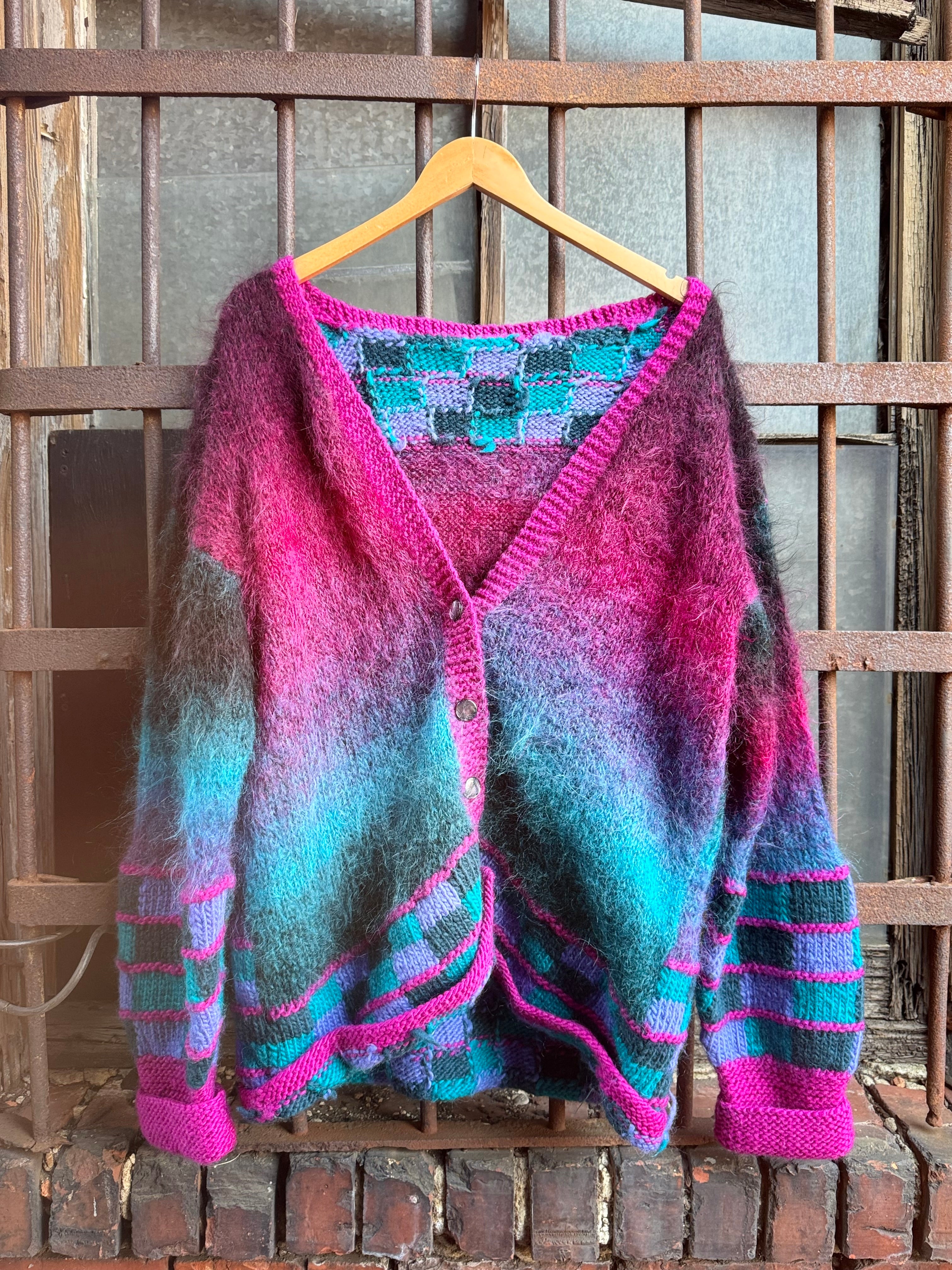 Vintage Handmade Pink and Blue Vibrant Mohair Cardigan Sweater Ladies Size 2X