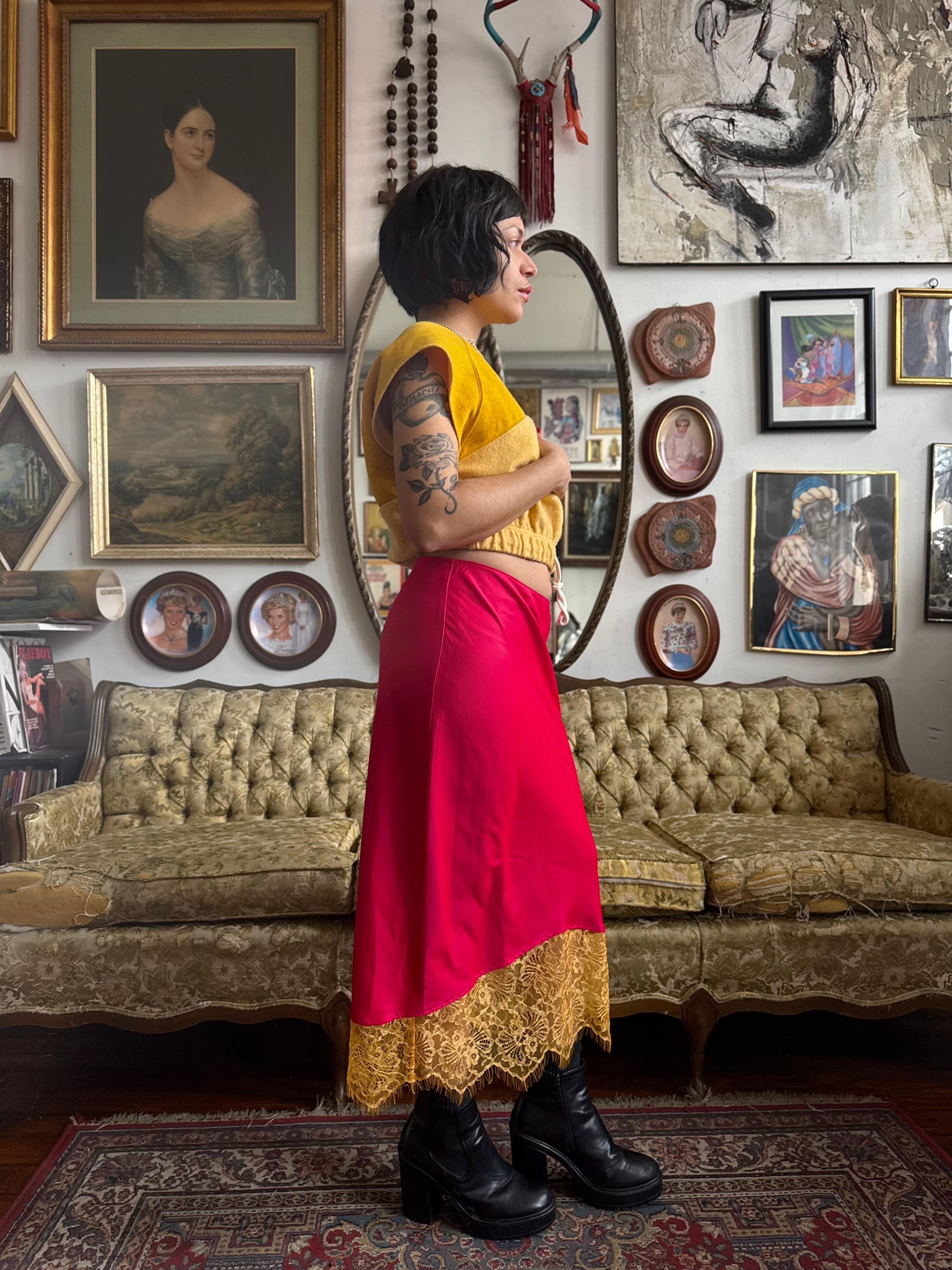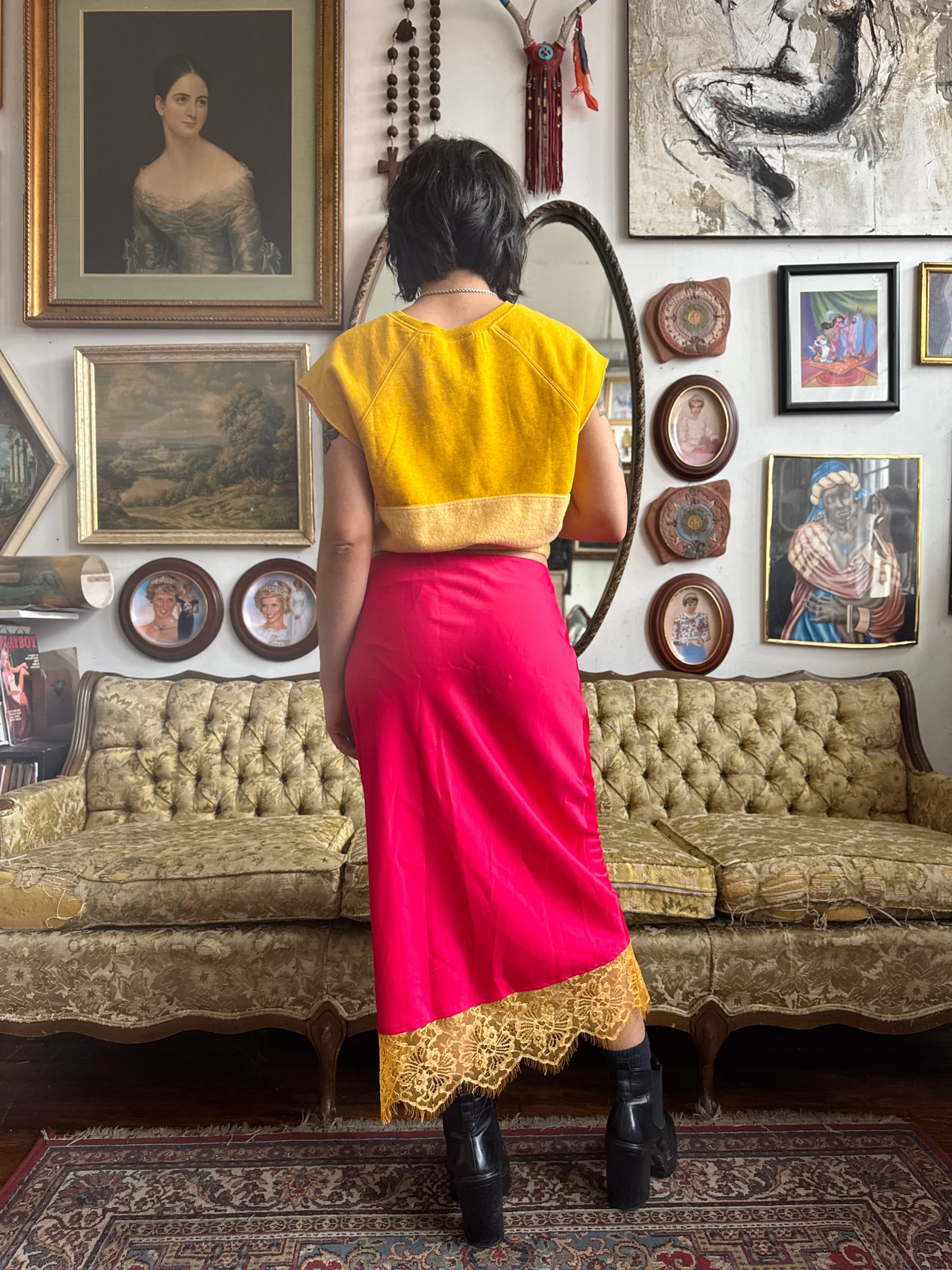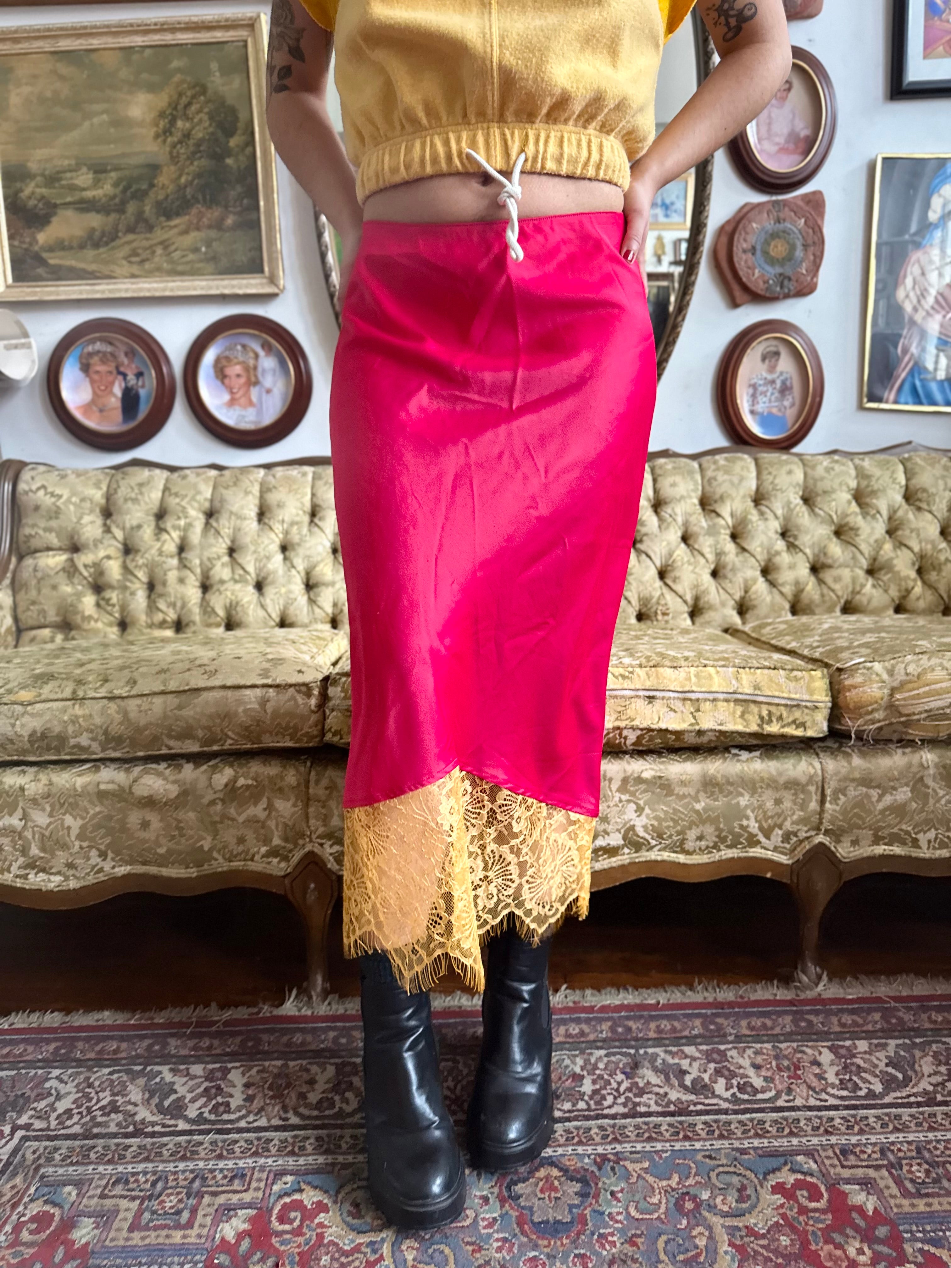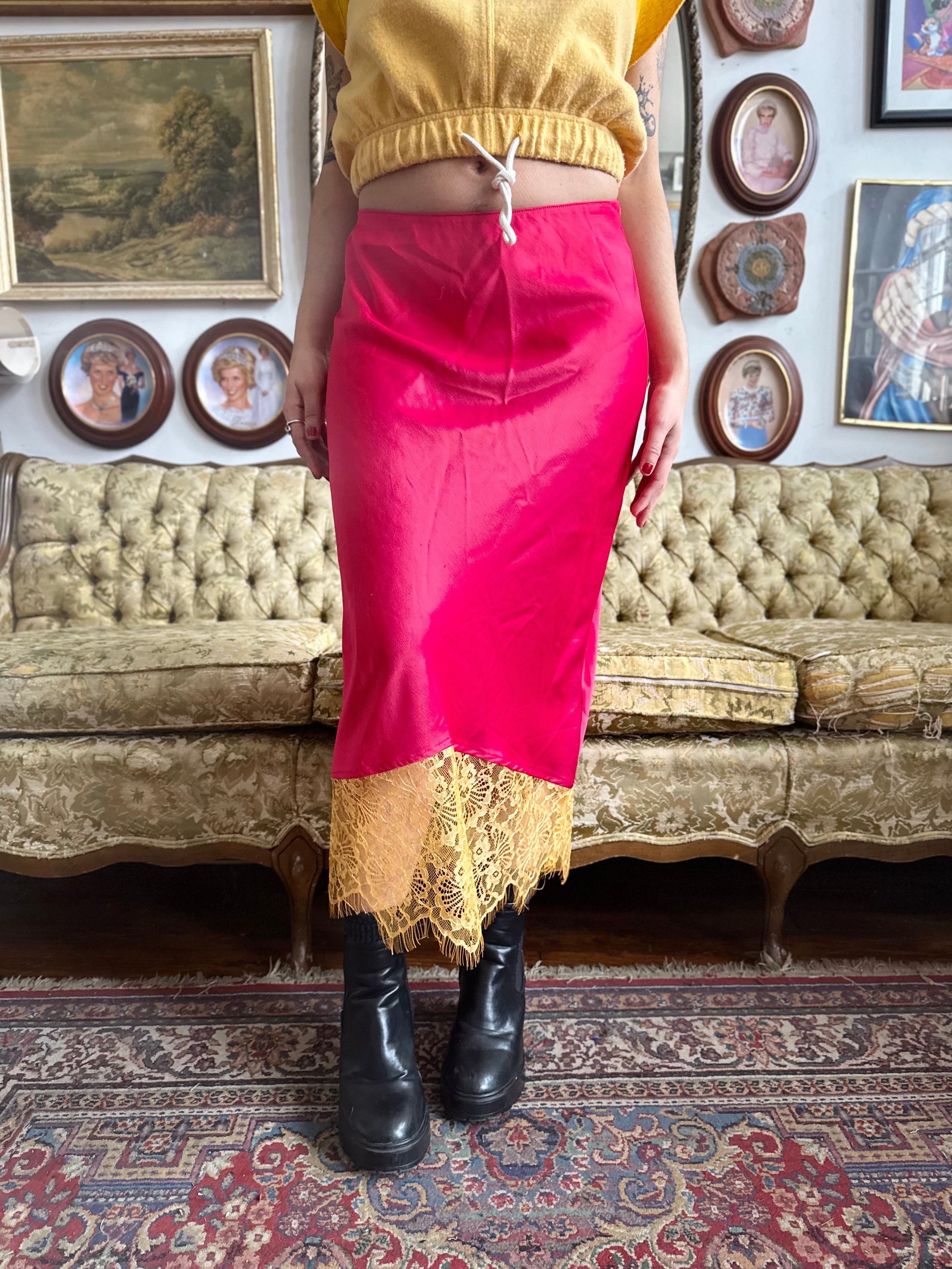 Urban Outfitters Magenta Satin Midi Skirt w Yellow Lace Trim Size M
