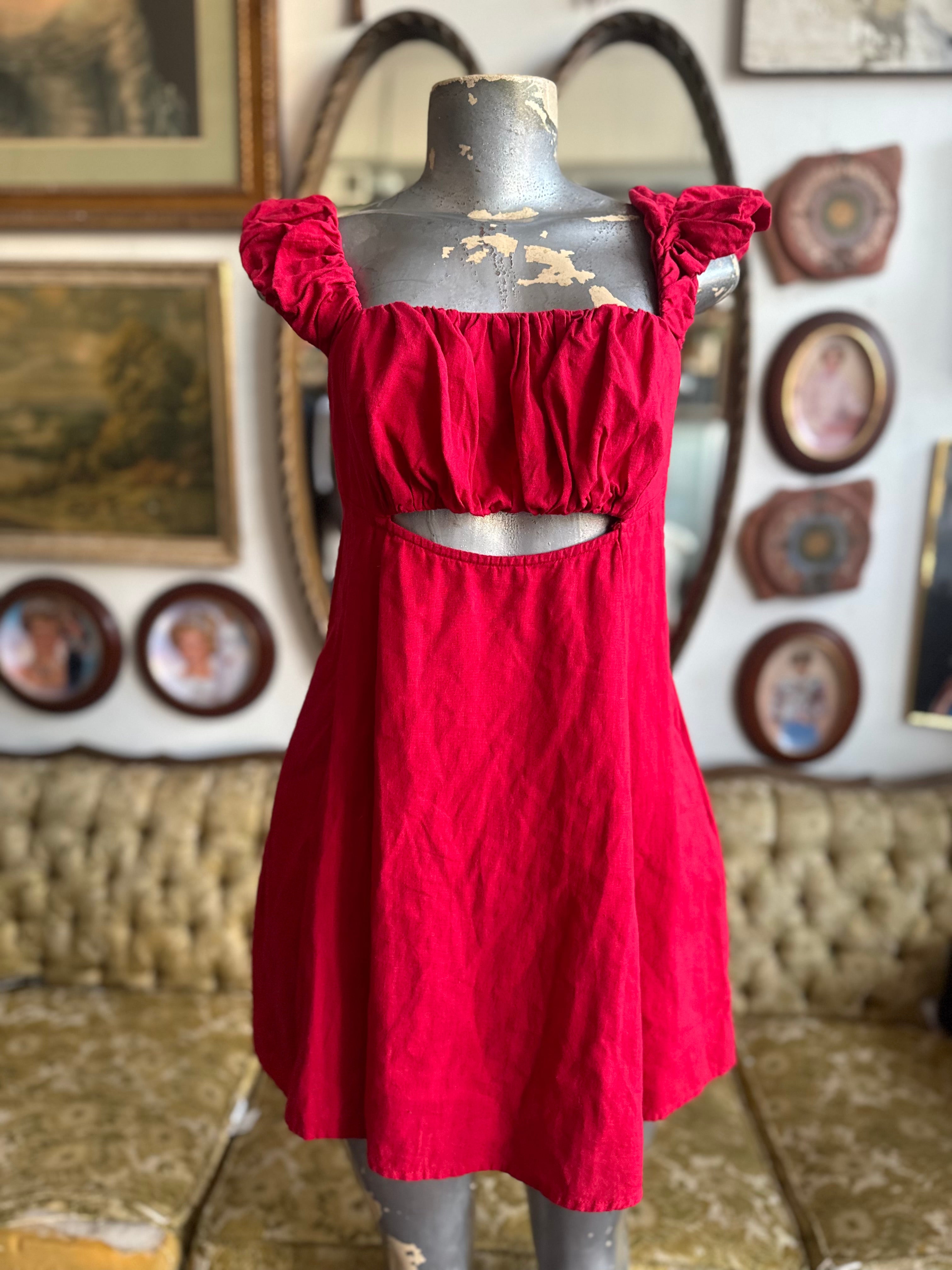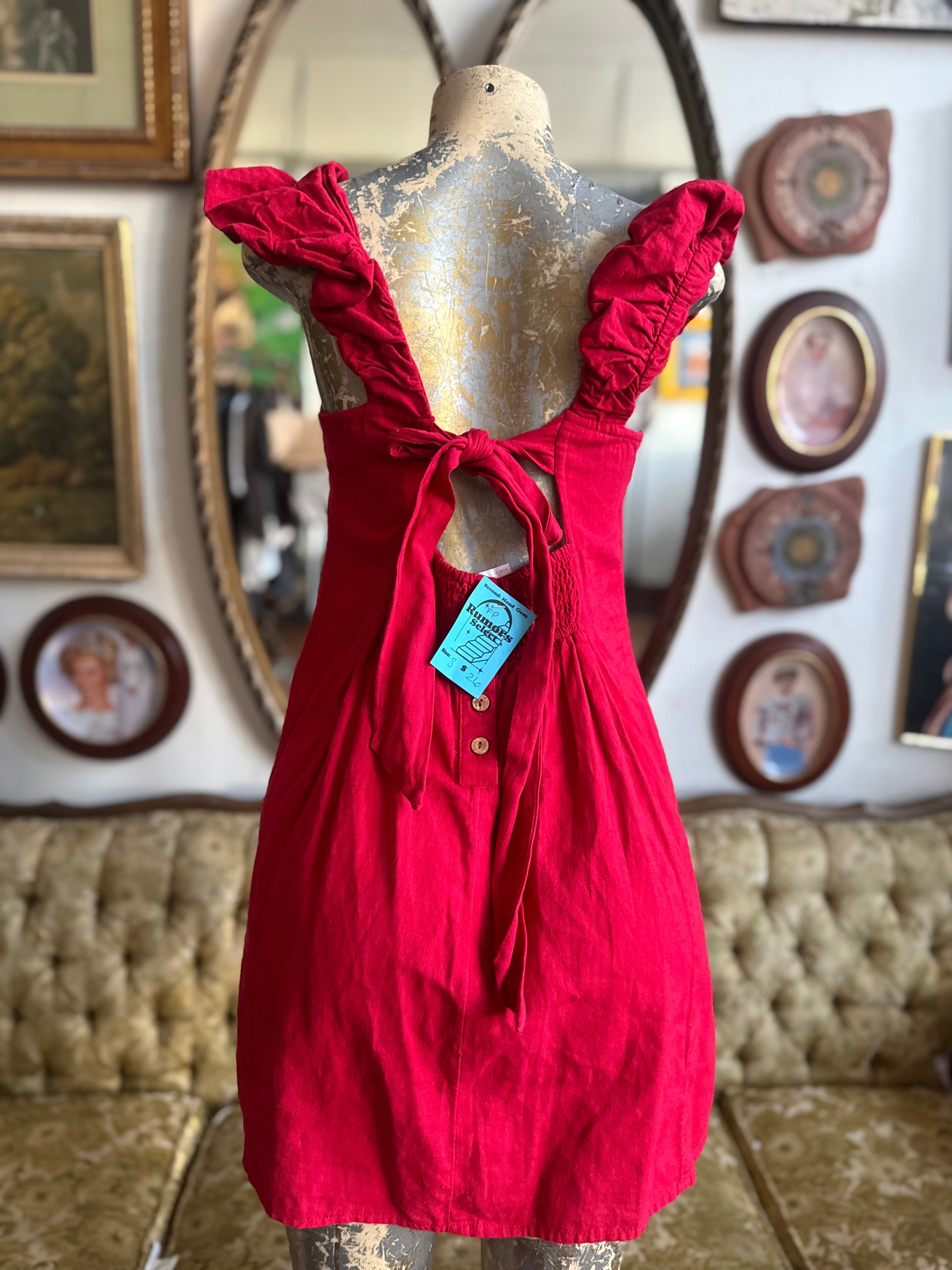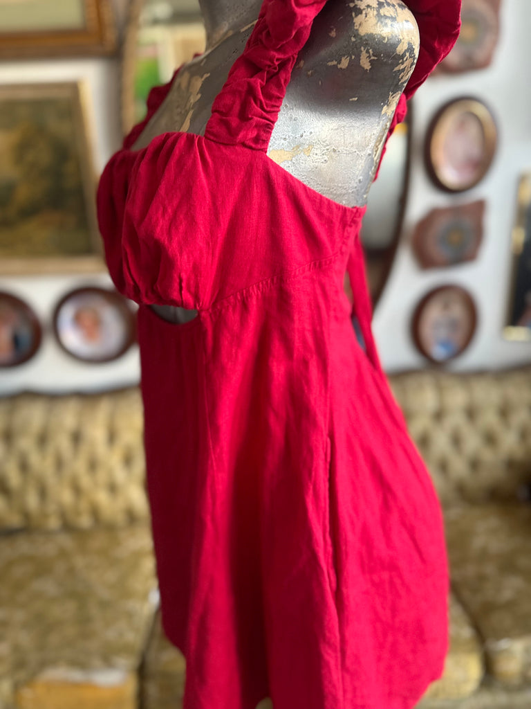 Info: Free People Red Babydoll Dress featuring Puff Sleeves, Ruched Back with Button Closures and Ties