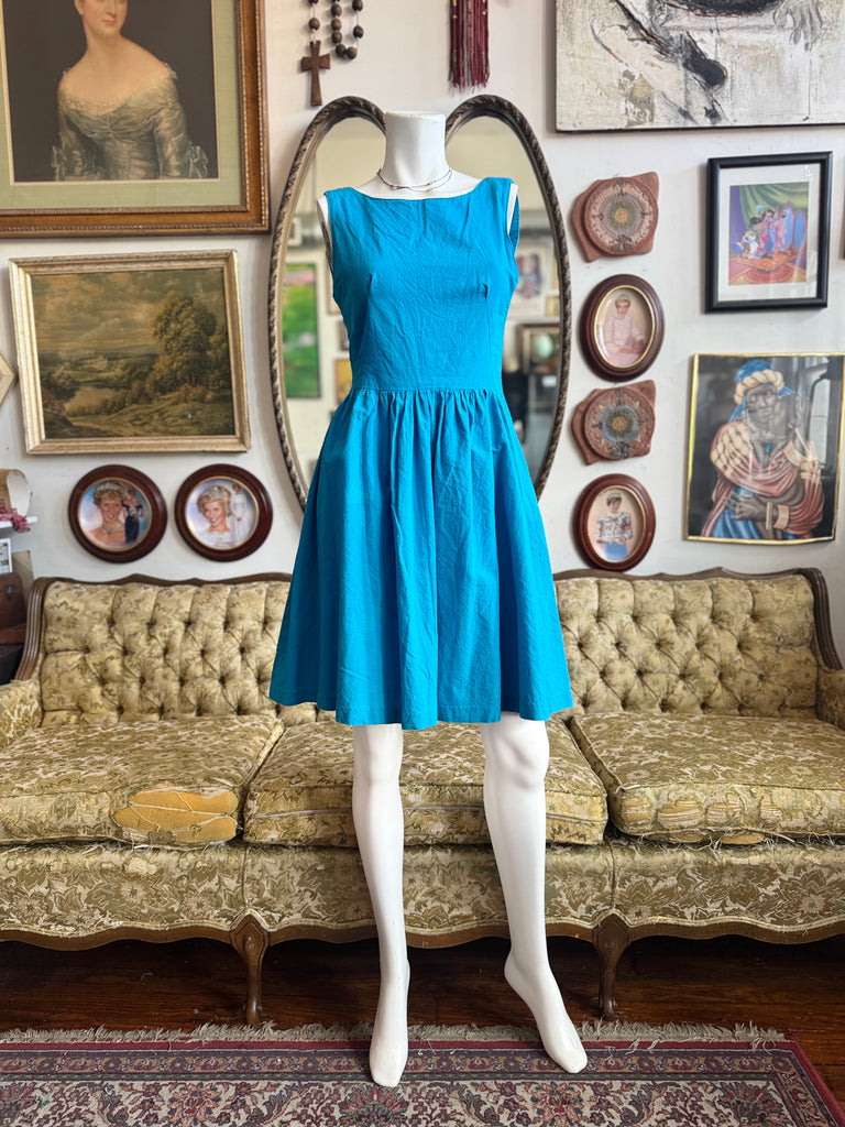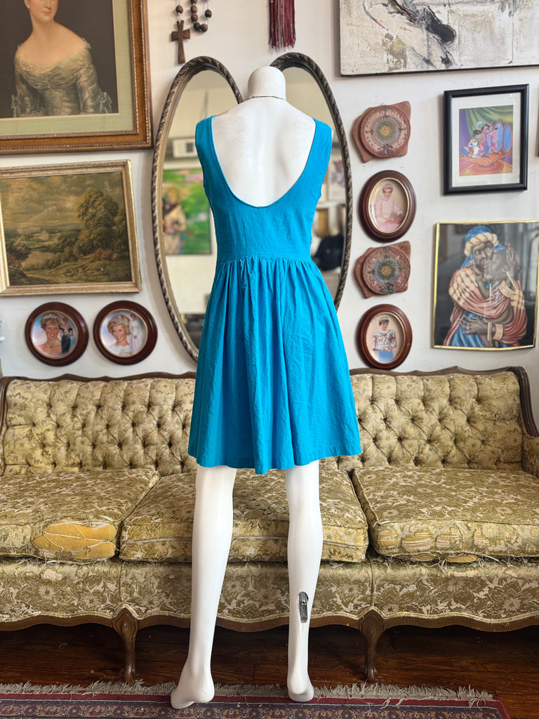 80s Blue Cotton Fit and Flare Dress Size 8/M