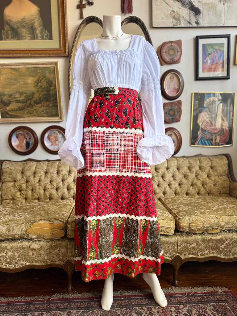 Vintage 70s Handmade Red Floral Gingham Patterned Maxi Skirt Size M/30”