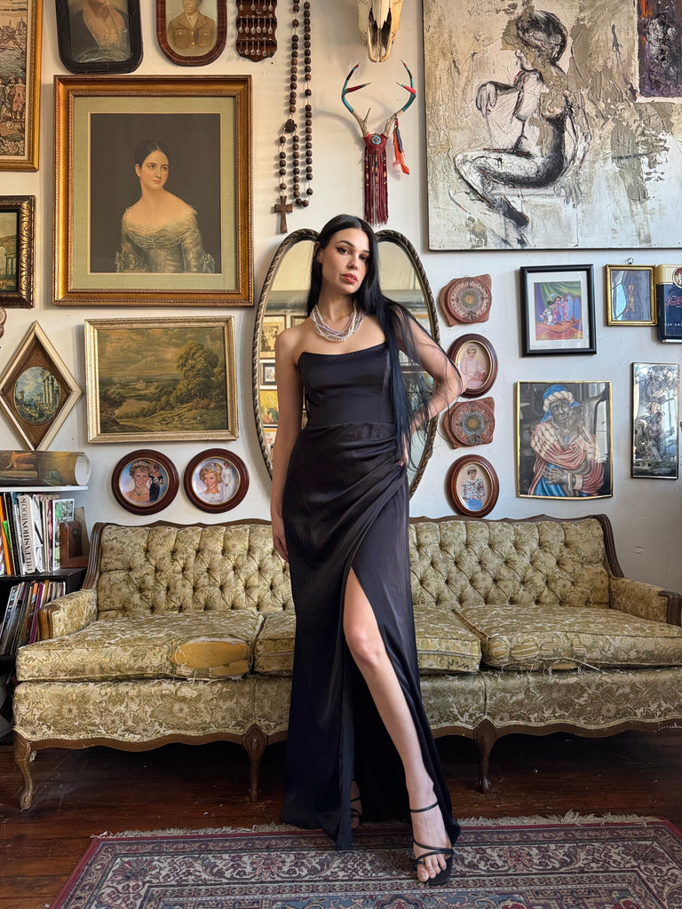 Vintage Laurence Kazar Black Silver Metallic Beaded Maxi Evening Dress Size Small