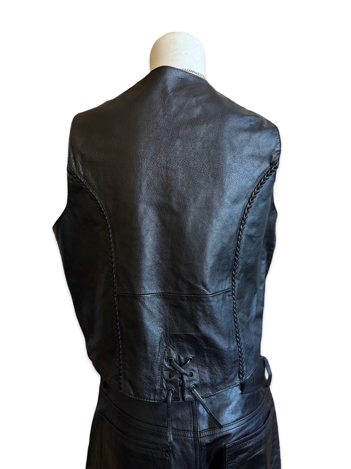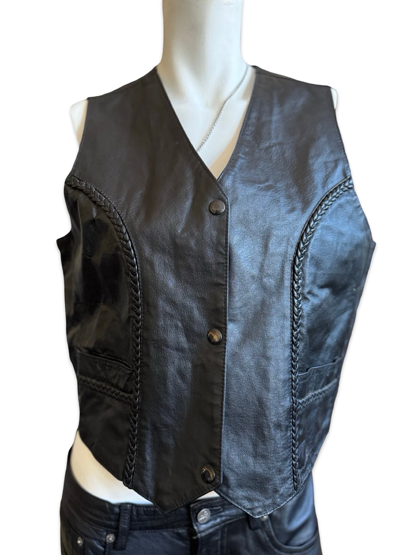 Description: Black Leather Vest With Braiding. SOLD AS is for wear.