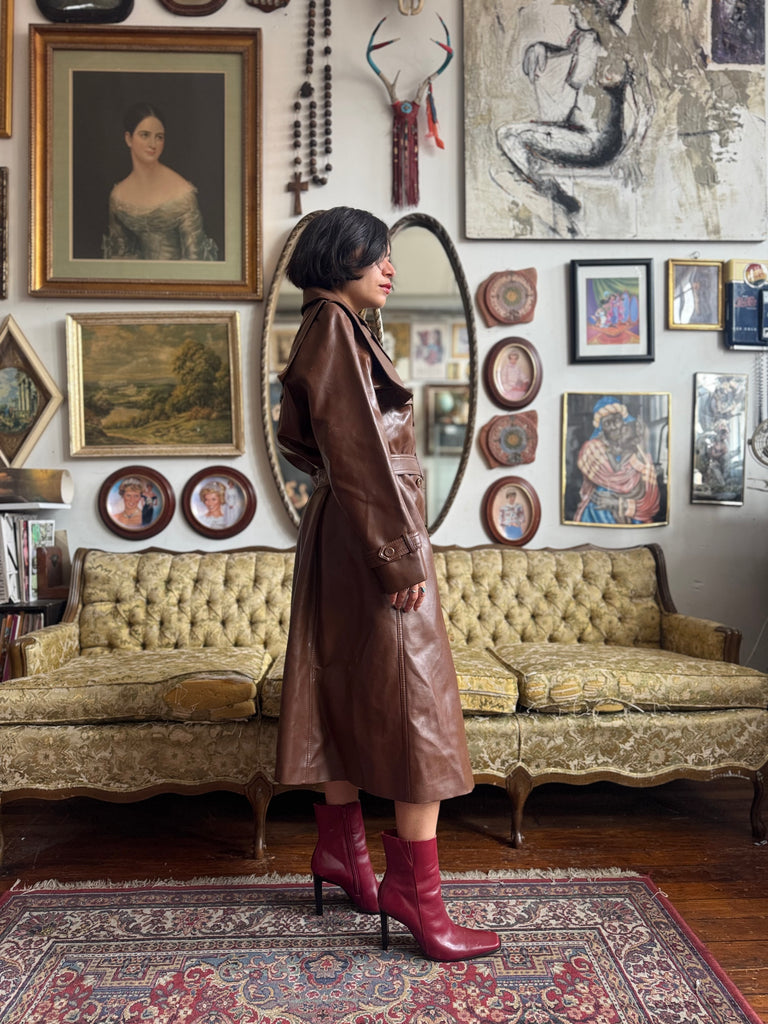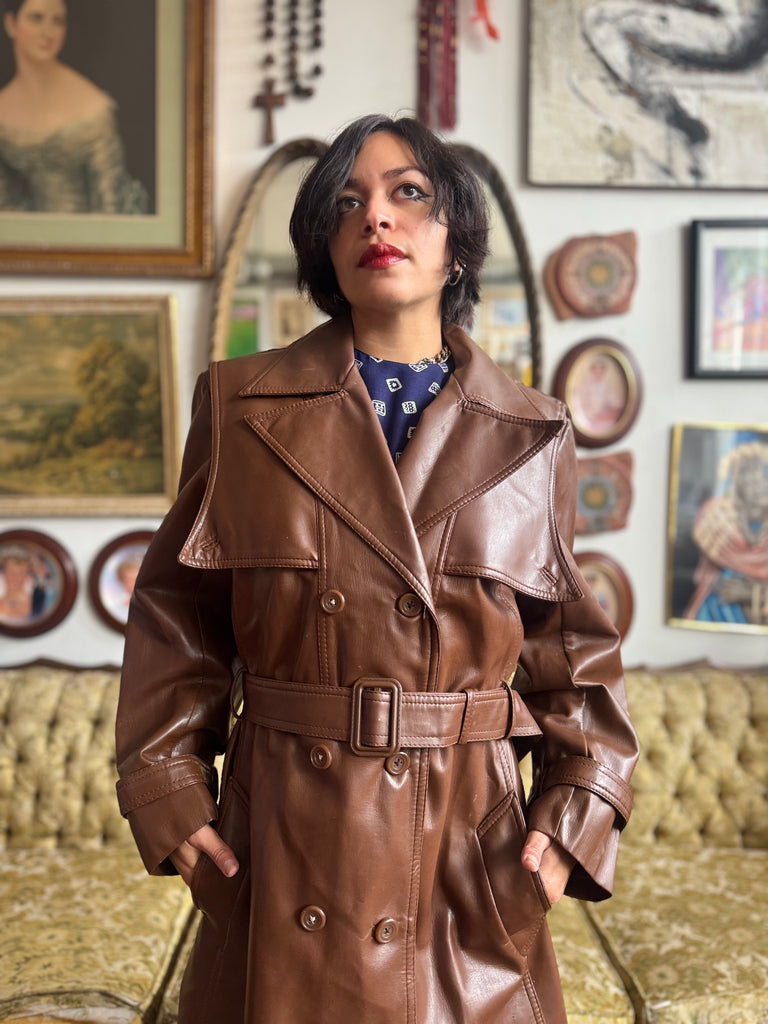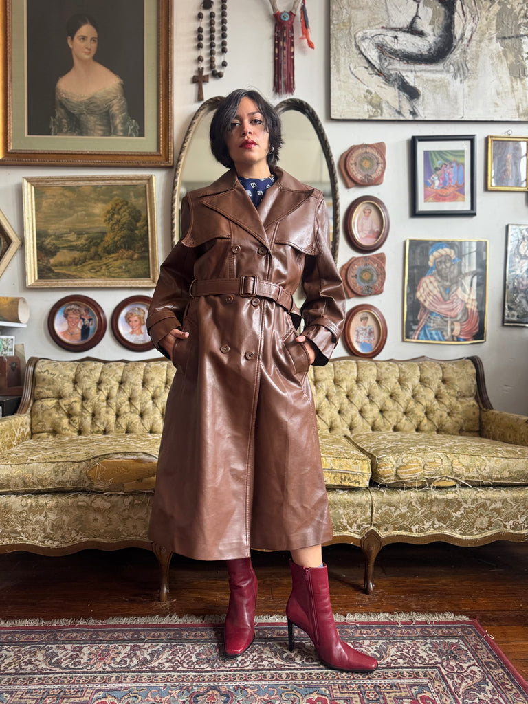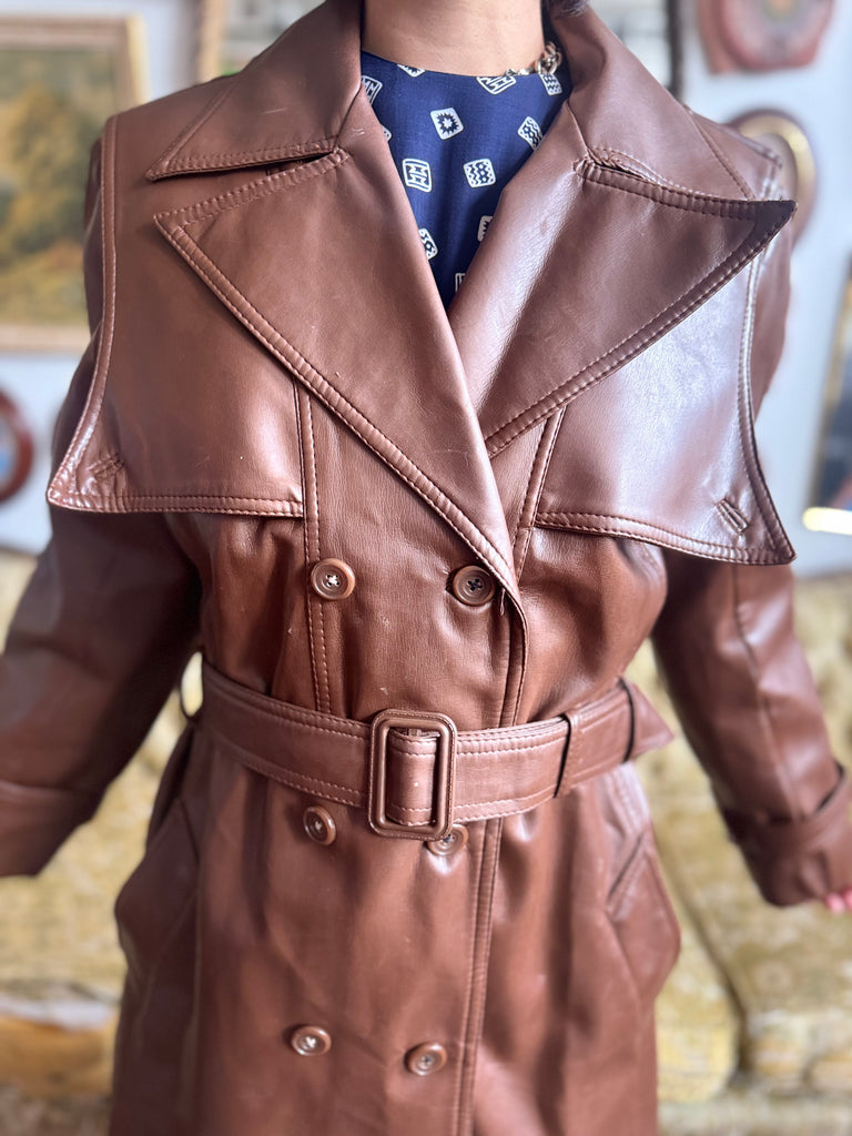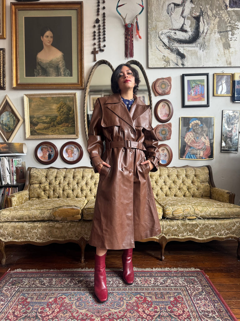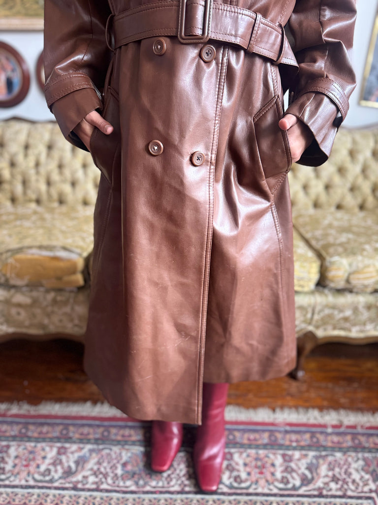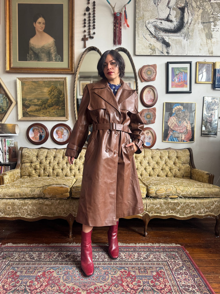 70s Faux Leather Chocolate Brown Leather Trench Coat w Tie Ladies Size M/L 32" by Amerex
