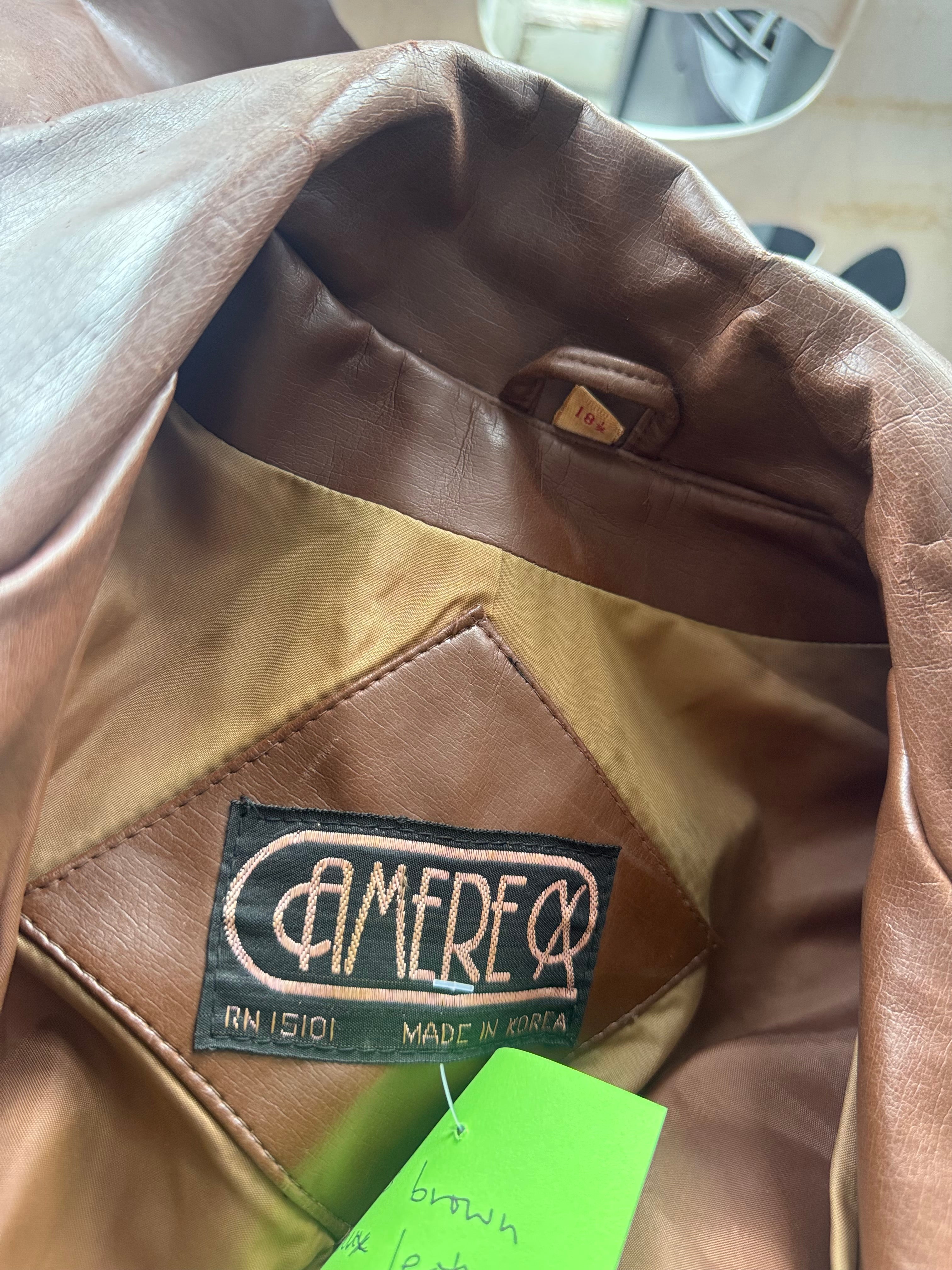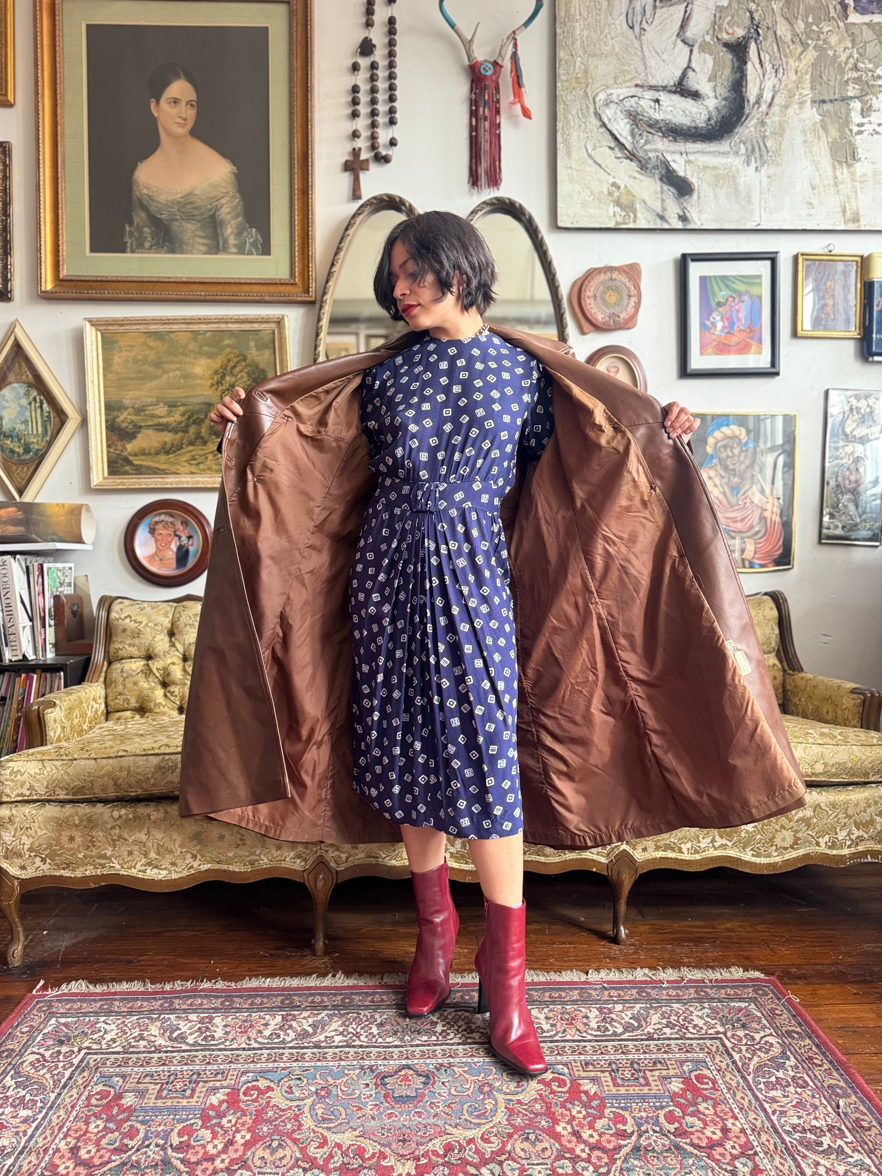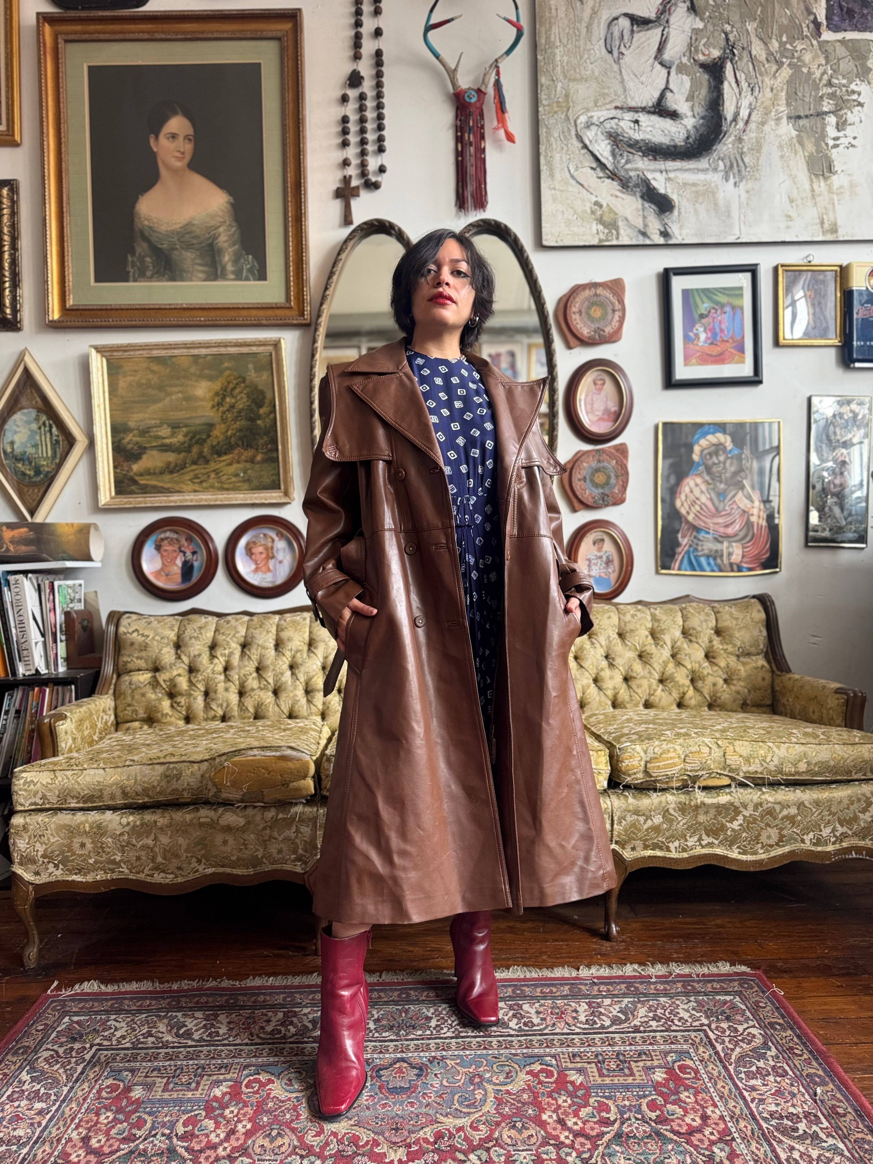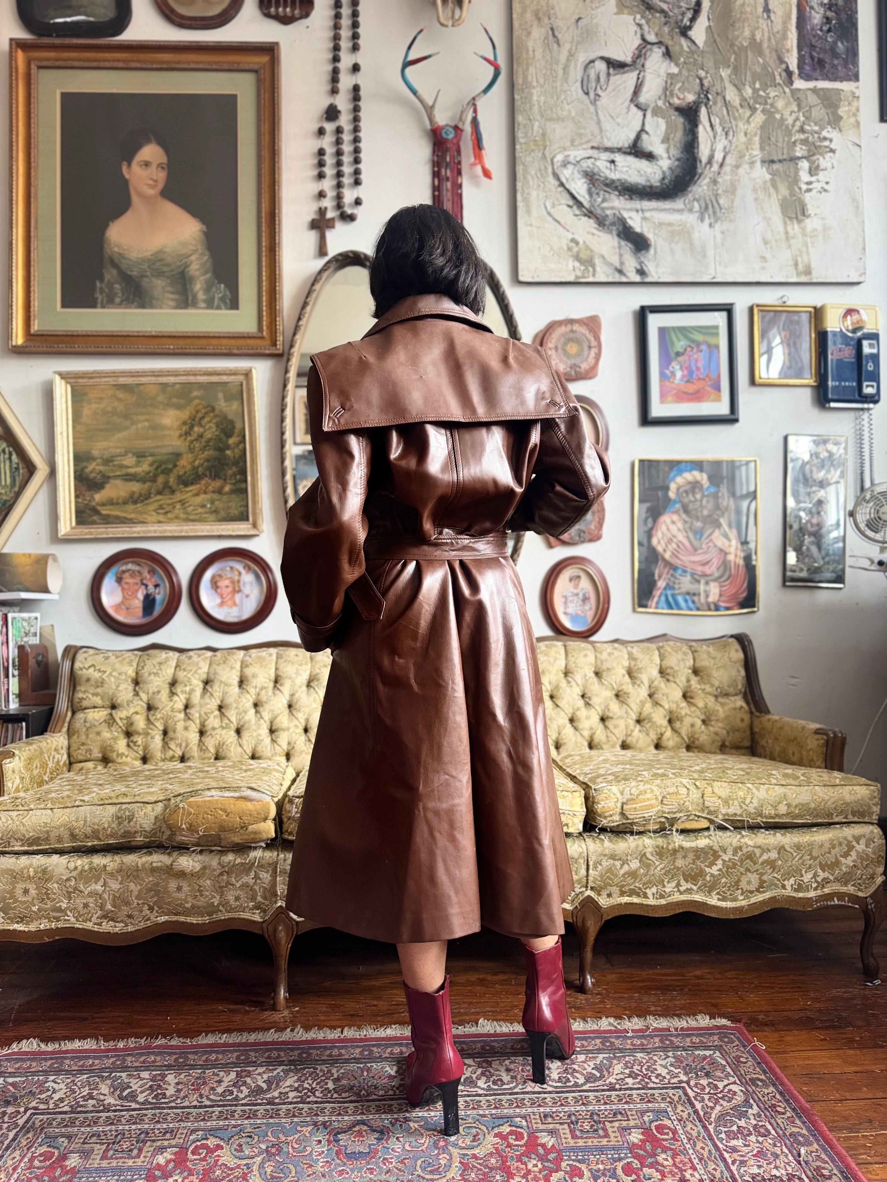 70s Faux Leather Chocolate Brown Leather Trench Coat w Tie Ladies Size M/L 32" by Amerex