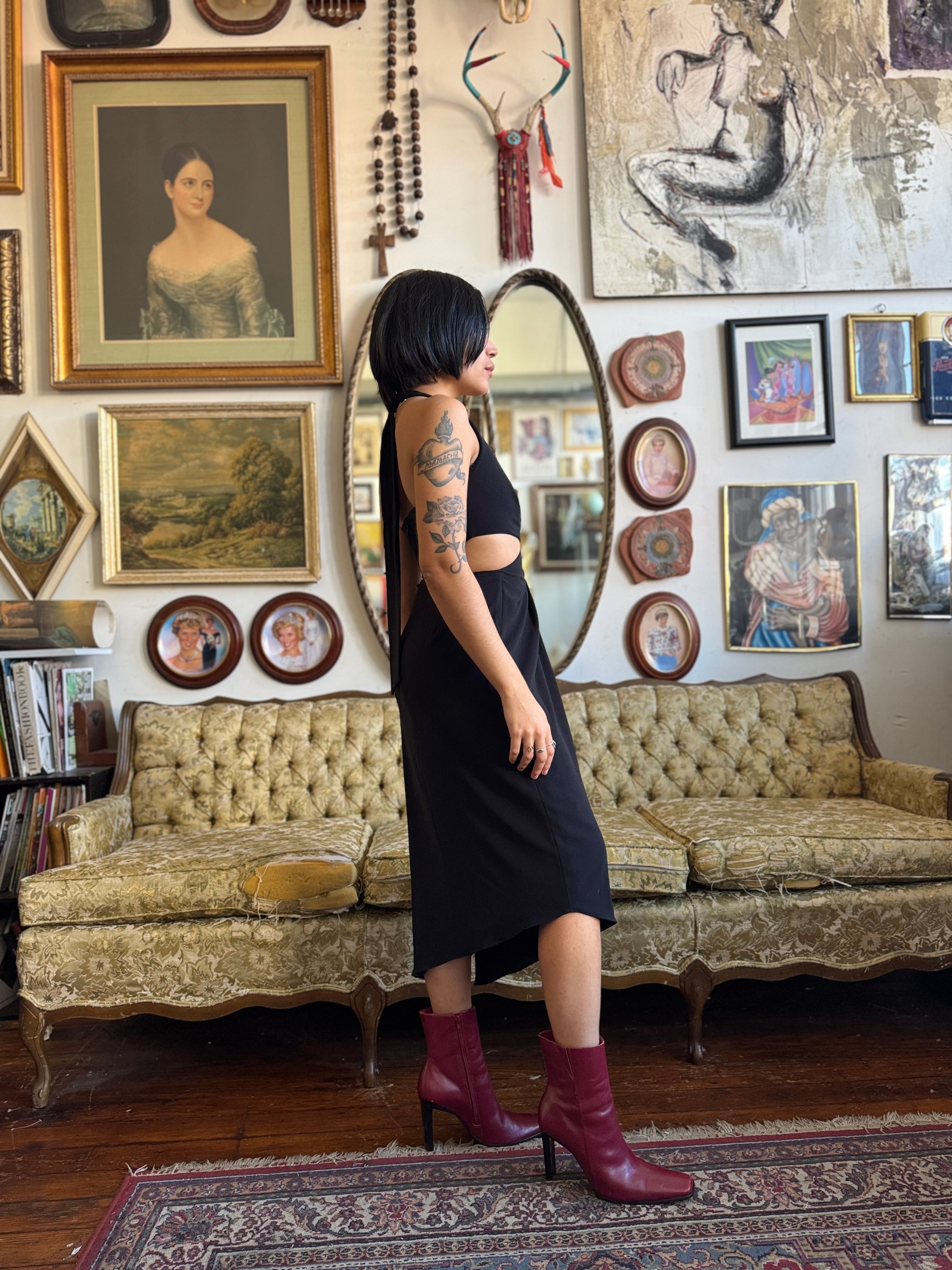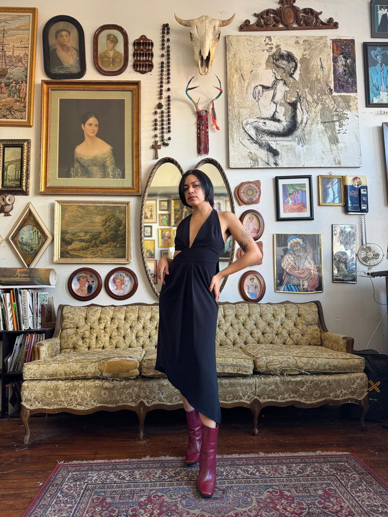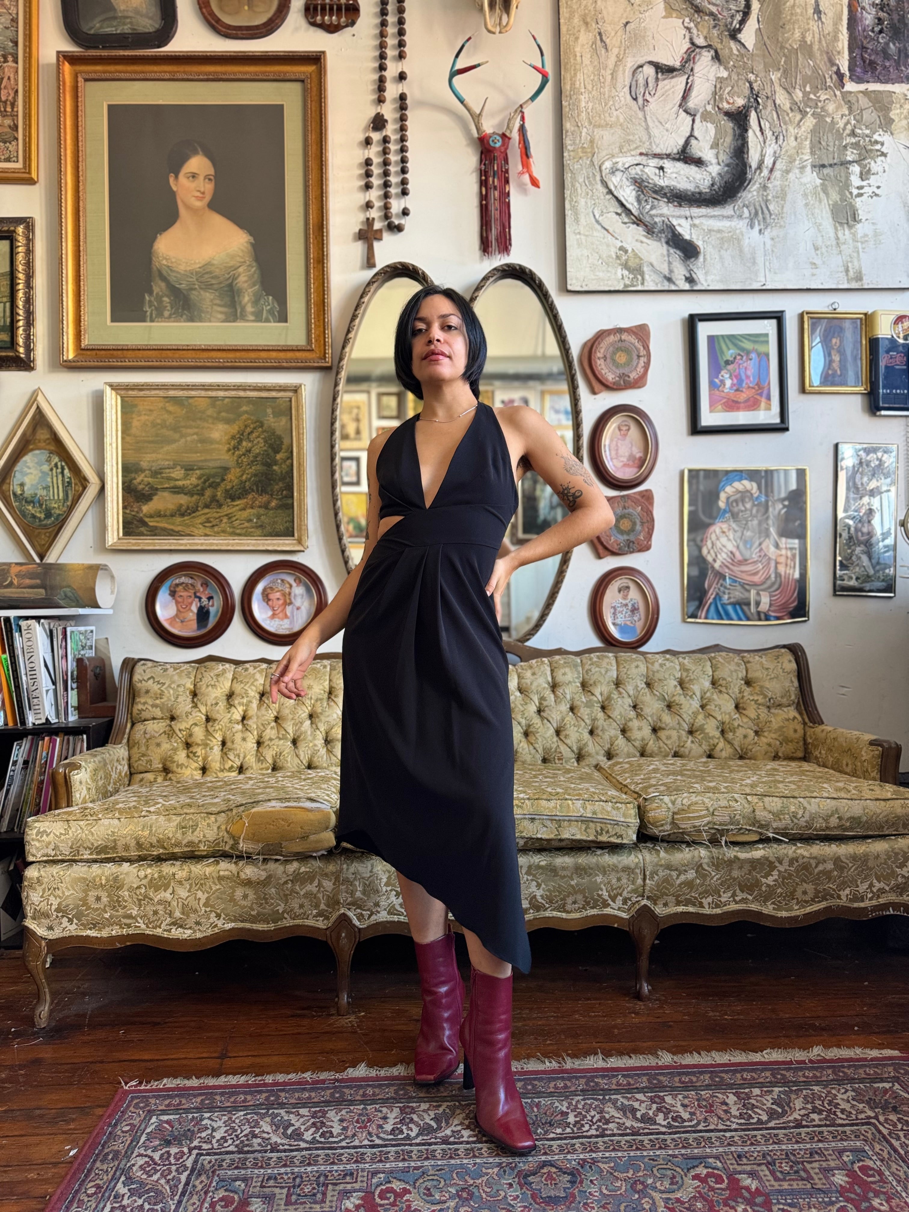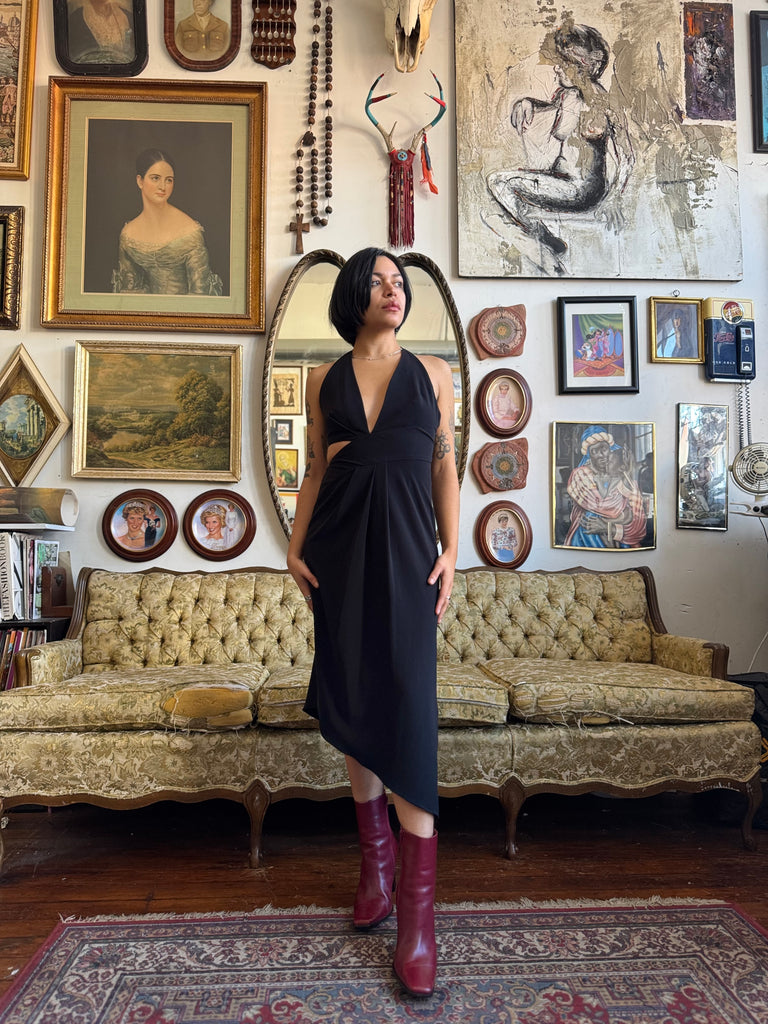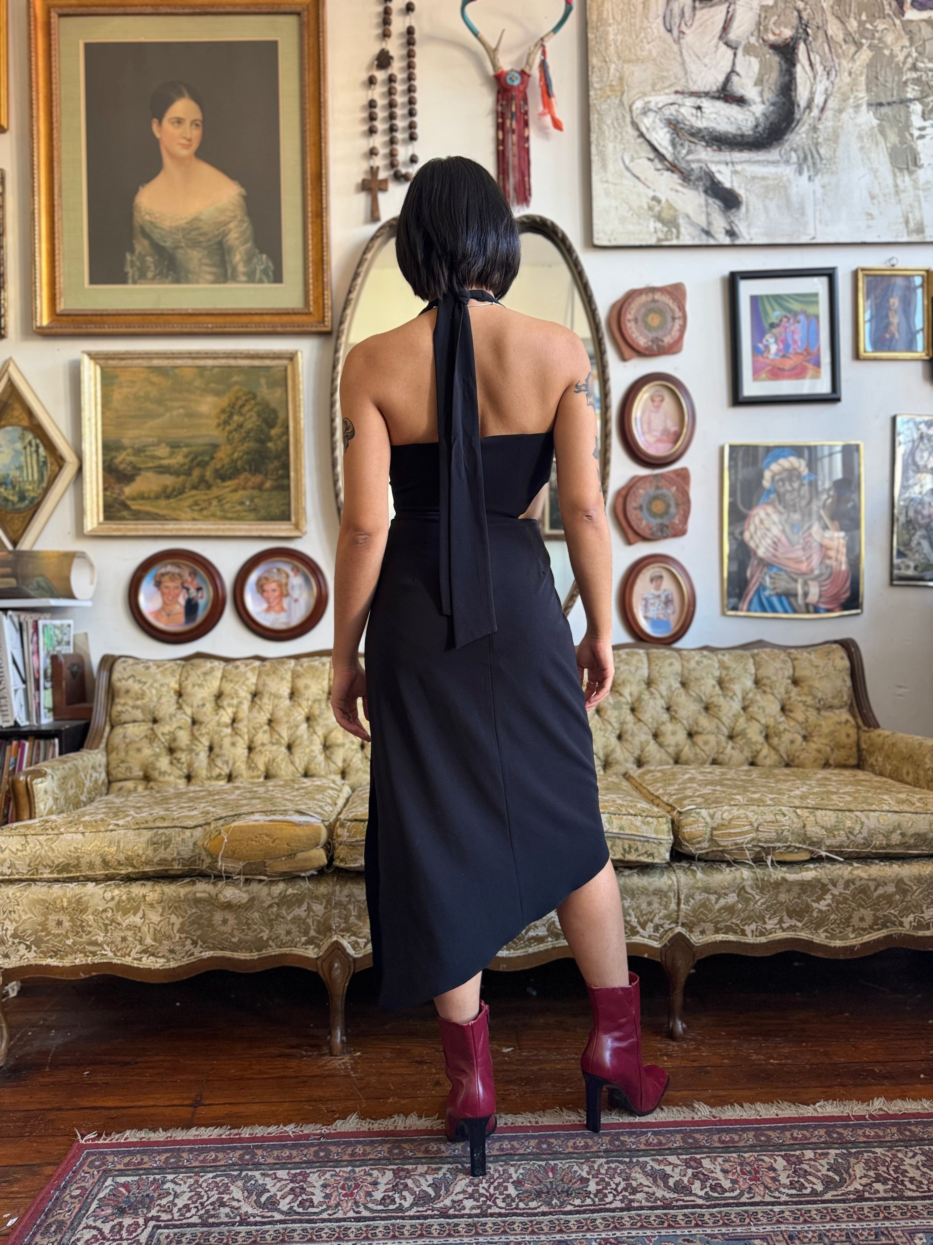 Info: Halston Heritage Asymmetrical Hem, Halter Top, and Waist Cut Out Evening Dress.