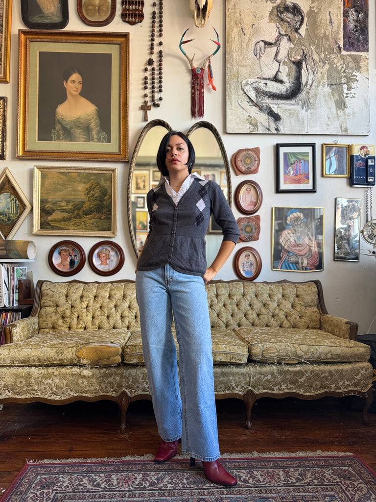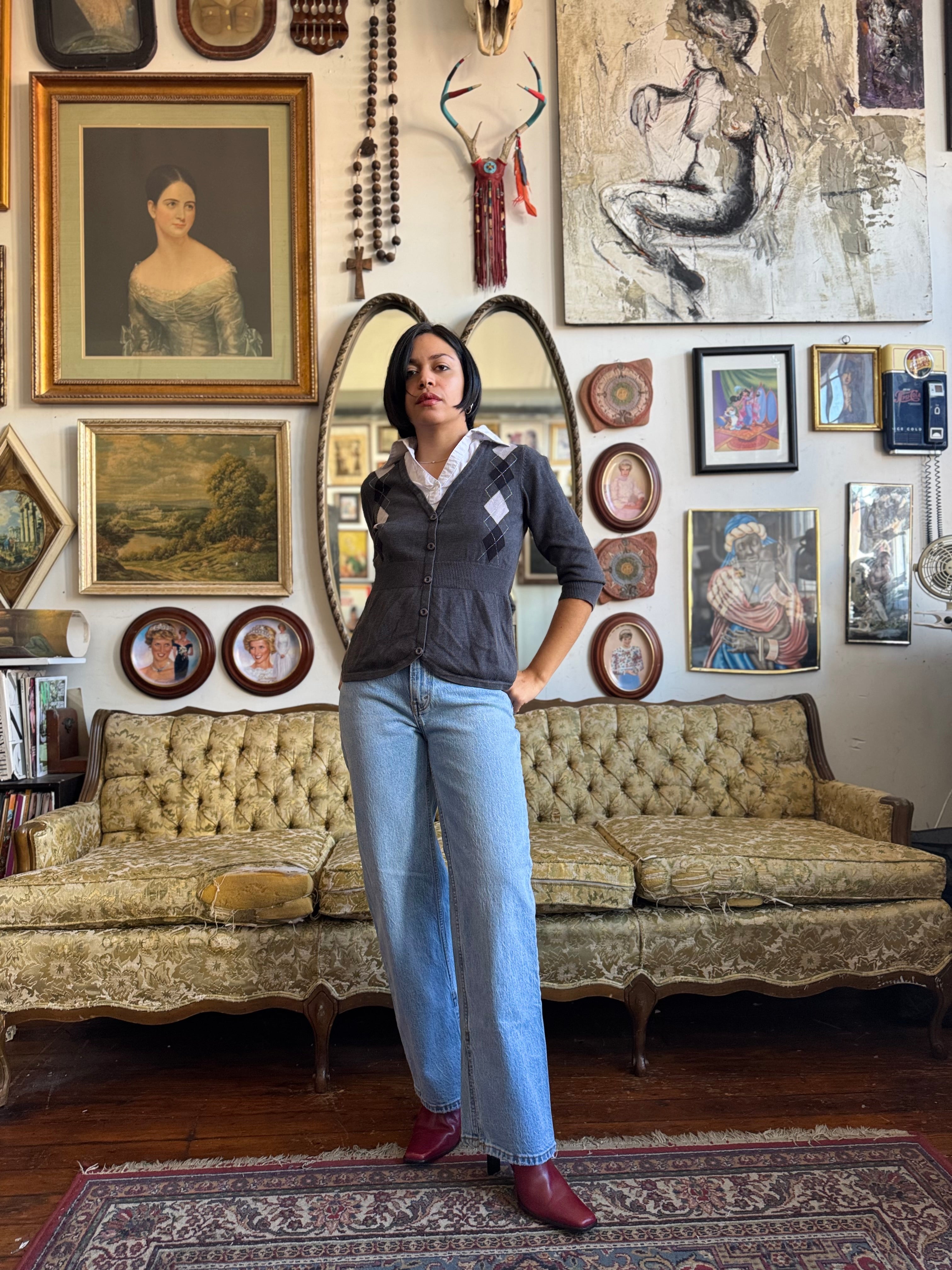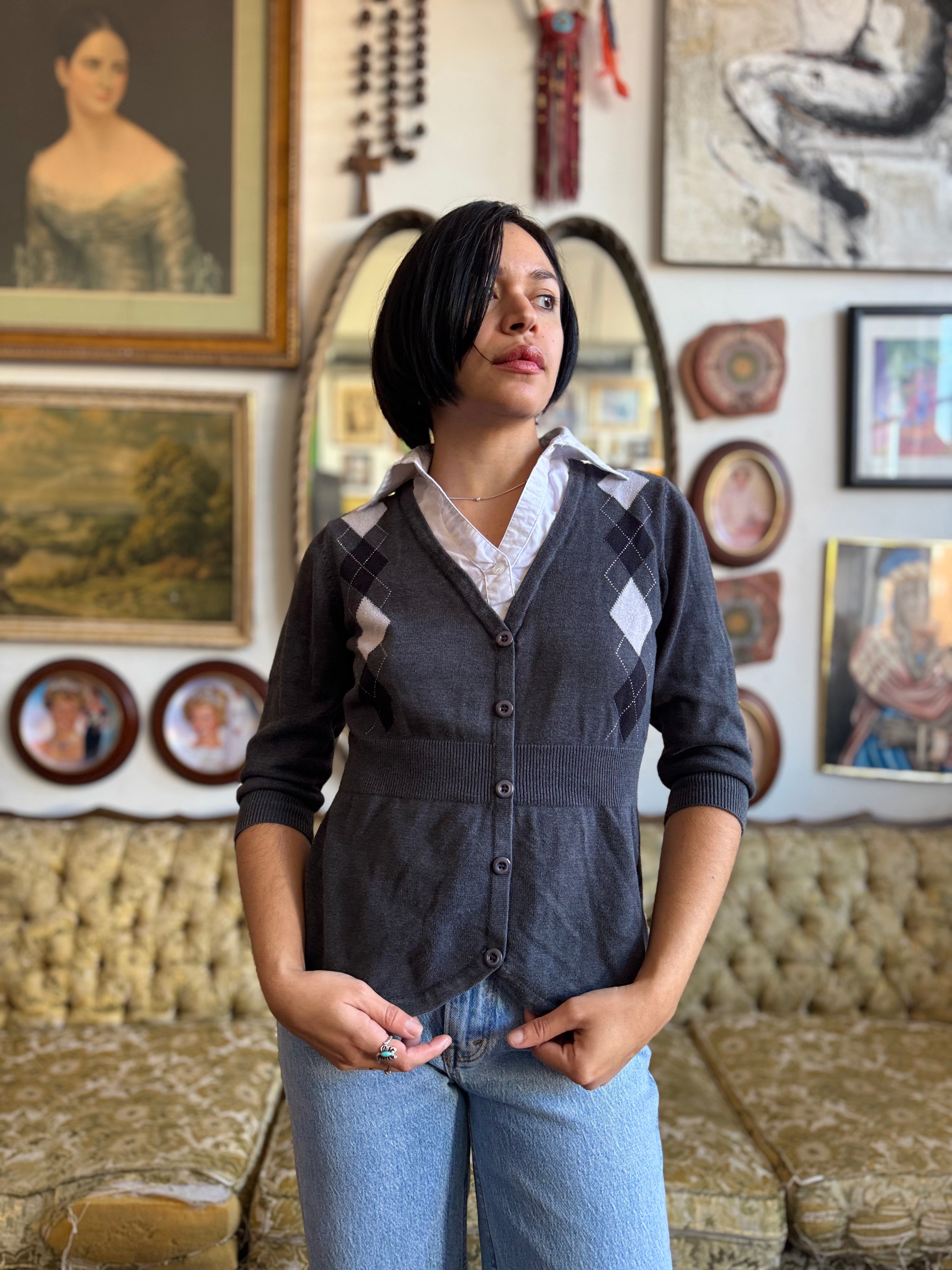 Description: Y2K argyle cardigan layered top with attached button up collar.