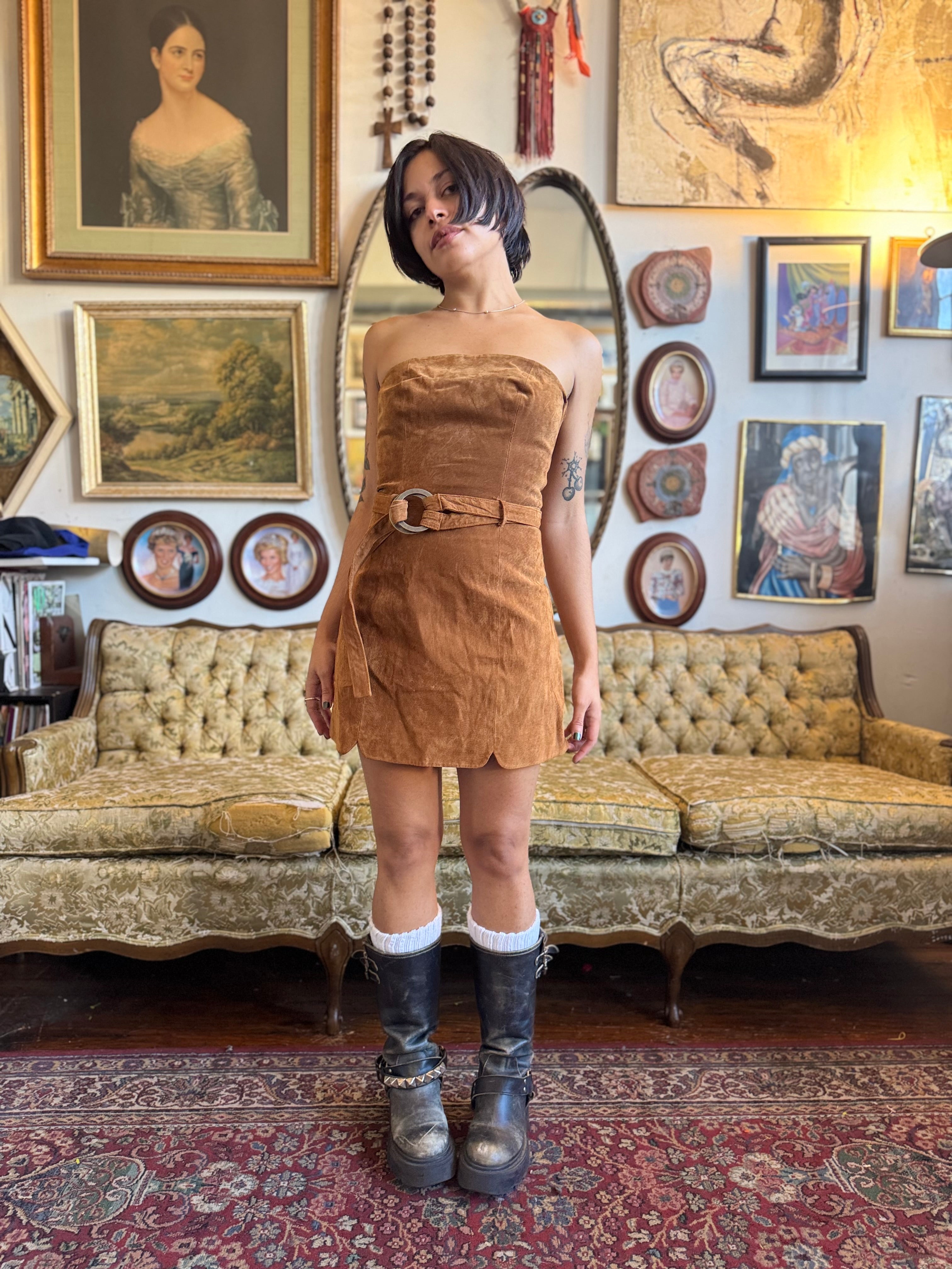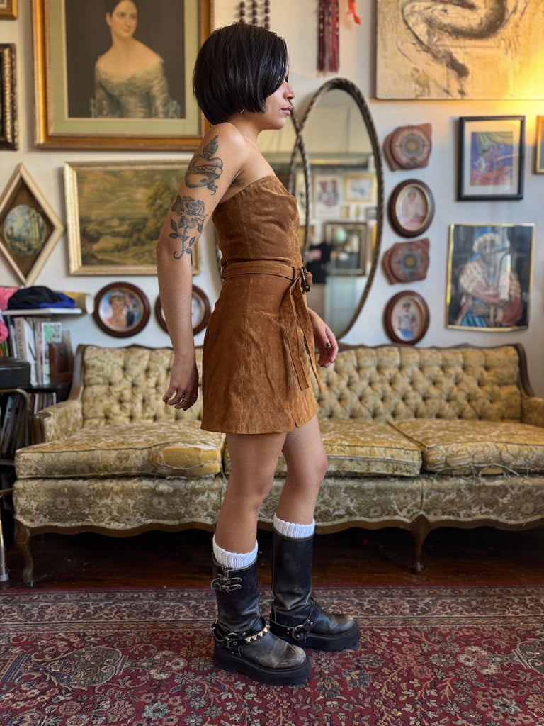 FP Brown Suede Bet On It Strapless Mini Dress w Belt.