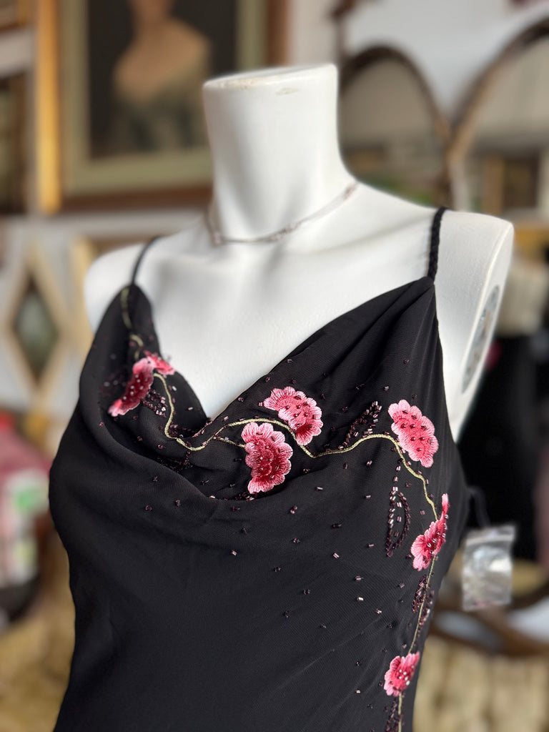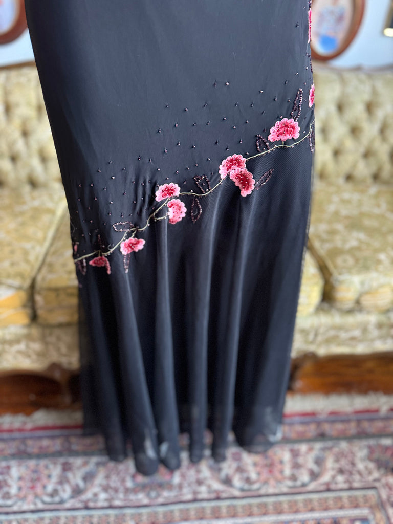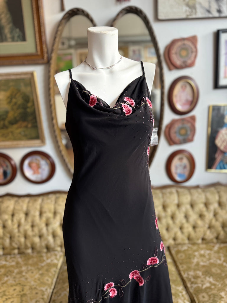 Vintage Goddess Black and Pink Floral Polyester Maxi Dress Size 10/Large