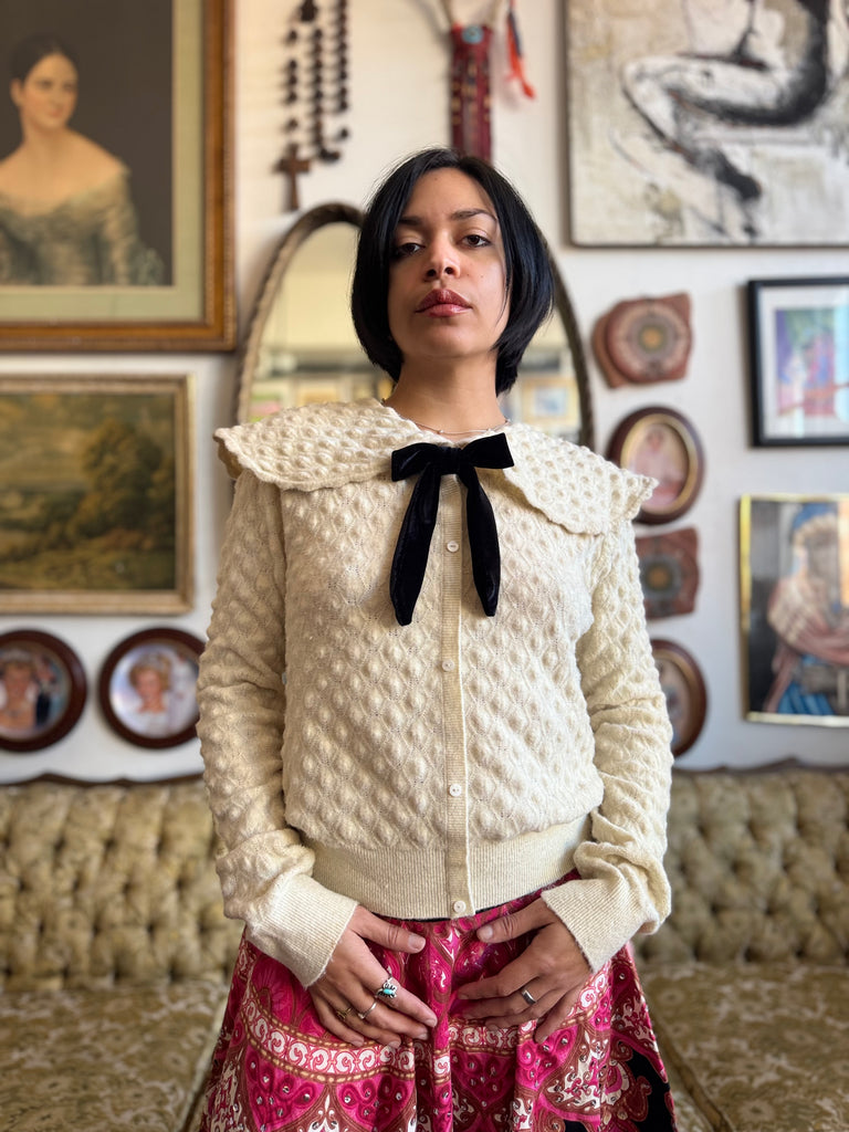 ZARA Cream Knit Black Bow Collared Cardigan Size M