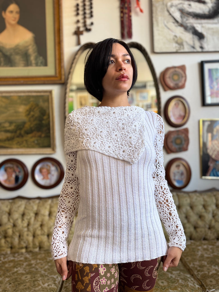 Y2k Ribbed Sweater with Crotchet Fold Over Collar & Sleeves Size S