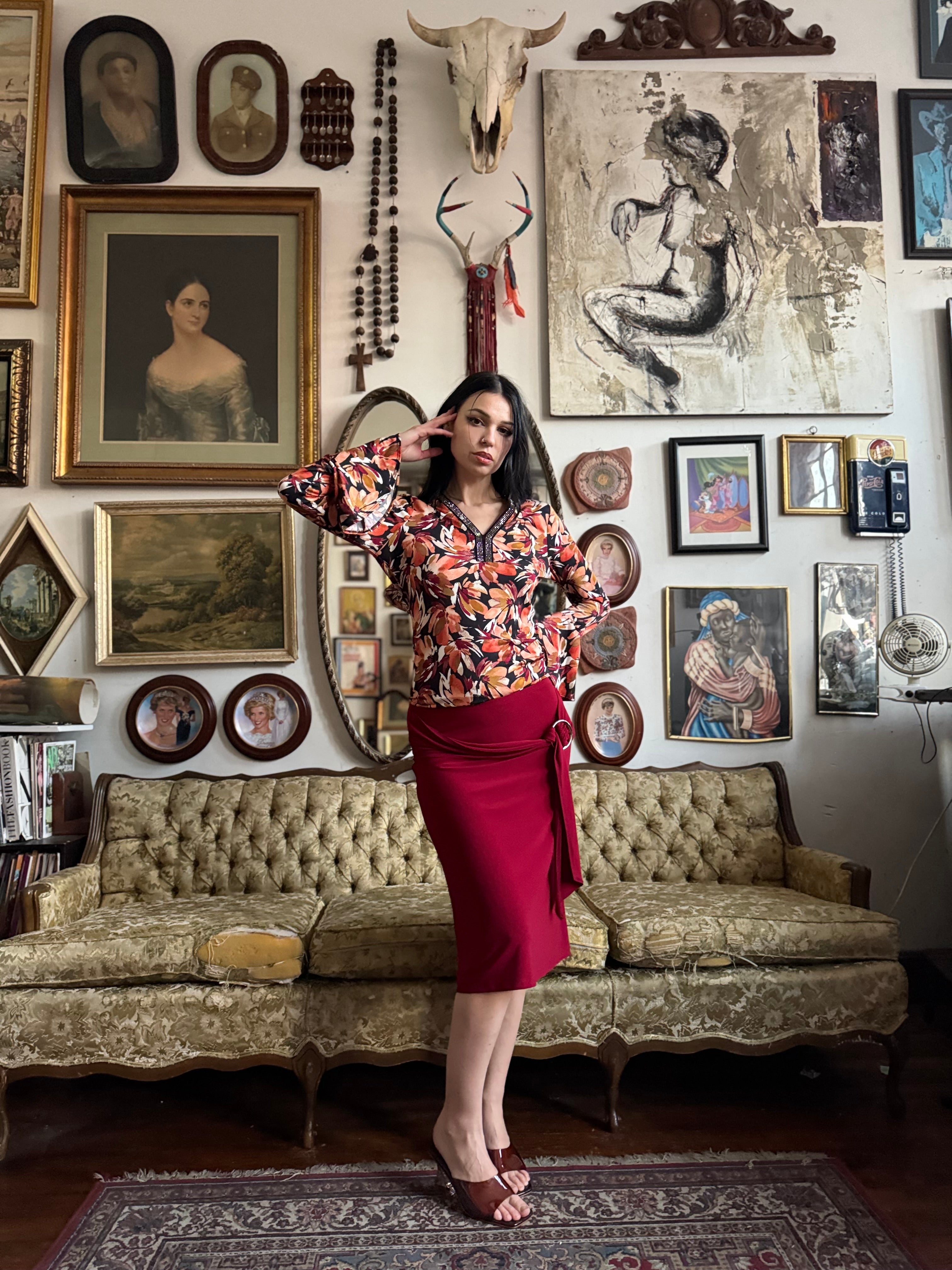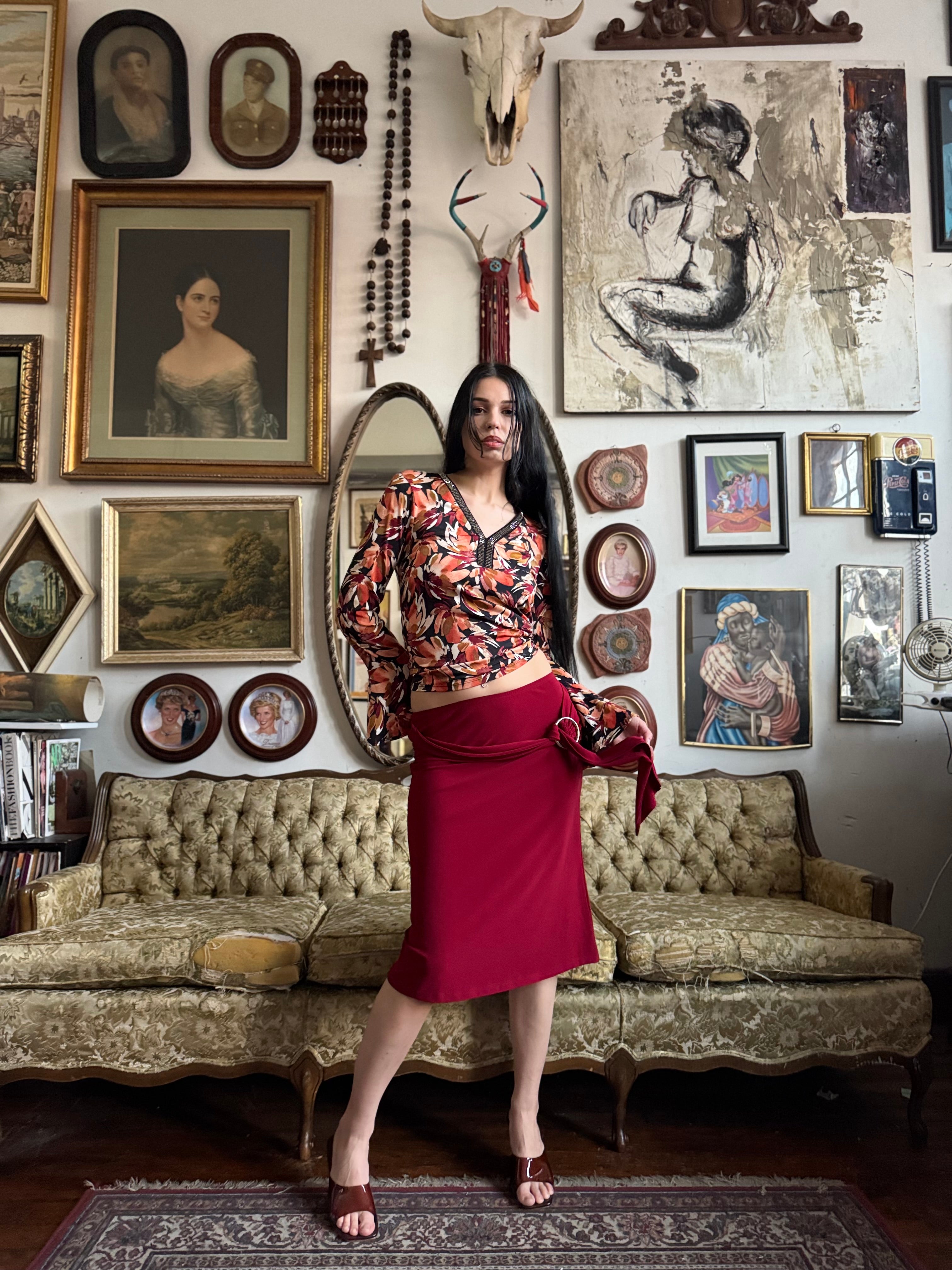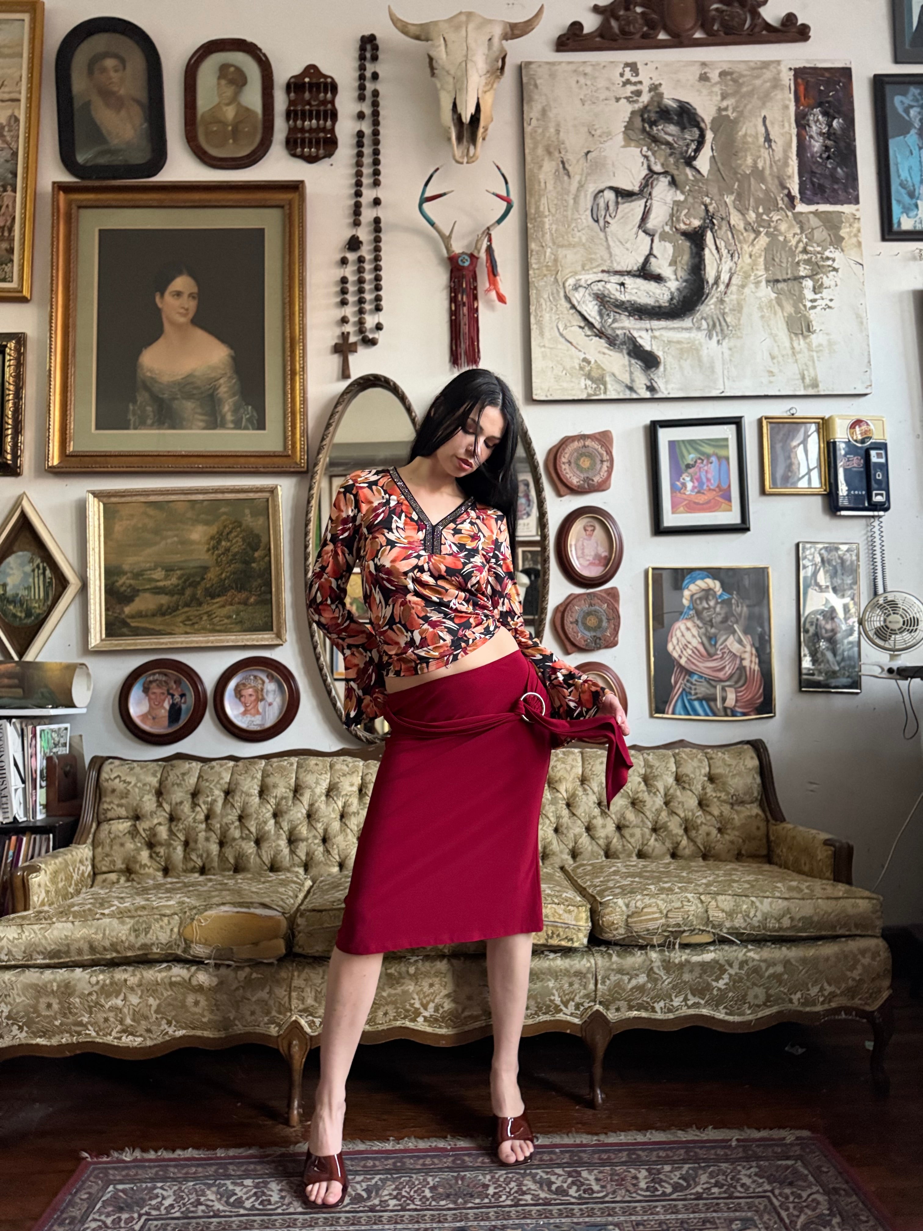 Y2k Cherry Red Knee Length Skirt w O-Ring Sash Size M