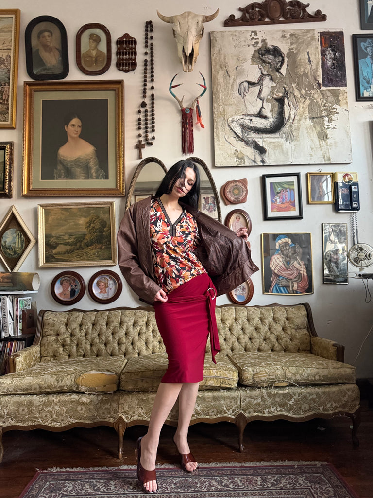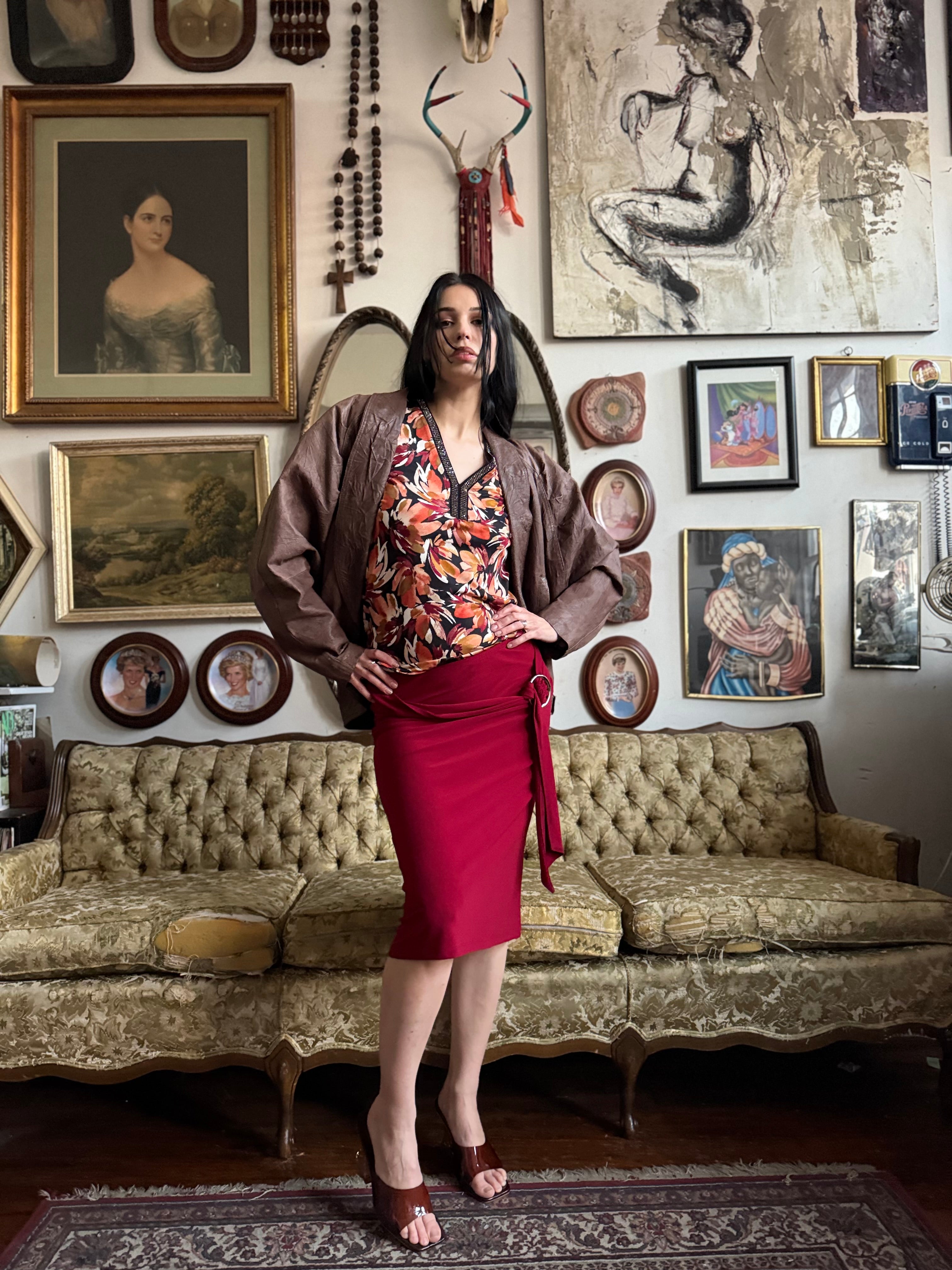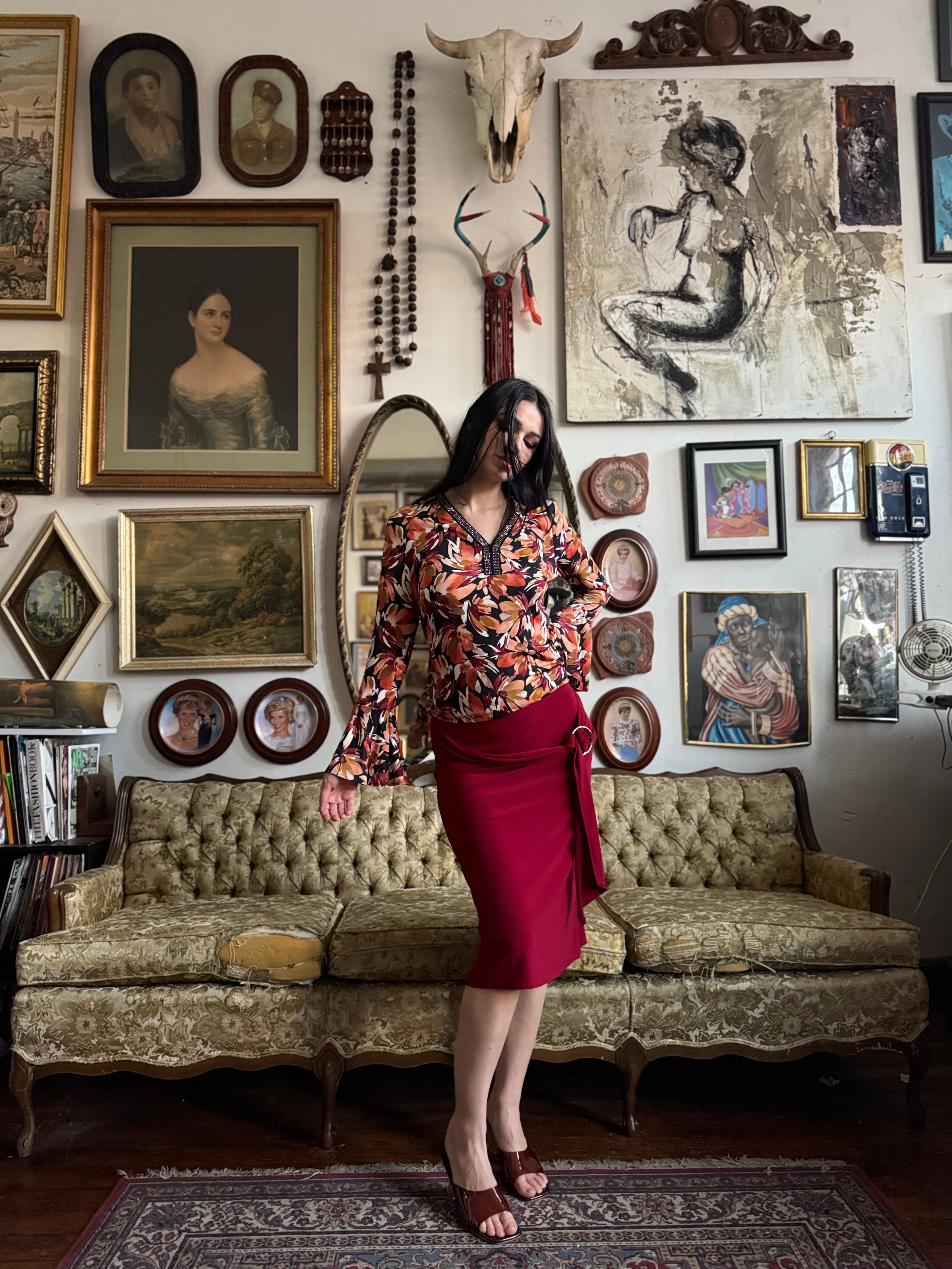 Y2k Cherry Red Knee Length Skirt w O-Ring Sash Size M