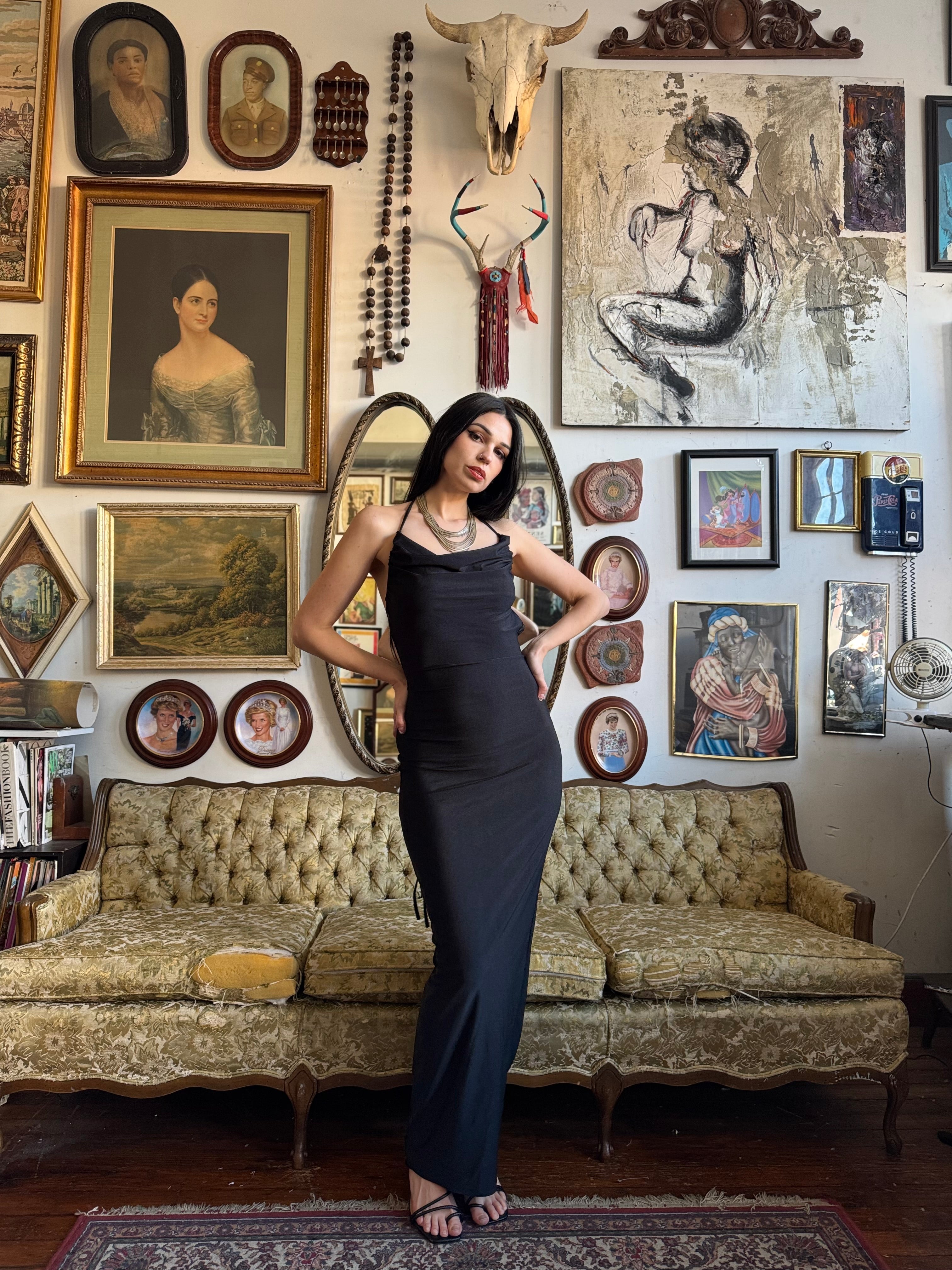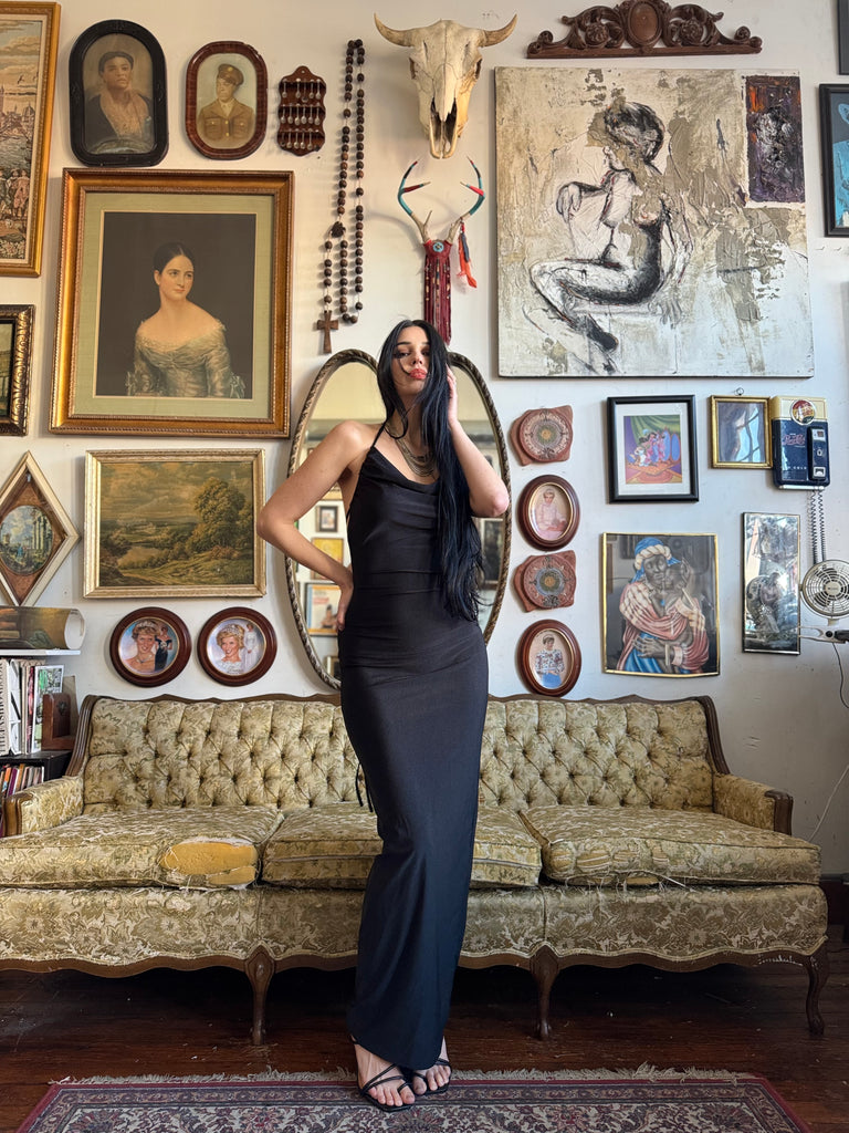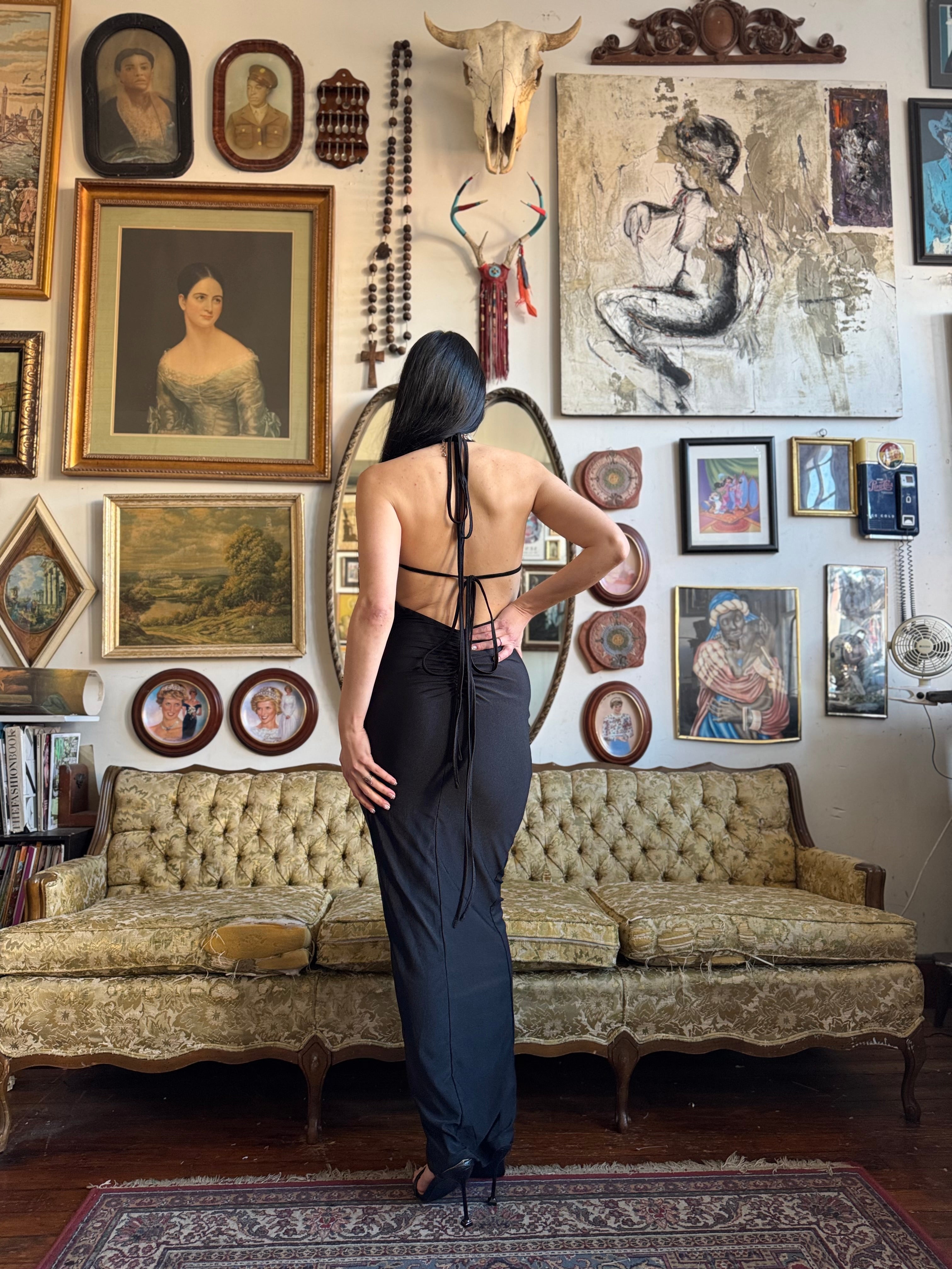 Black Draped Backless Bodycon Maxi Dress with Tie Size Medium