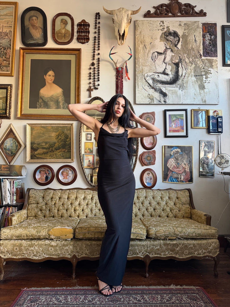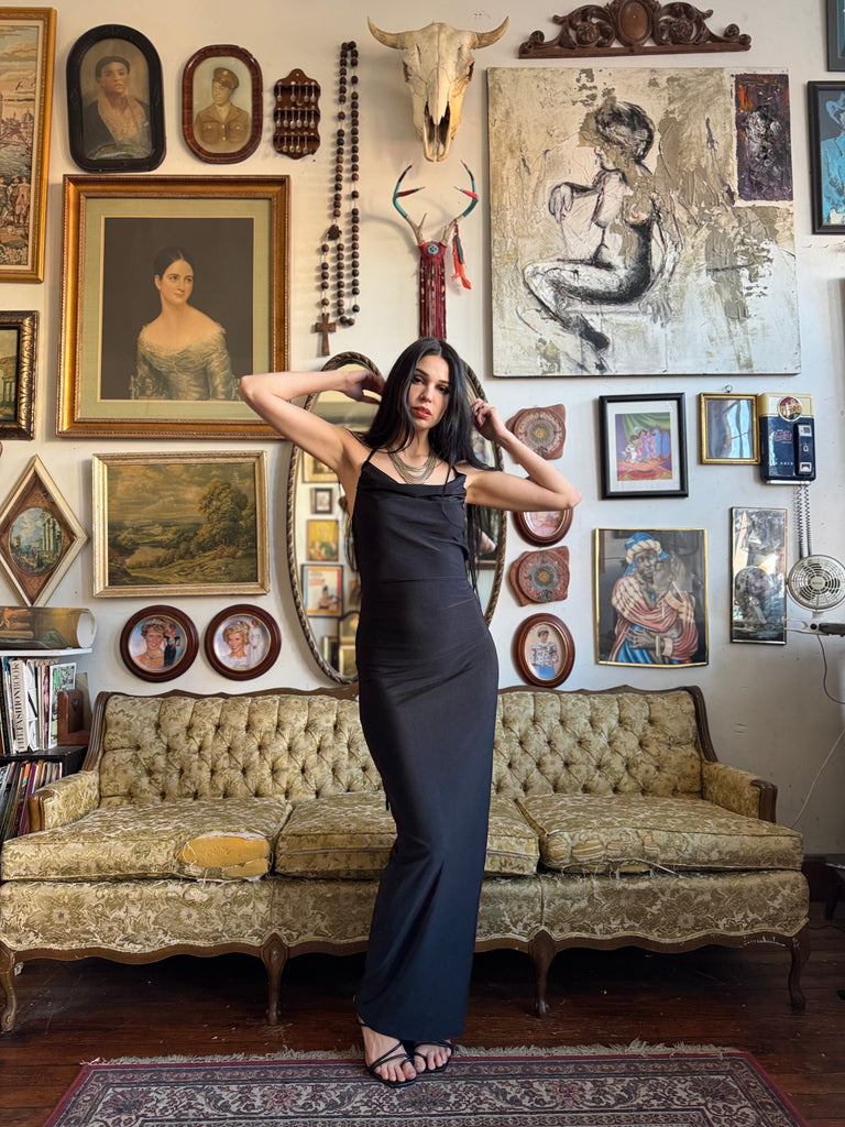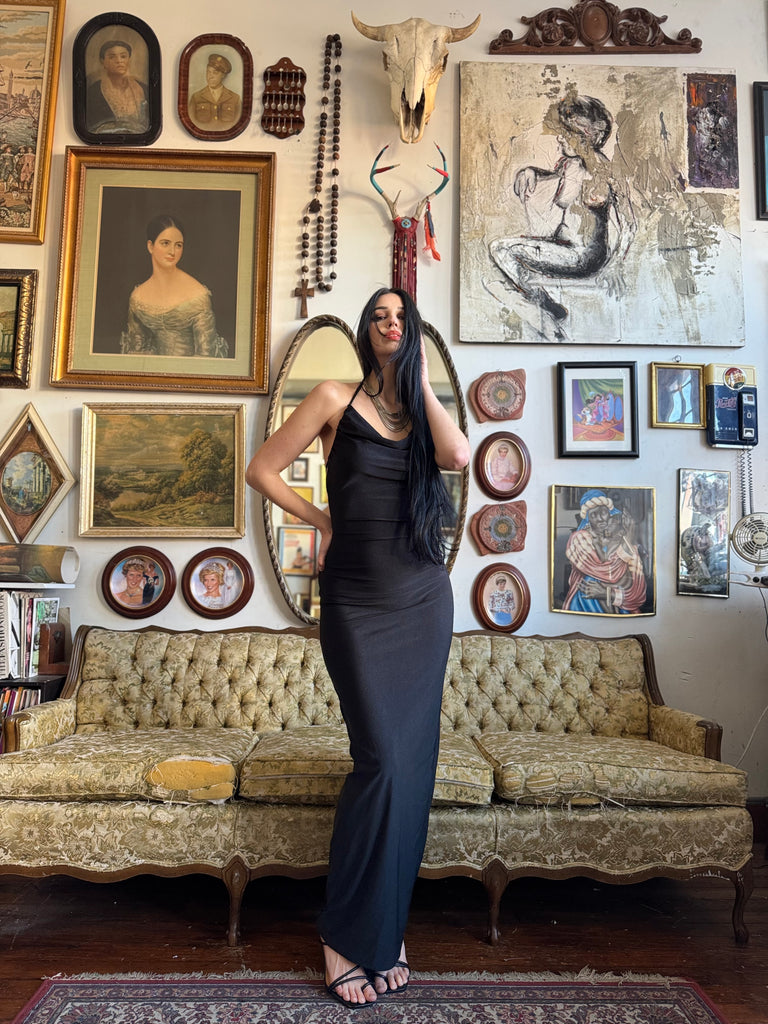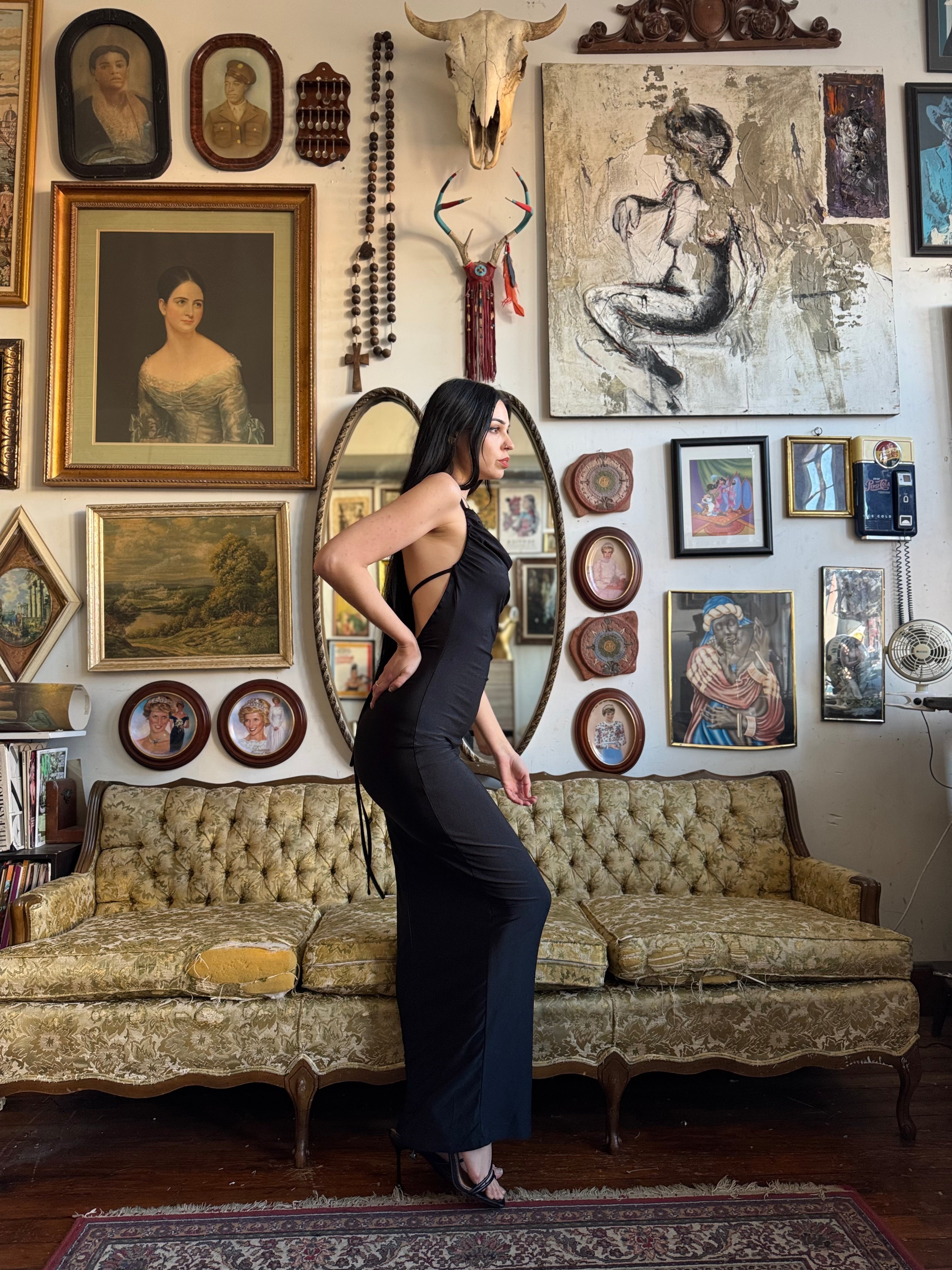 Black Draped Backless Bodycon Maxi Dress with Tie Size Medium