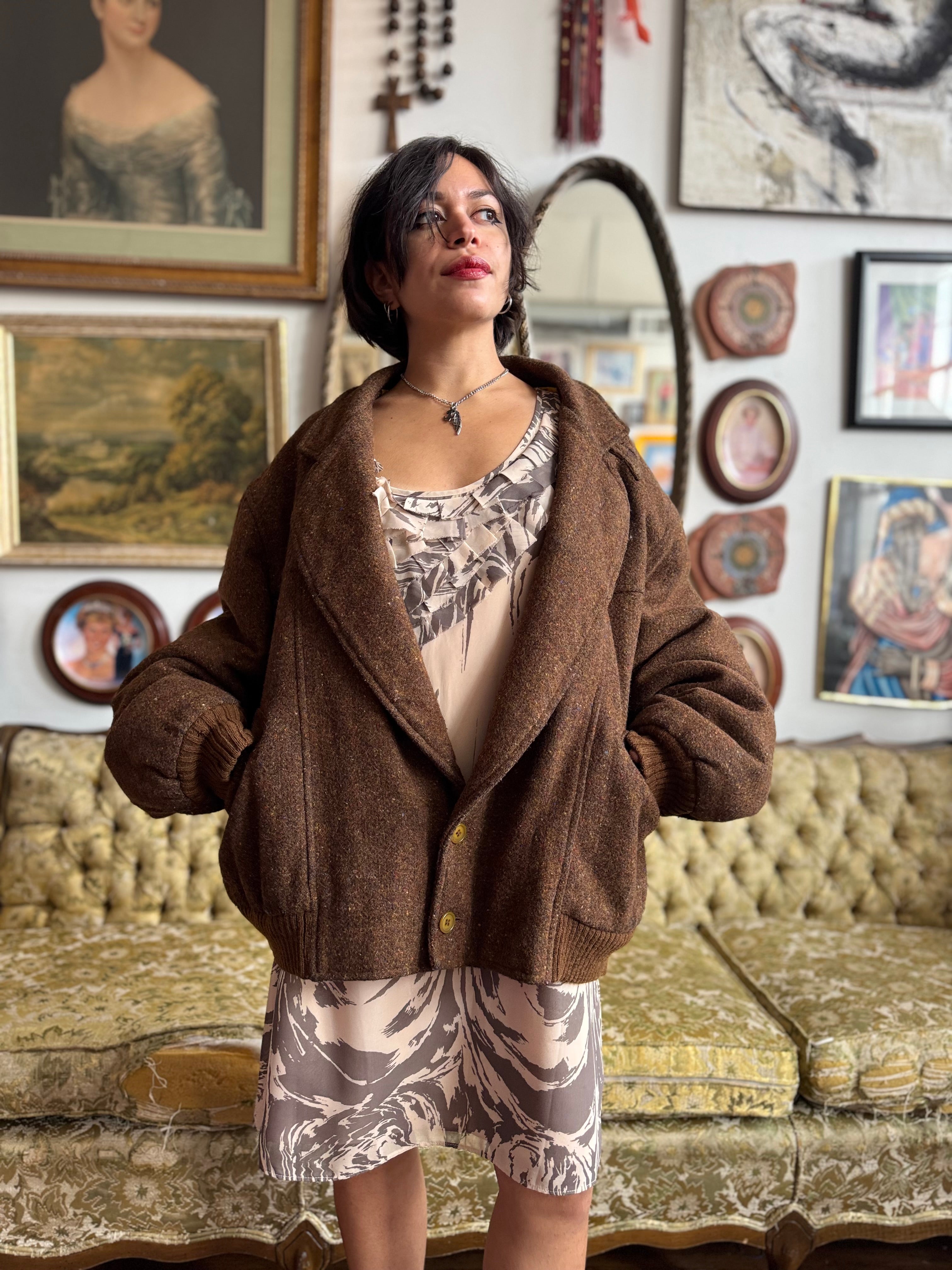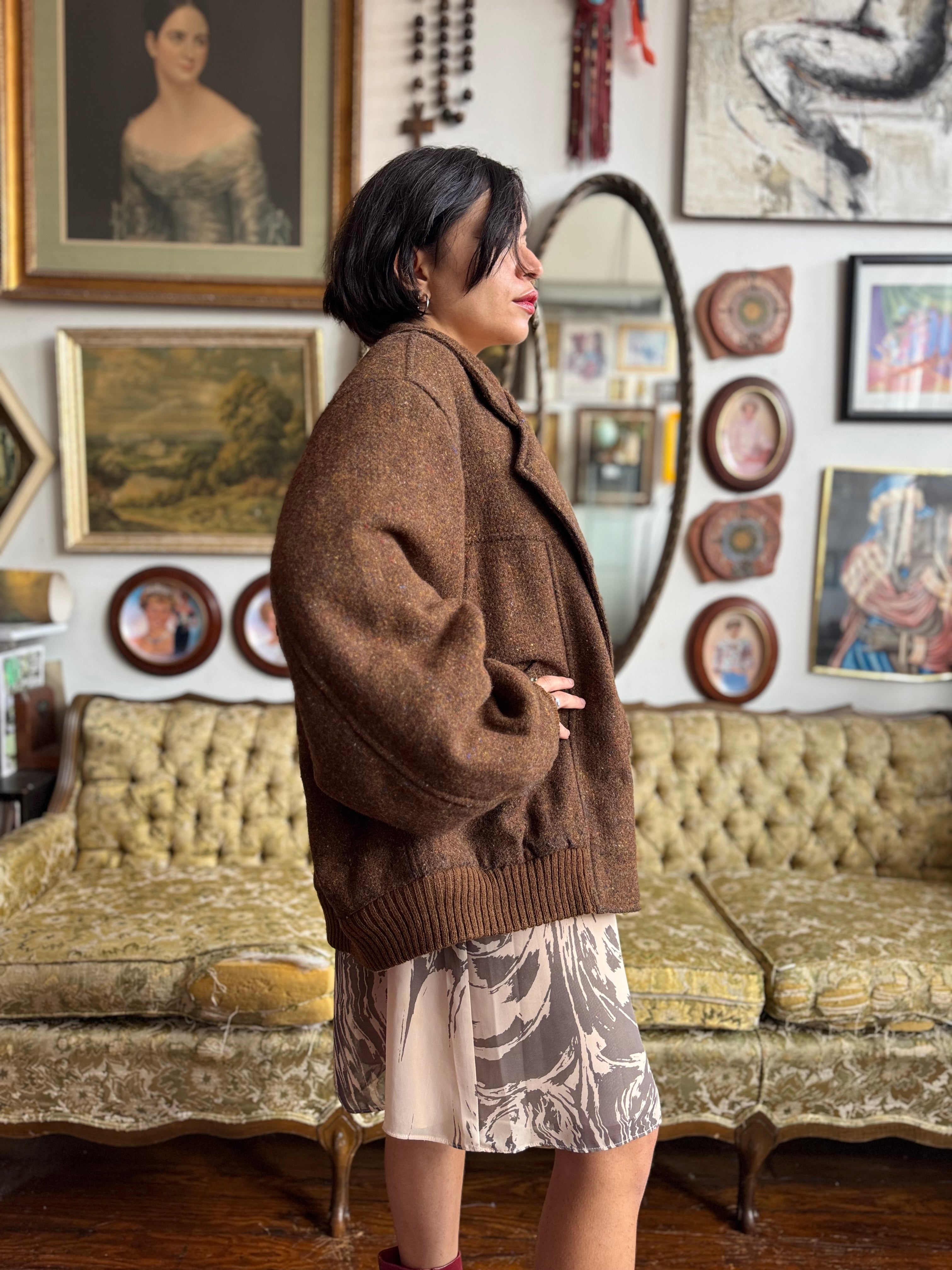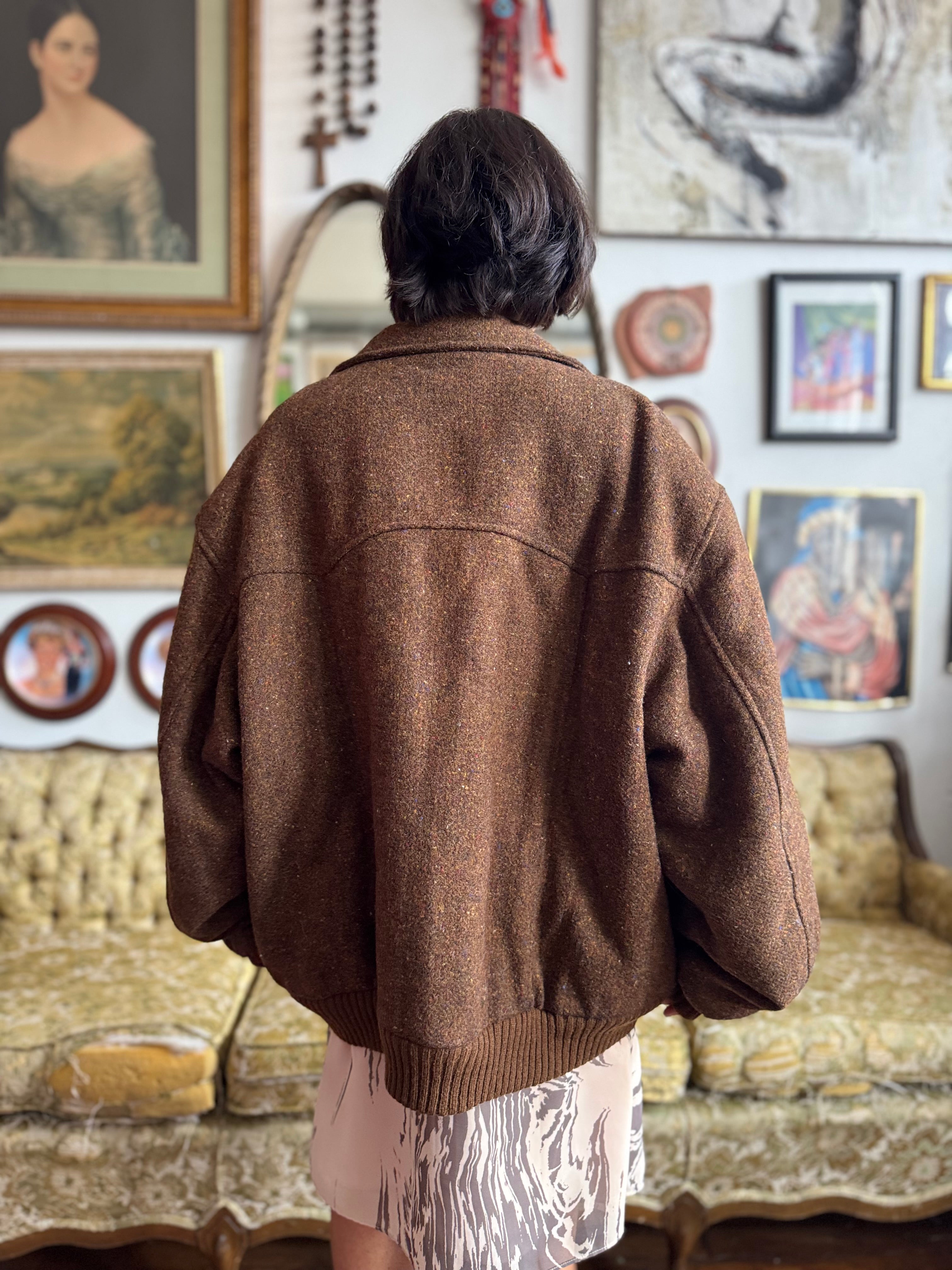 70s Vintage Wool Benetton Herringbone Bomber Jacket w Double Button Waist Size XL