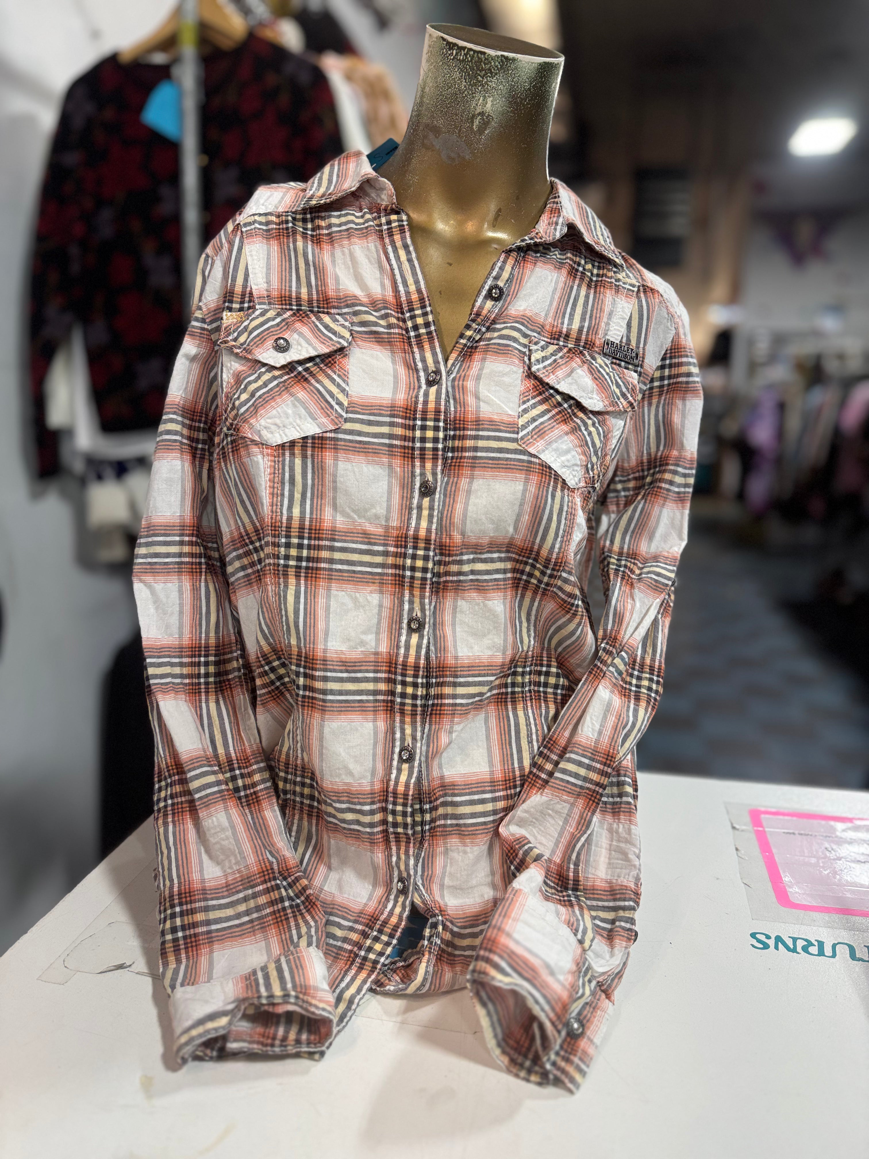 Harley Davidson Orange Plaid Long Sleeve Button Up Size Small