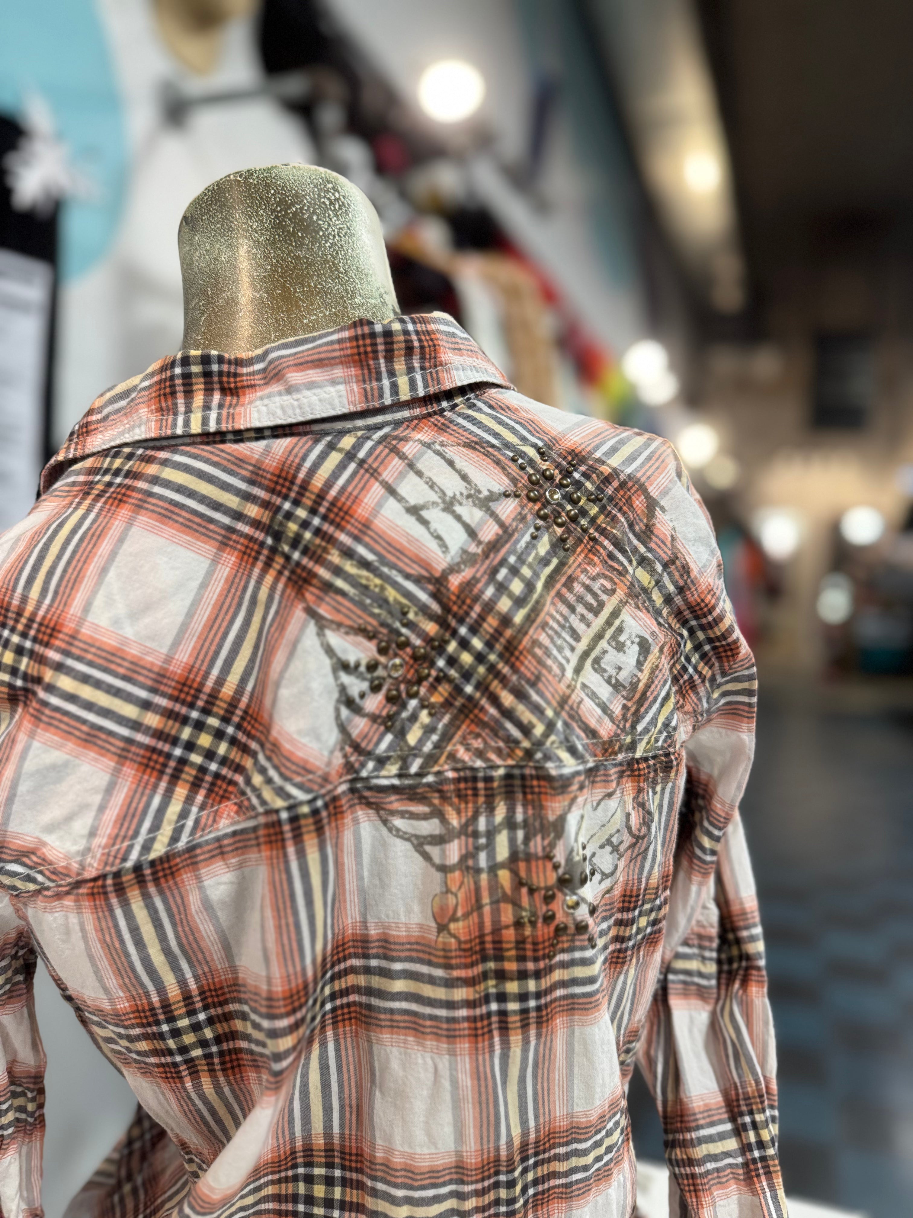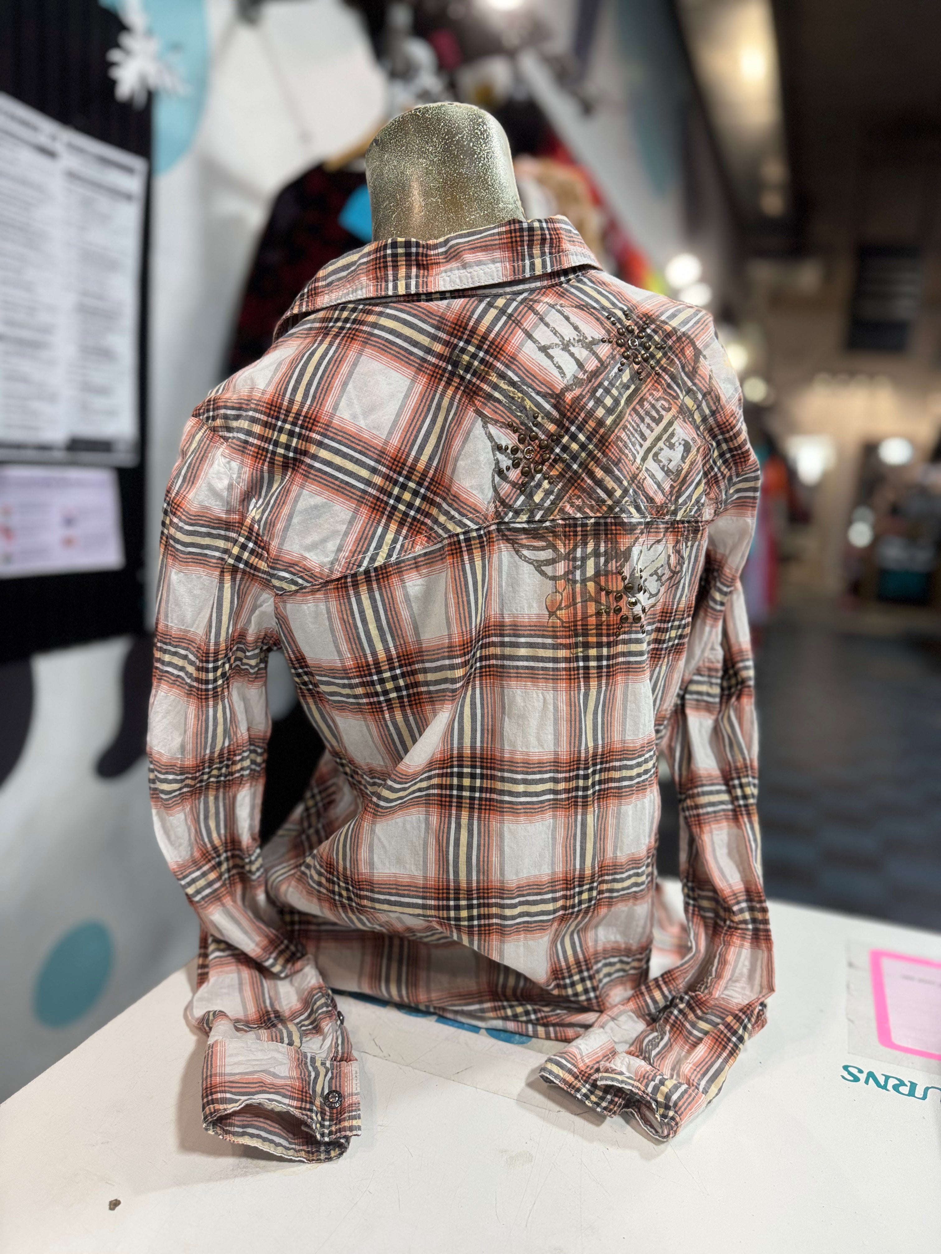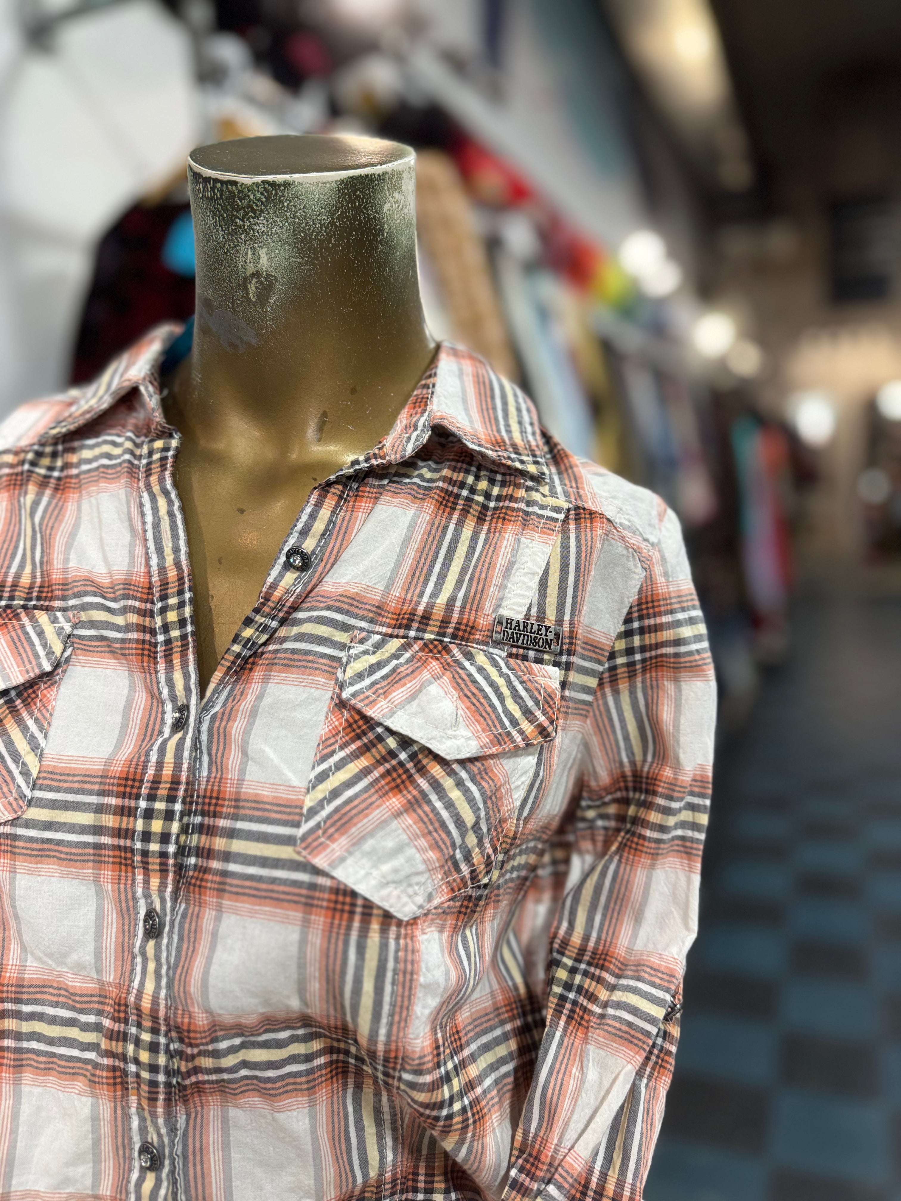 Description: Harley Davidson Orange Plaid Long Sleeve Button Up