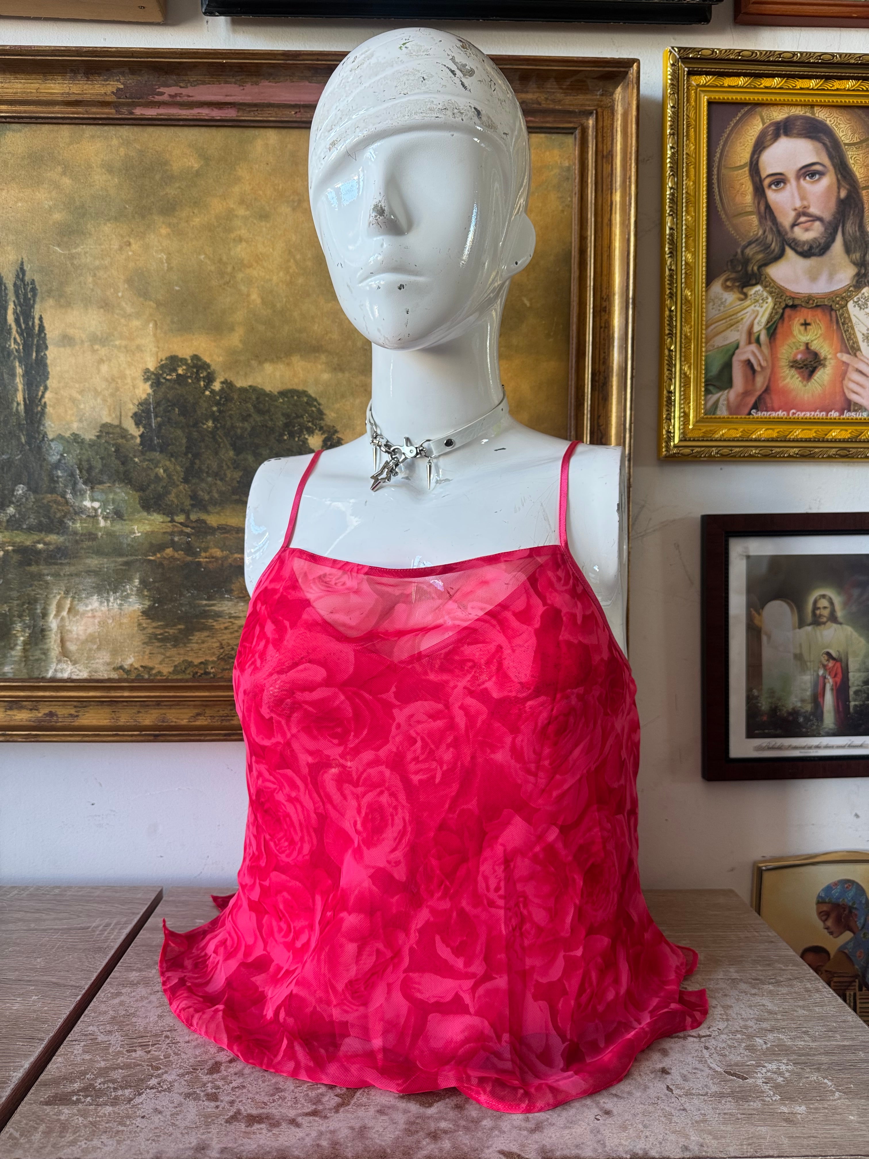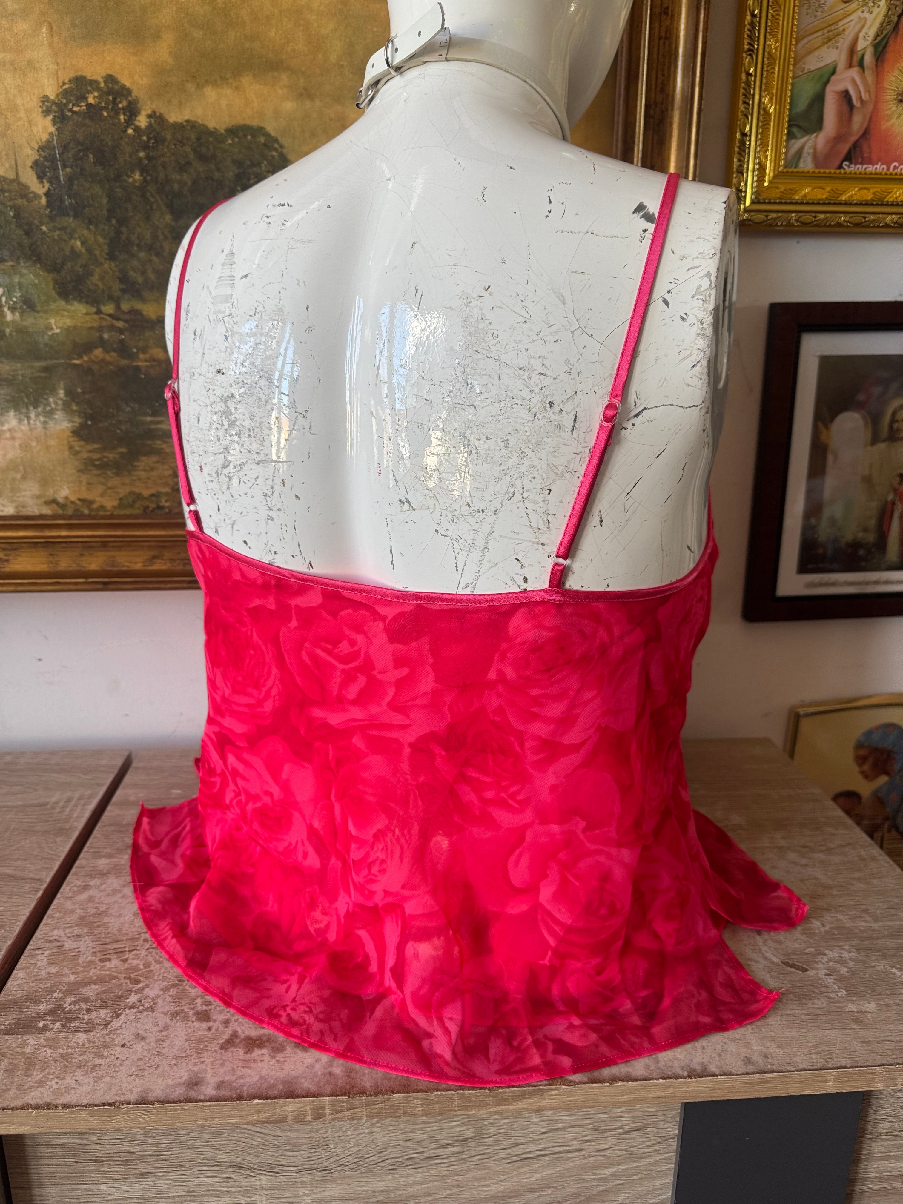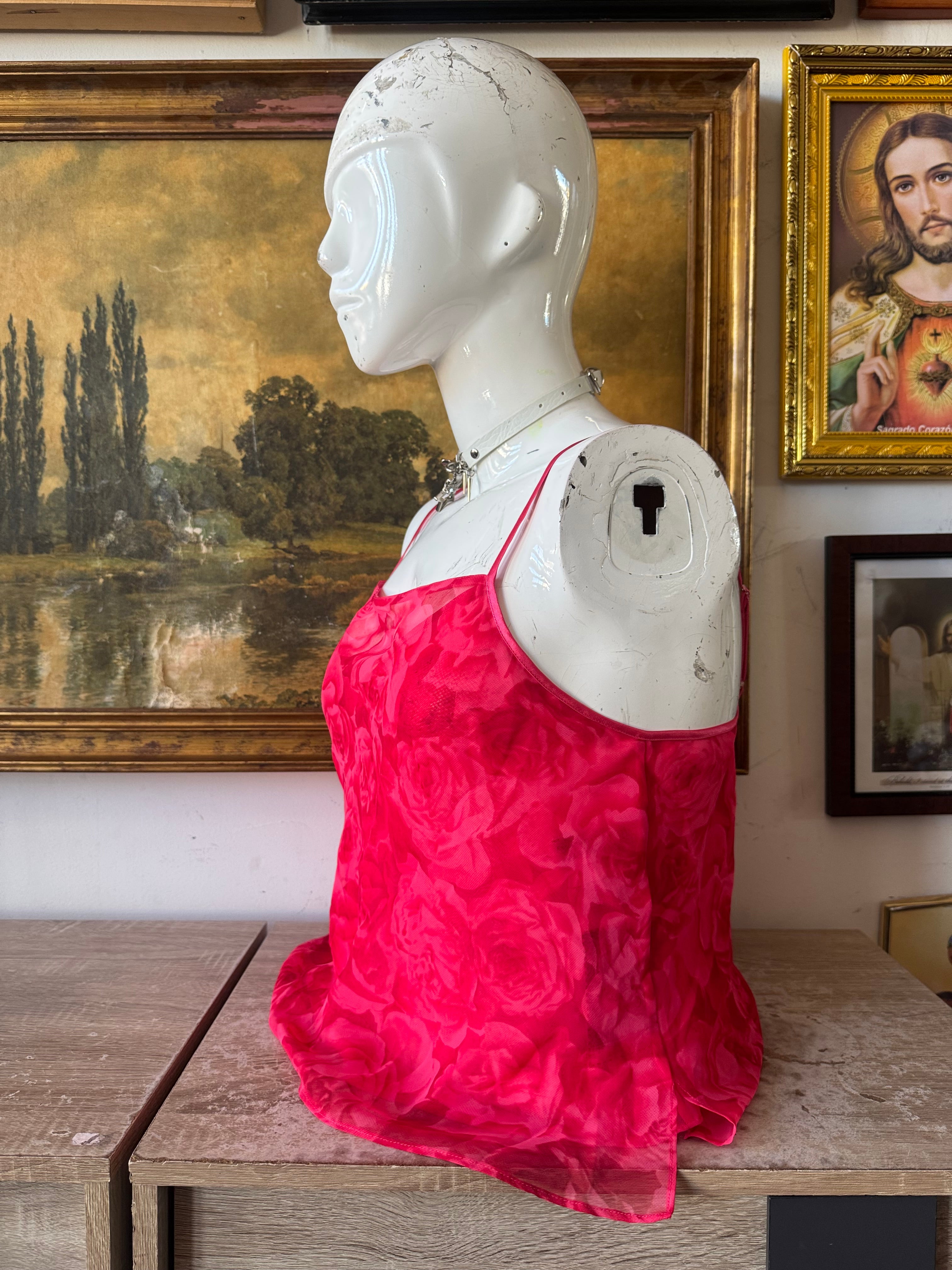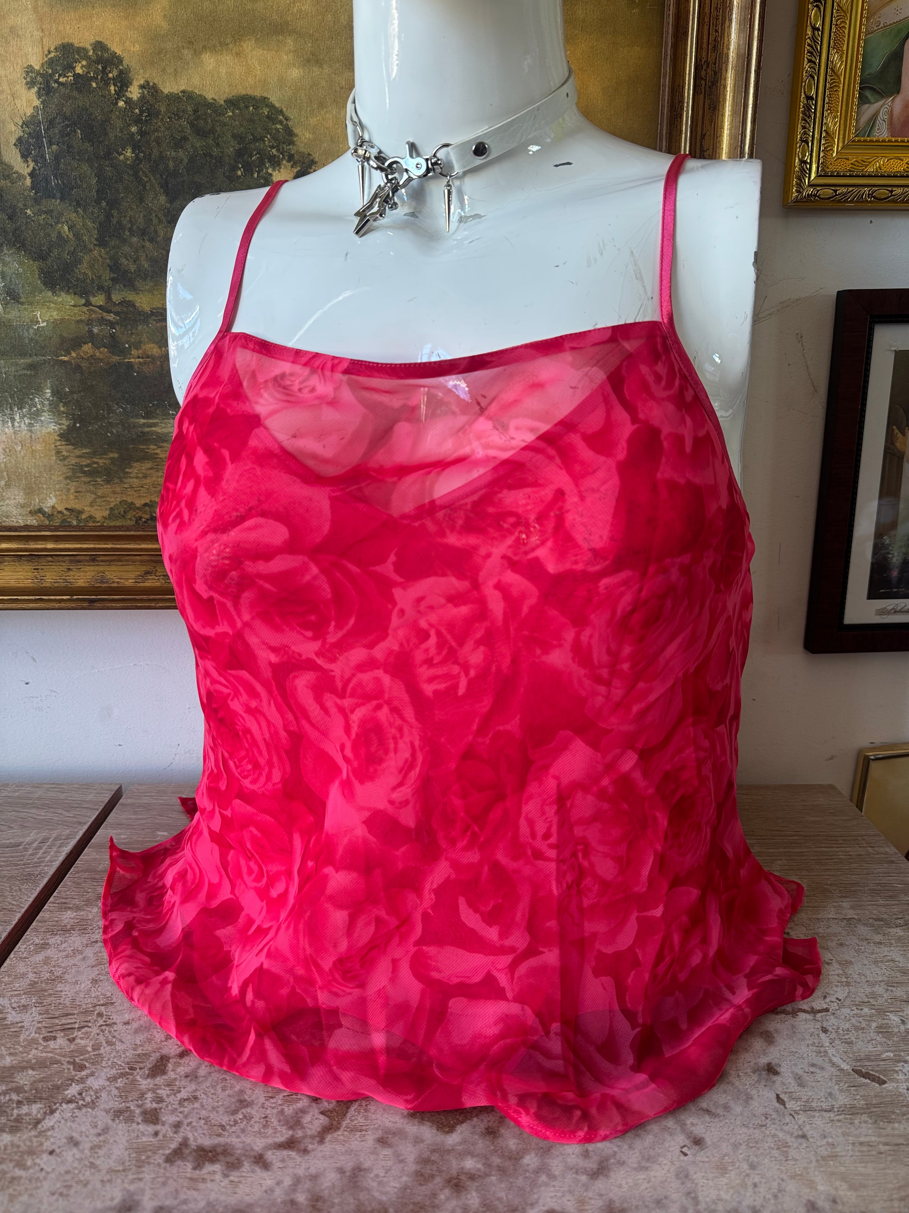 Y2k Pink Sheer Rose Print Overlay Tank Top Size L