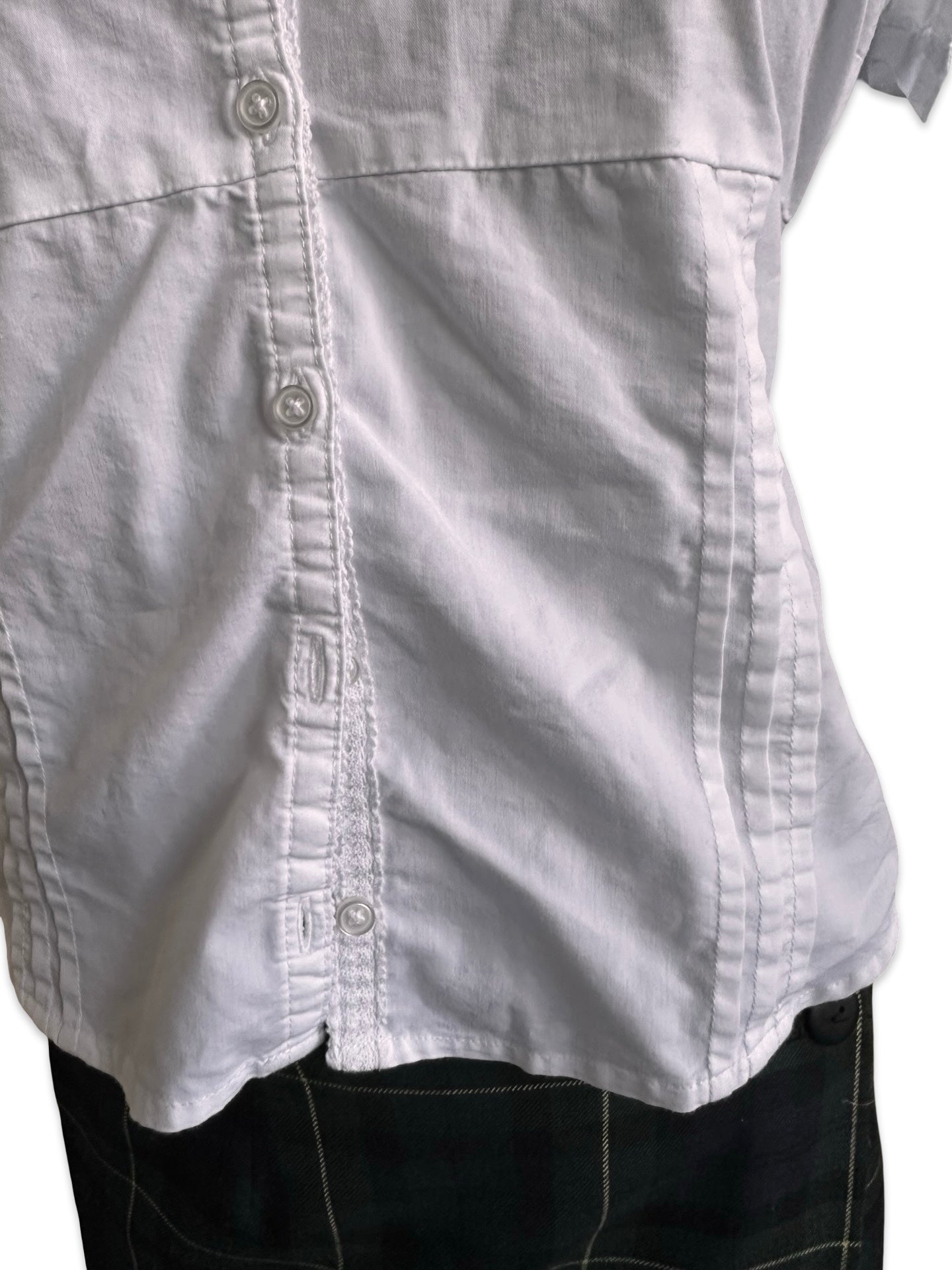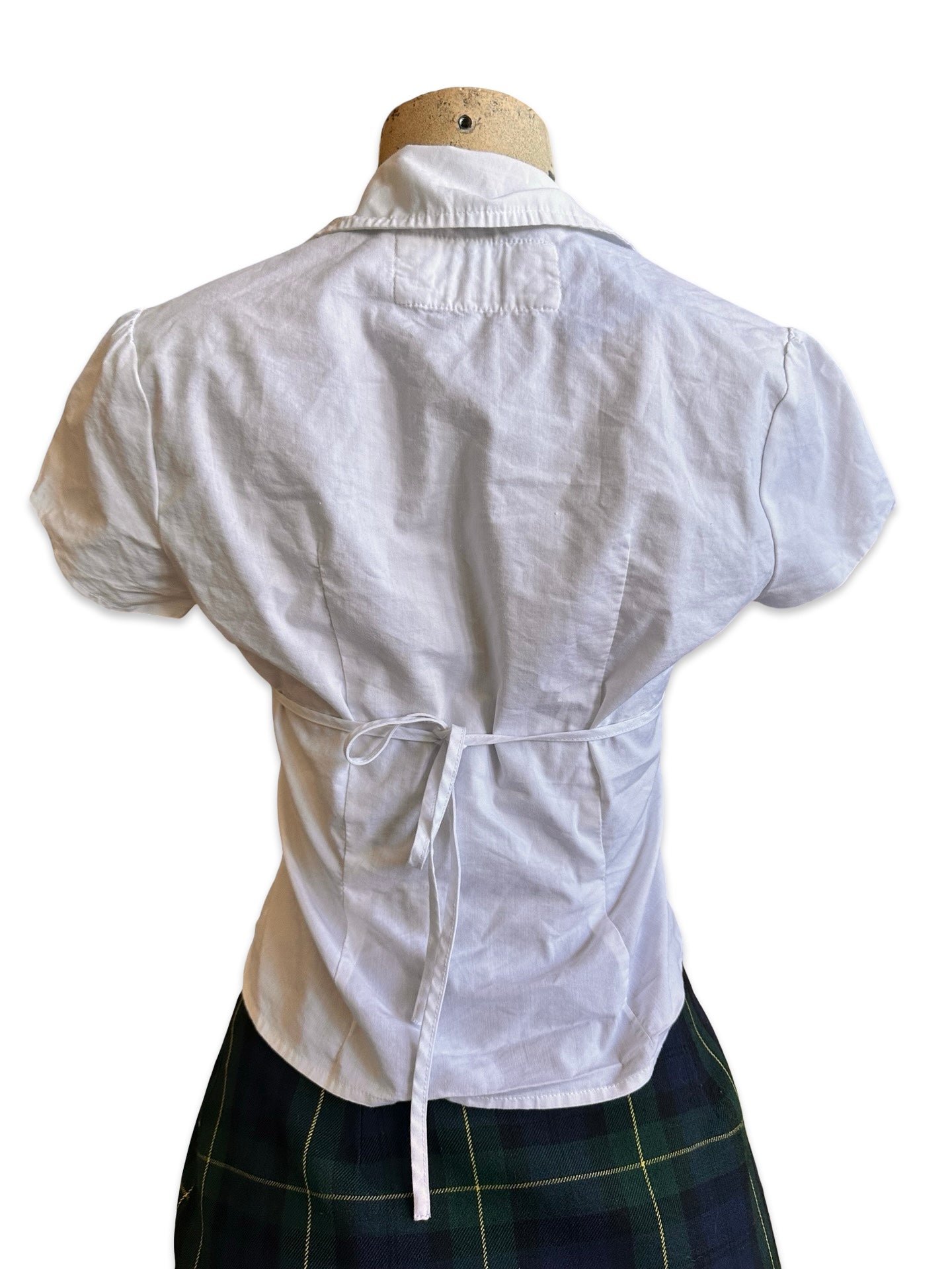 Description: Hollister Fitted White Baby Doll Button Up. Featuring pleats and tie back.