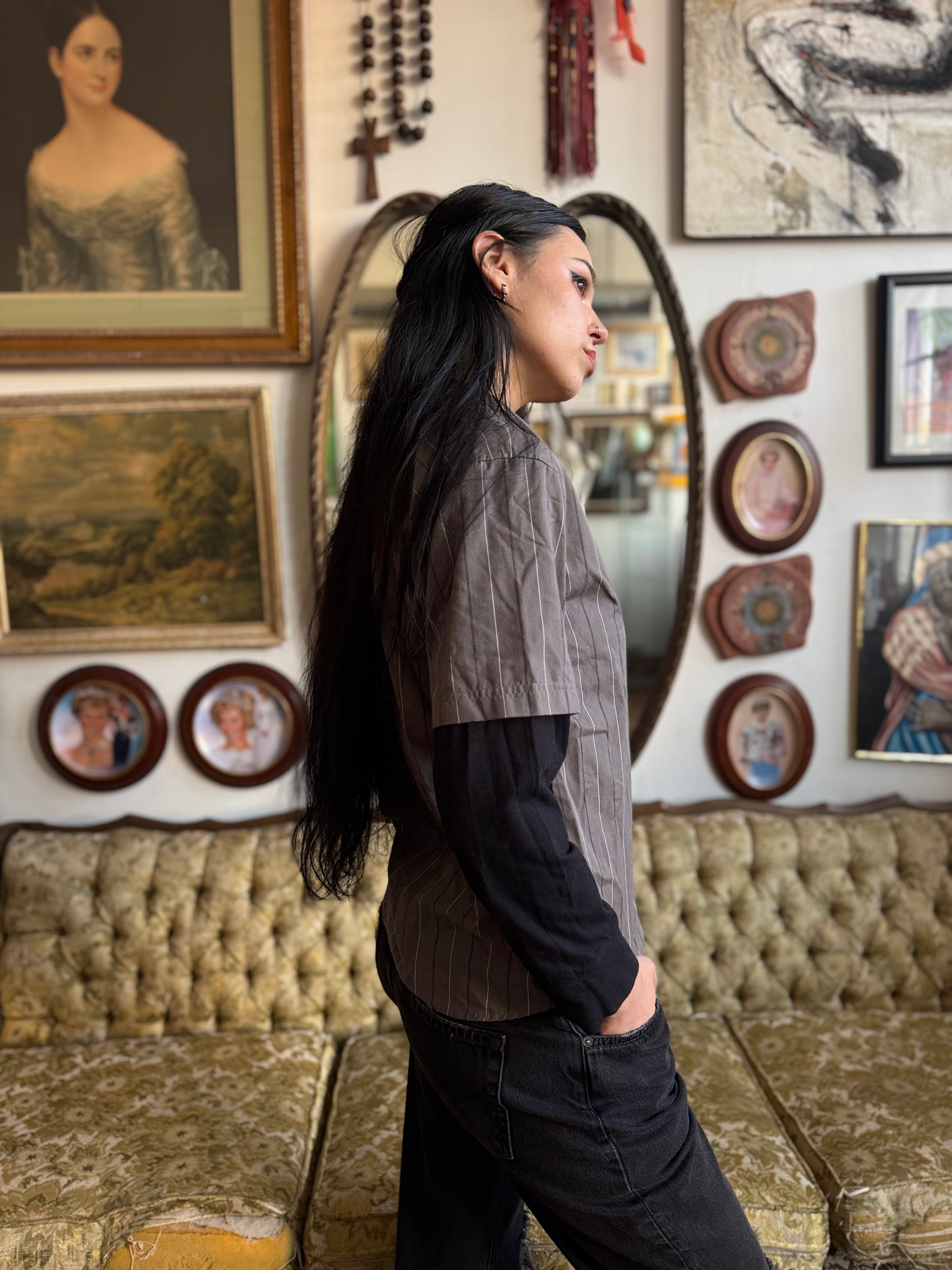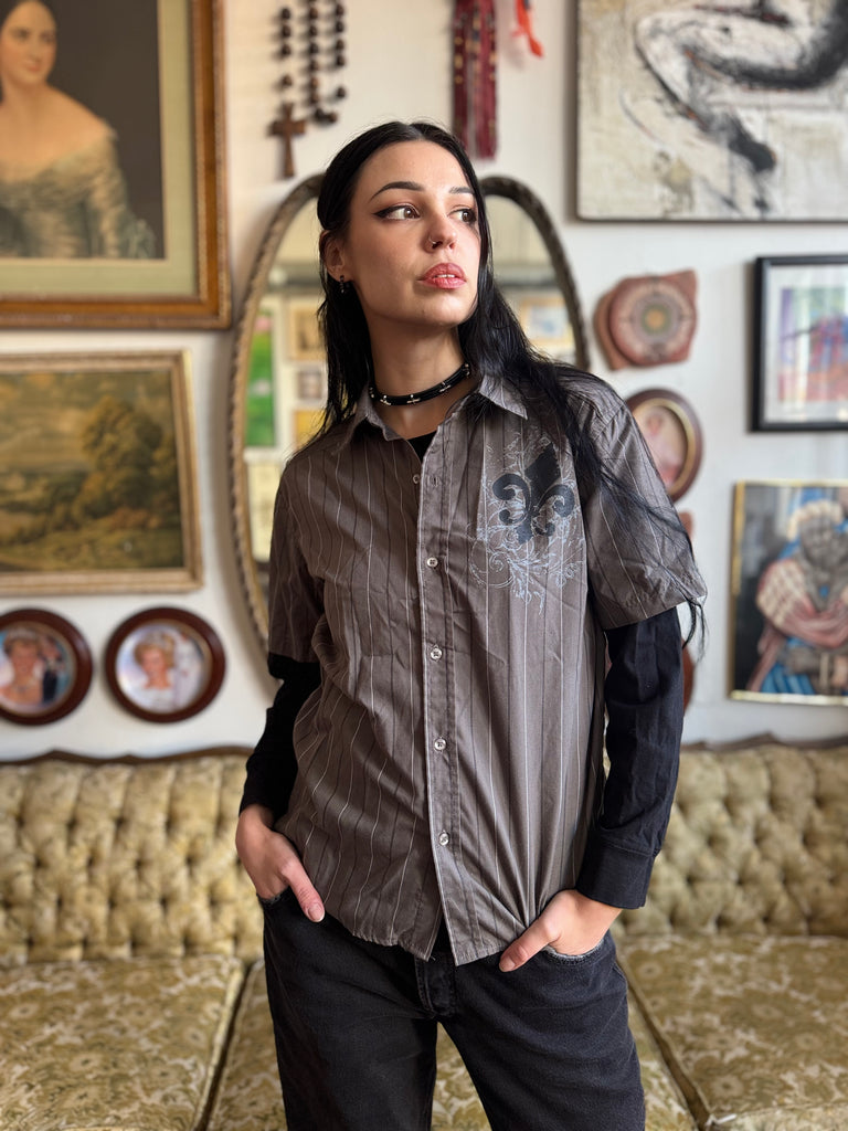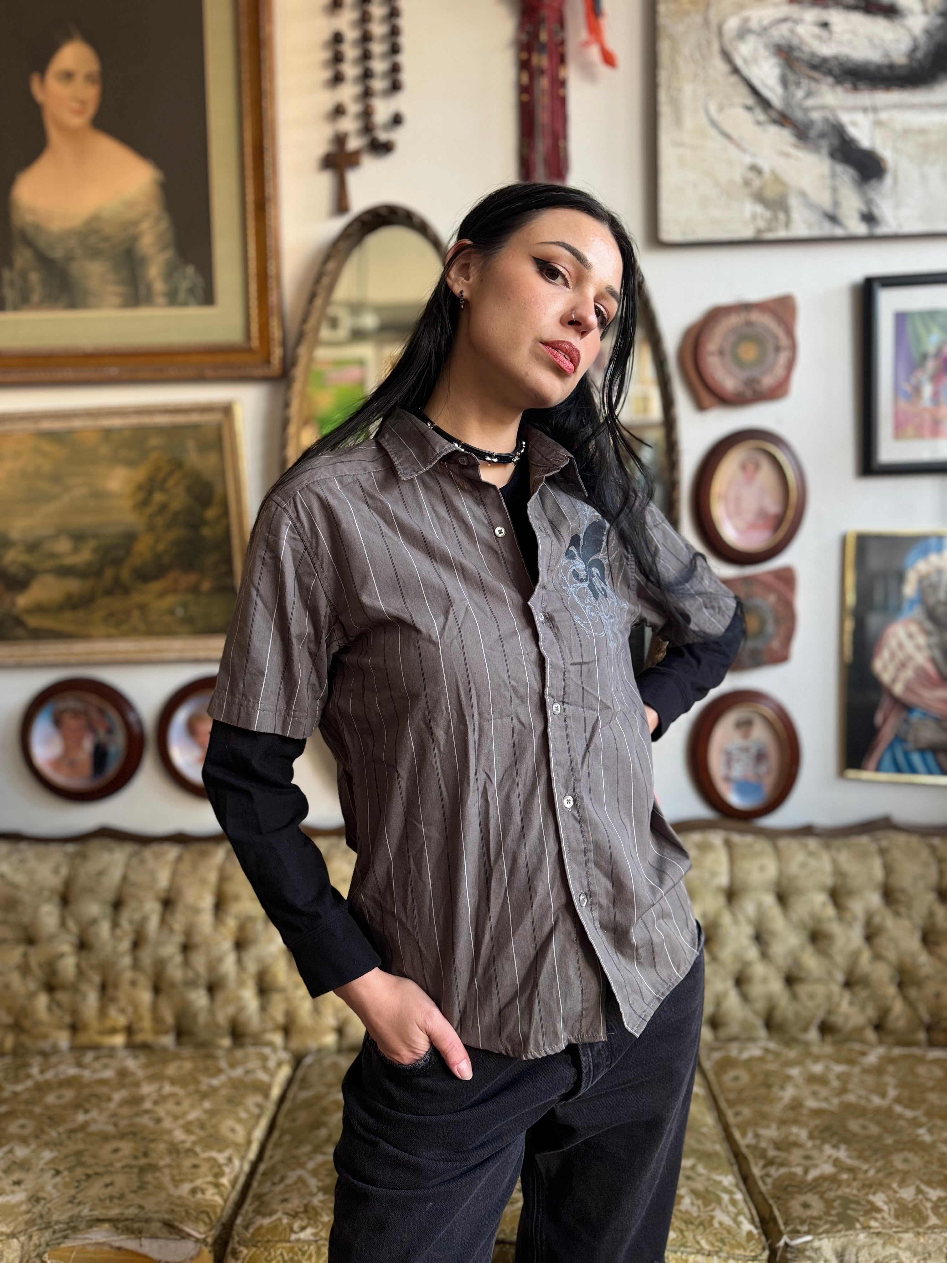 2010 Gray Fleur de Lise Pinstripe Button Front Top w Black Long Sleeves Size S