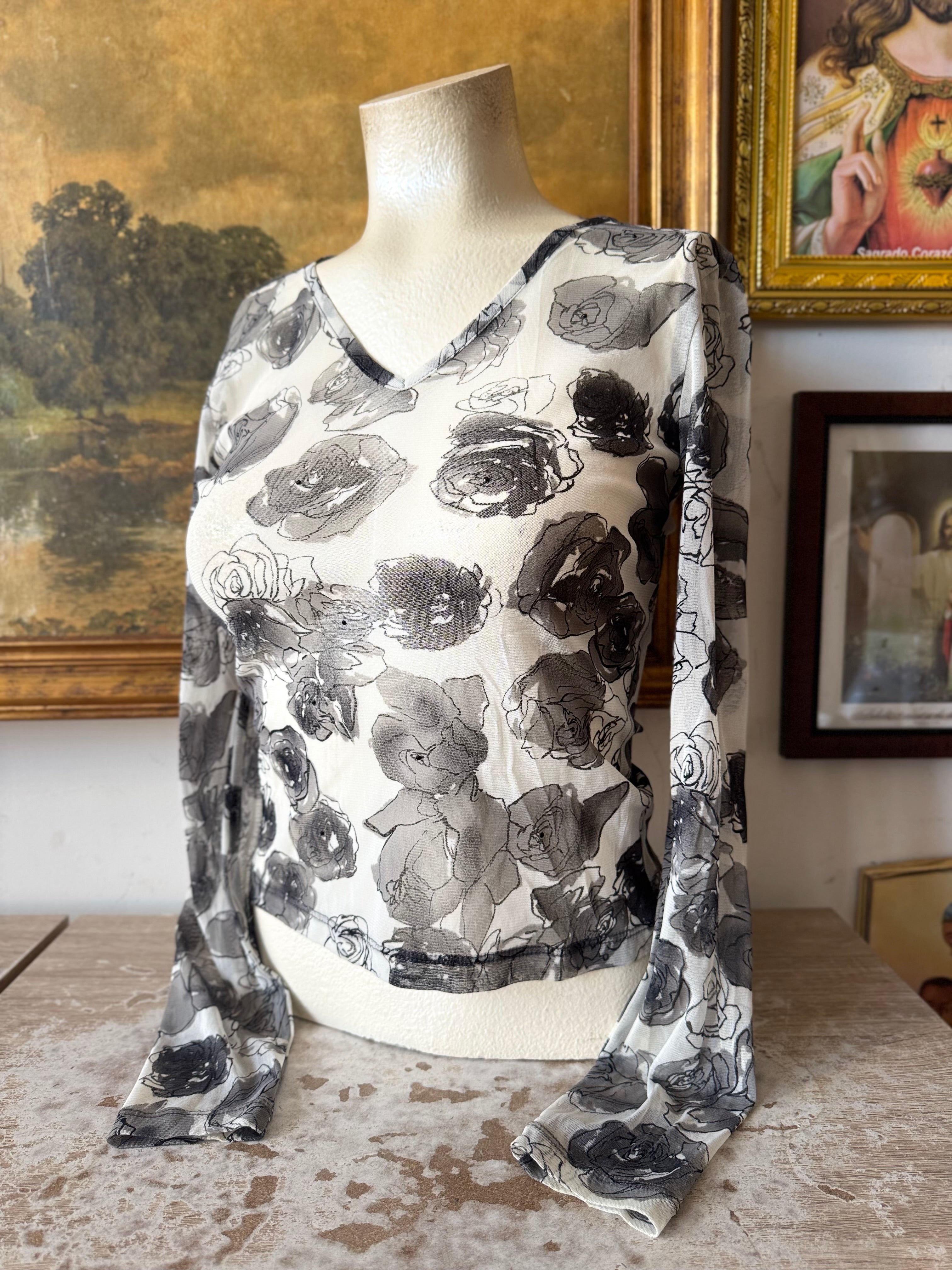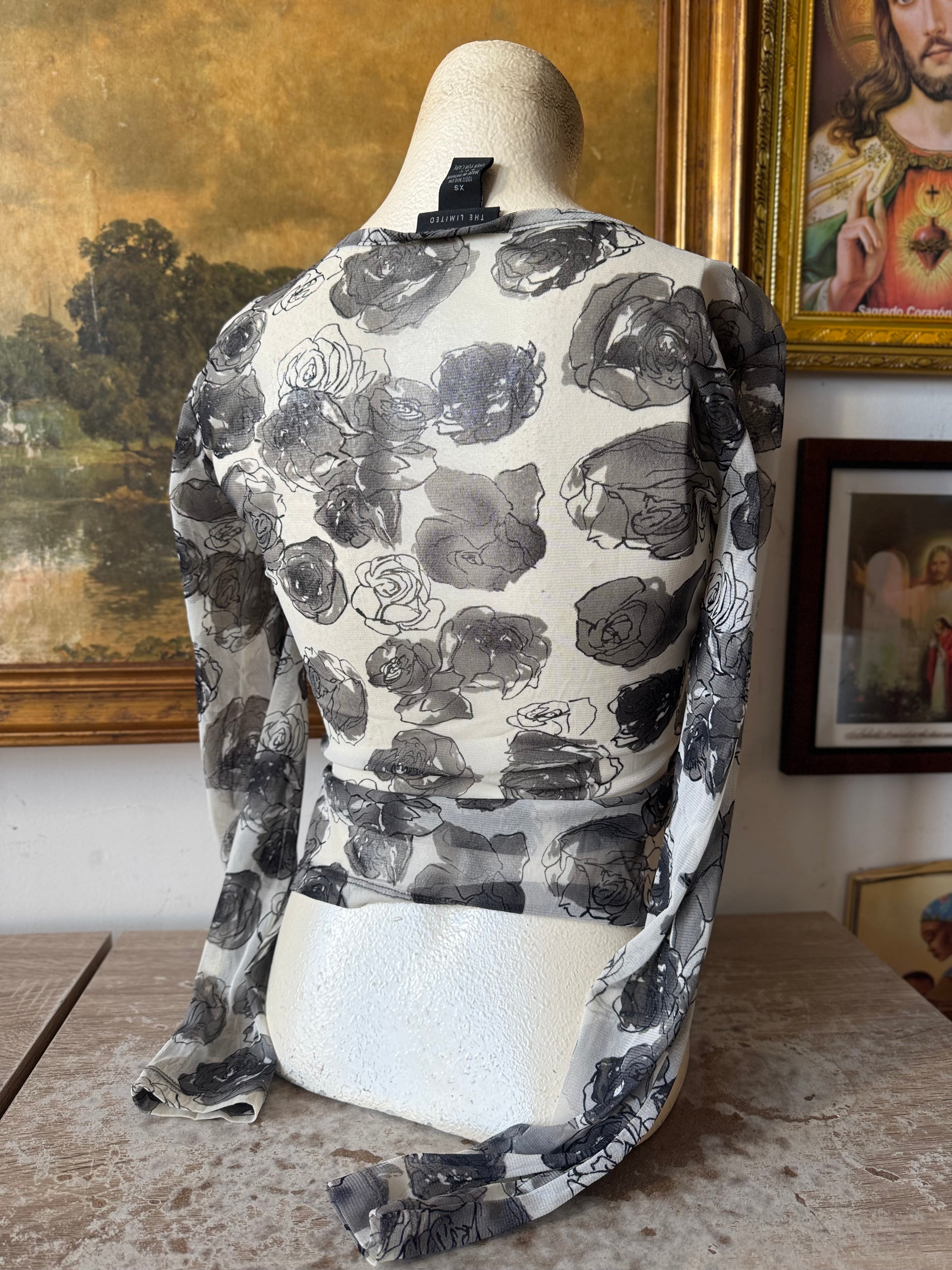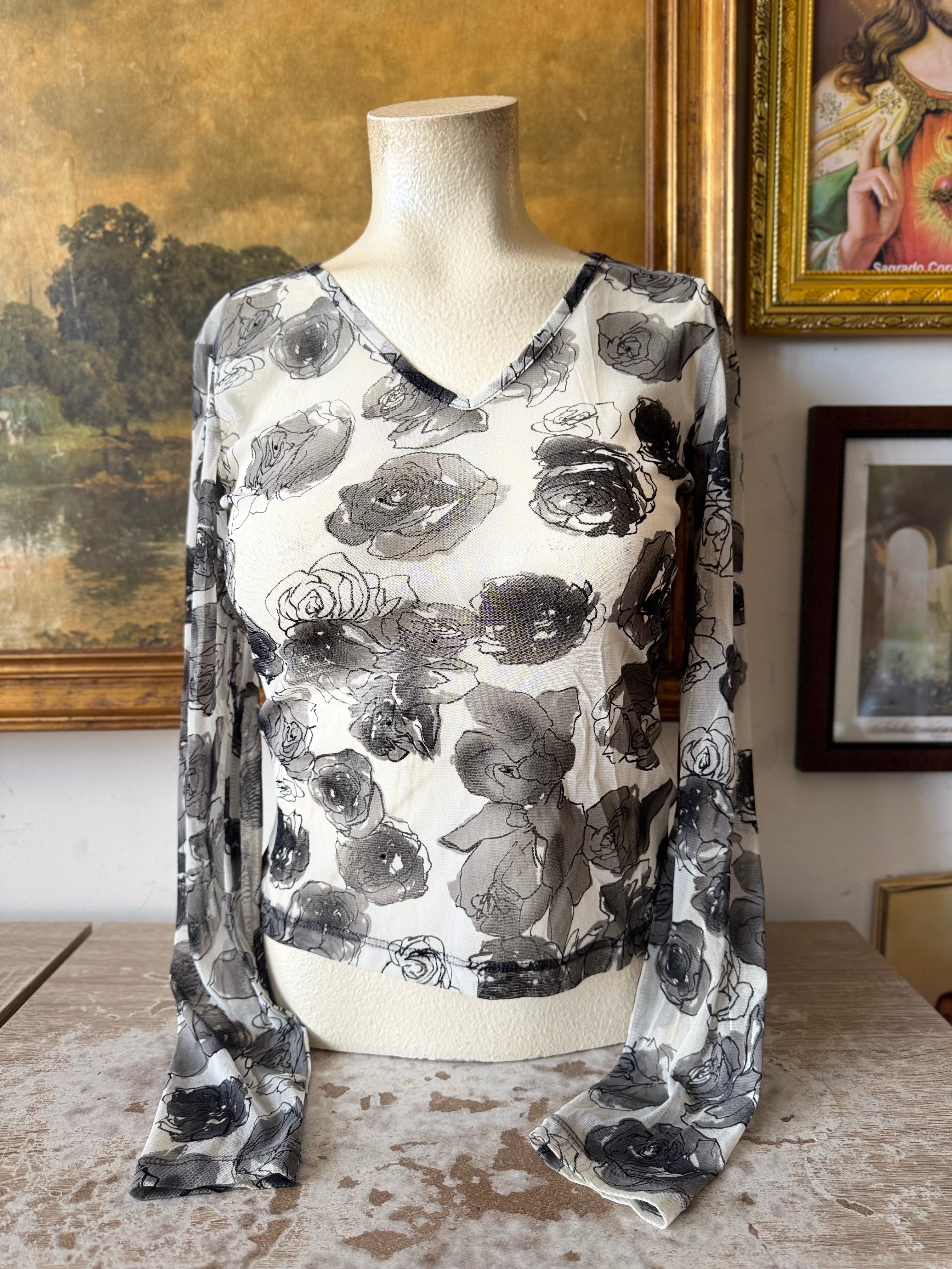 Y2K Rose Graphic Sheer Long Sleeve Blouse w V Neck Size XS by LIMITED