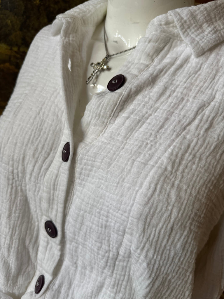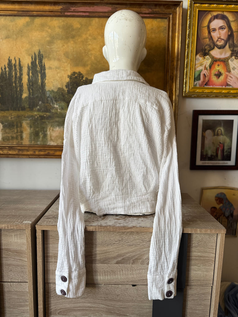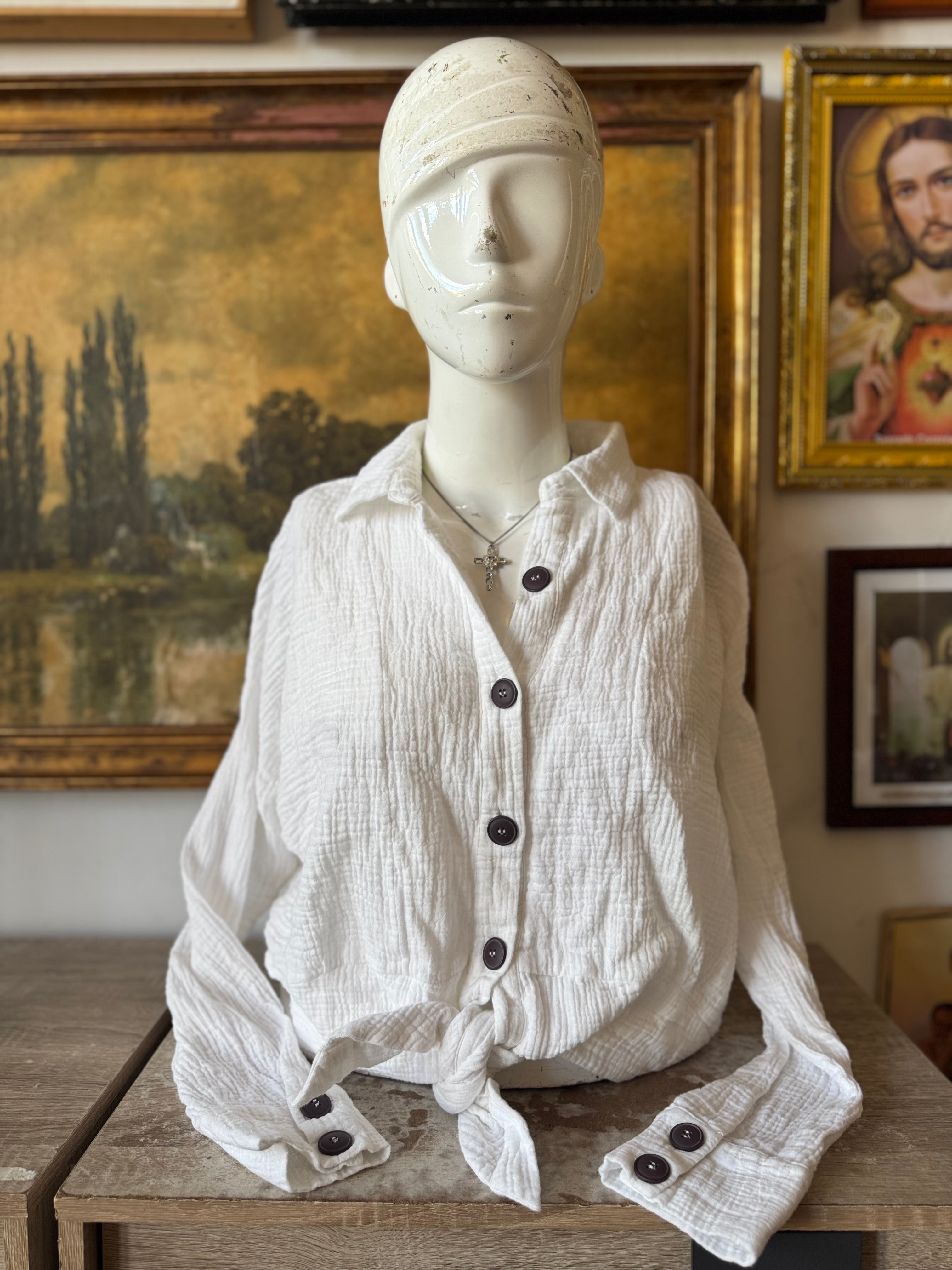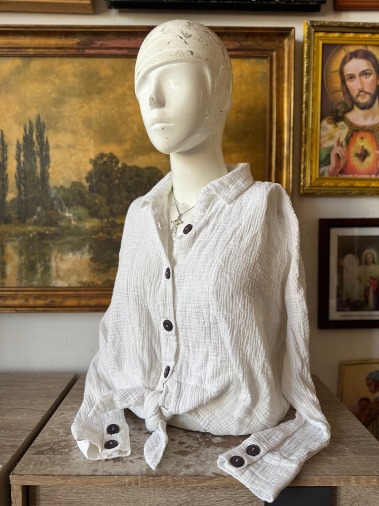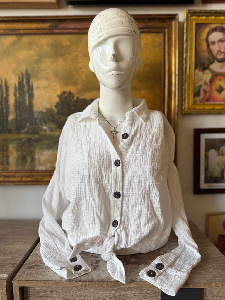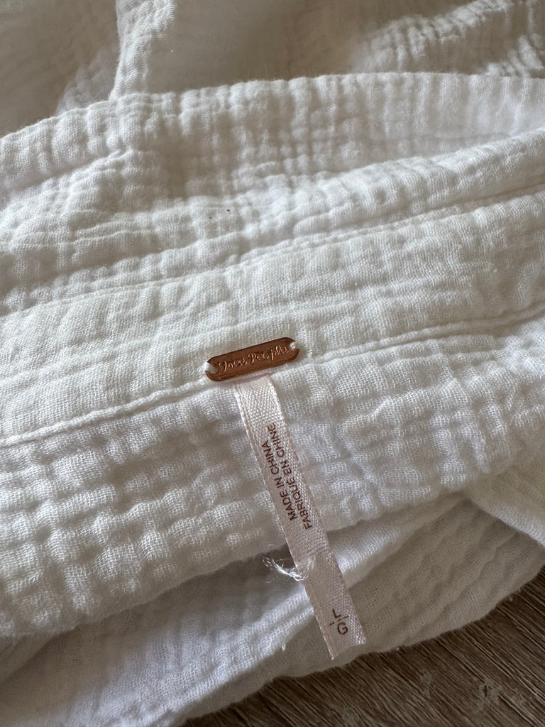 Description: This Free People size L top features a button front, perfect for casual wear. With this top, you can easily dress up or down for any occasion. The tie front adds a touch of style, making it a versatile and fashionable addition to your wardrobe.