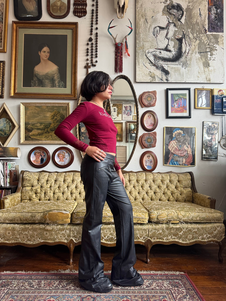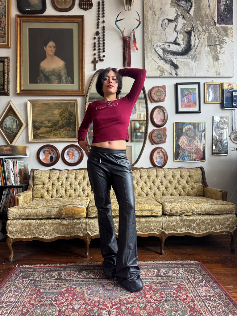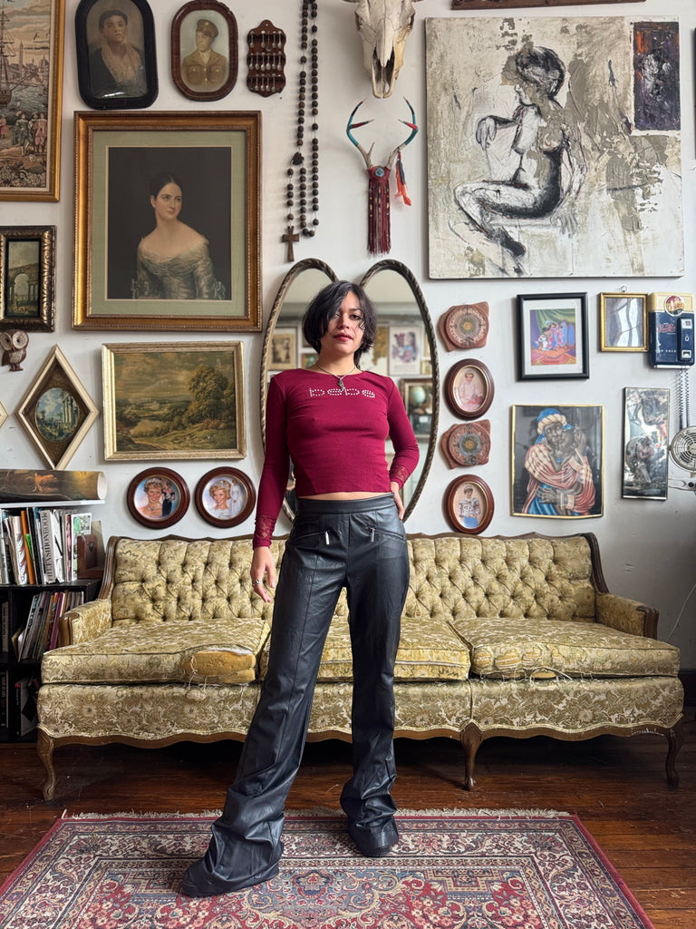 NWT Cranberry Bedazzled Bebe Logo Top w Lace Sleeves Junior Ladies Size Small