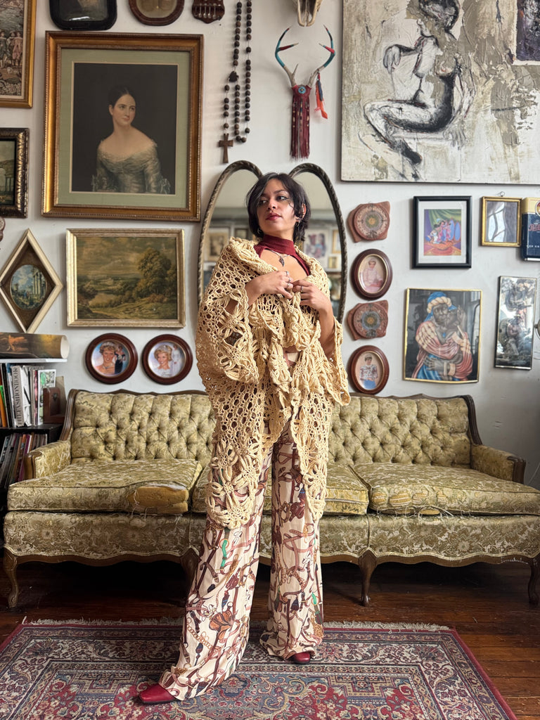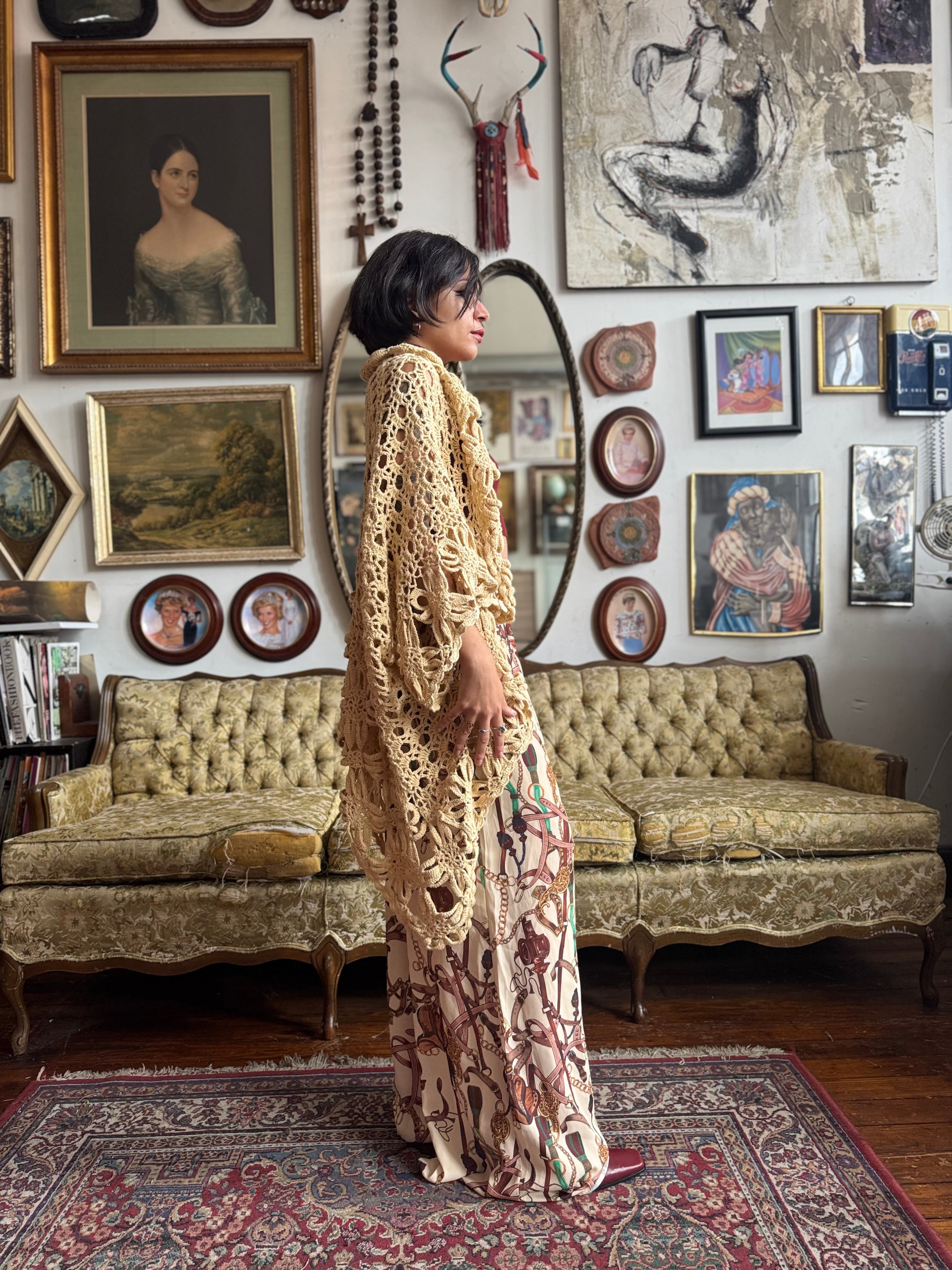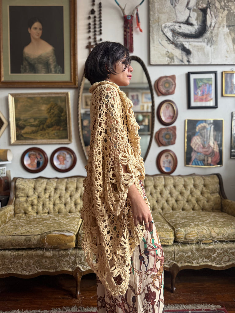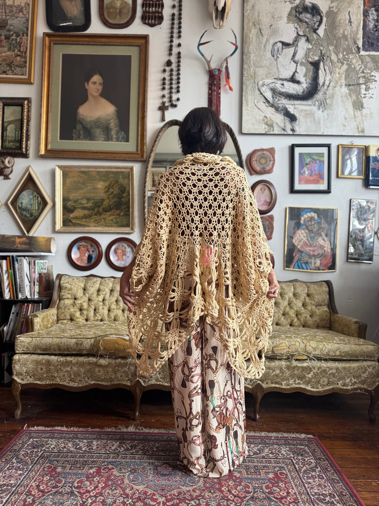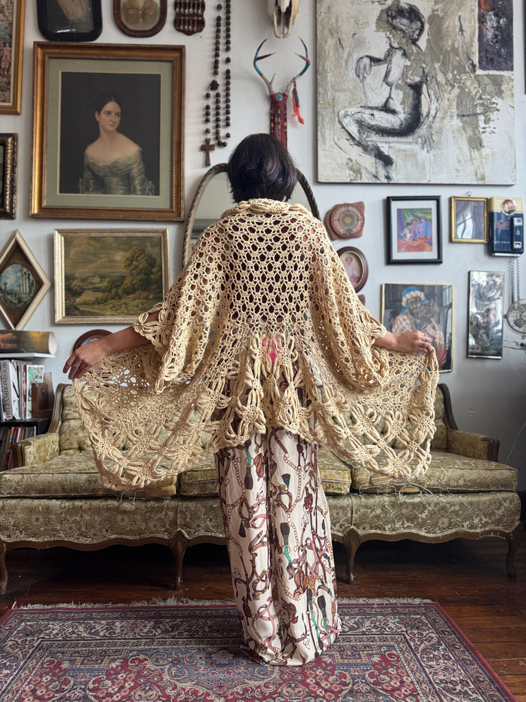 VTG Boho Light Yellow Knit Daisy Shawl w Arm Openings by Cami One Size Fits Most