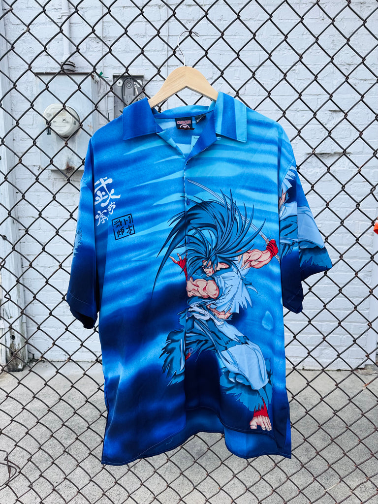 Blue Y2K Anime All Over Print Short Sleeve Button Up Size Large