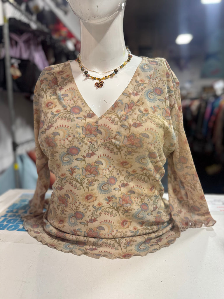 Y2K Mesh Boho Floral Print Quarter Sleeve Top Size Large