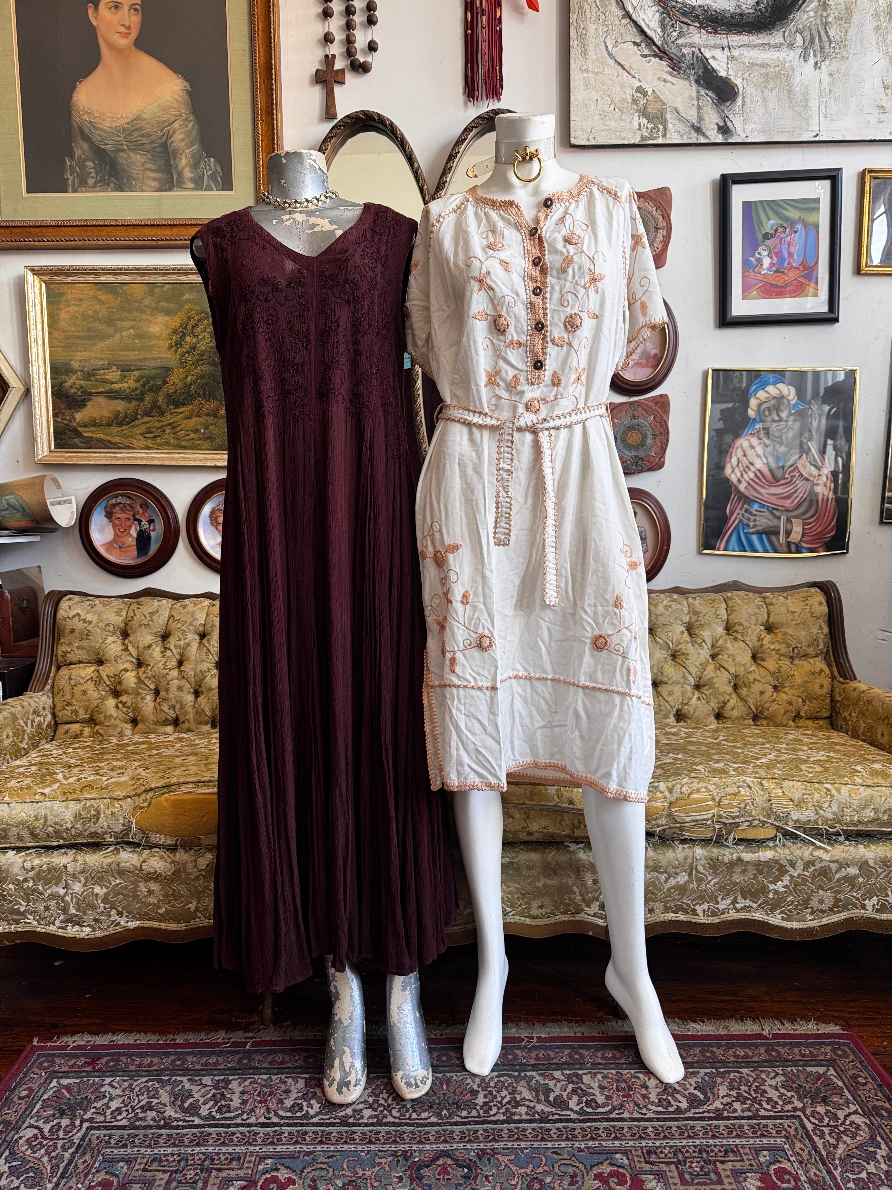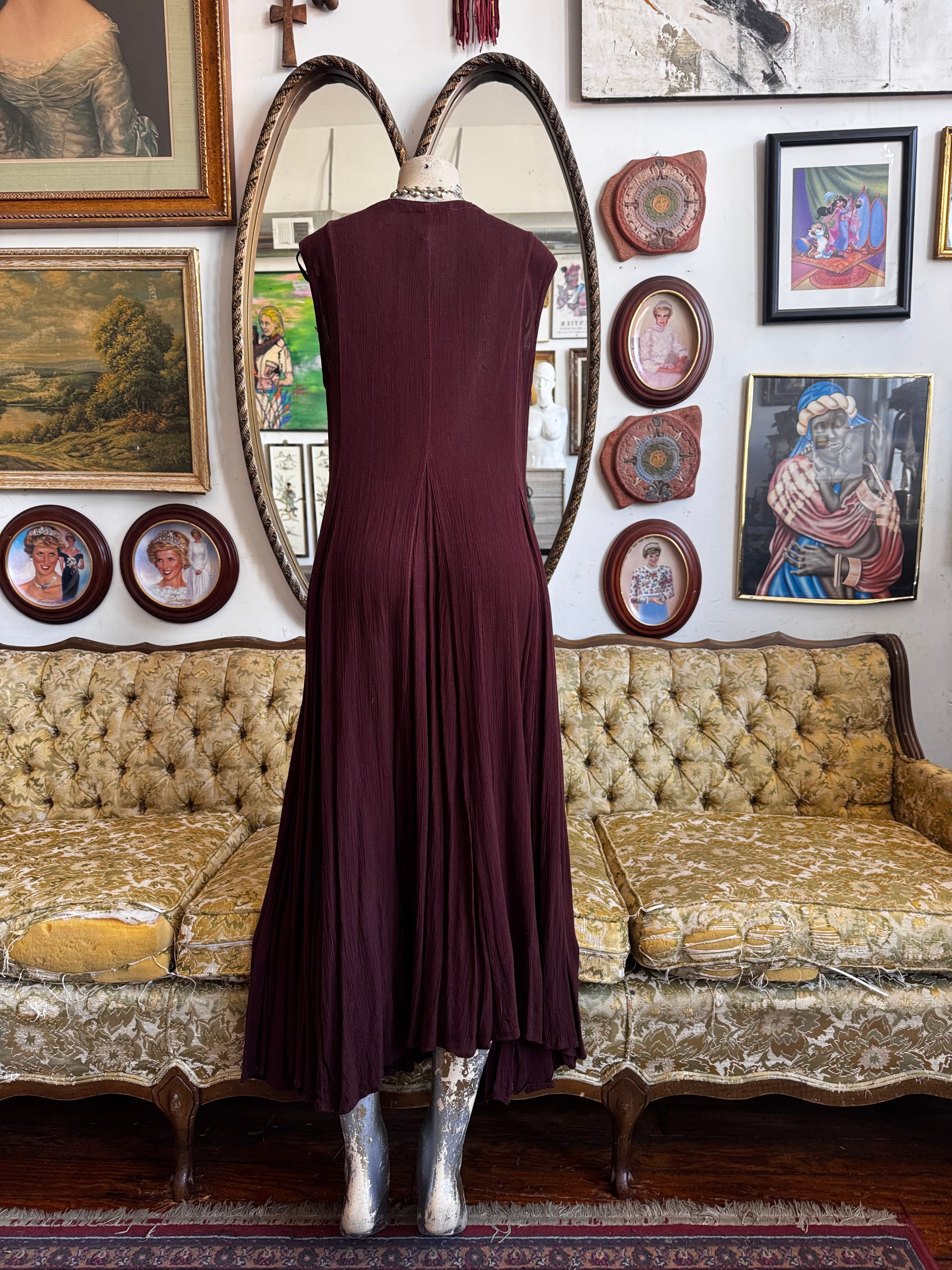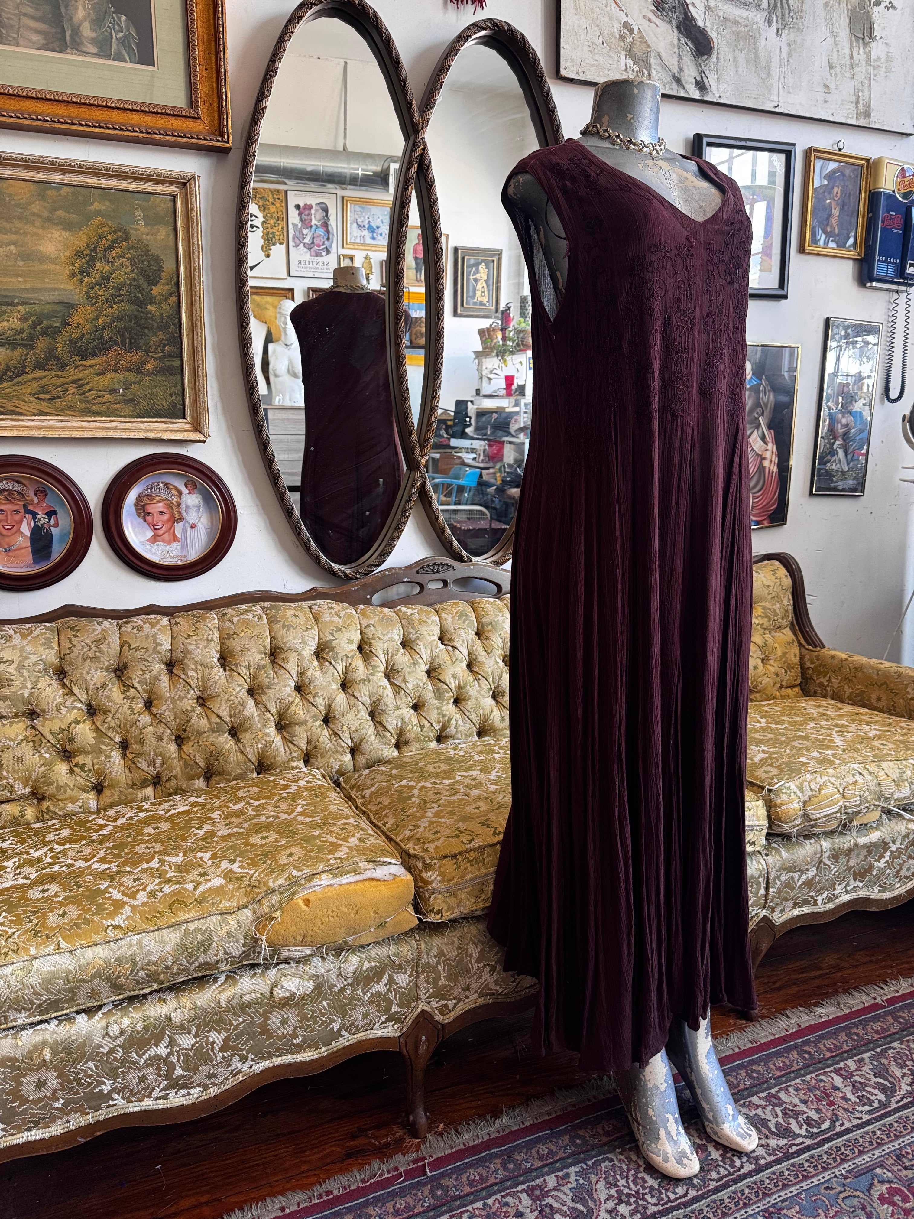 Description: 90s Brown Rayon Embroidered Maxi Dress Size S, SOLD AS-IS (missing embroidery)