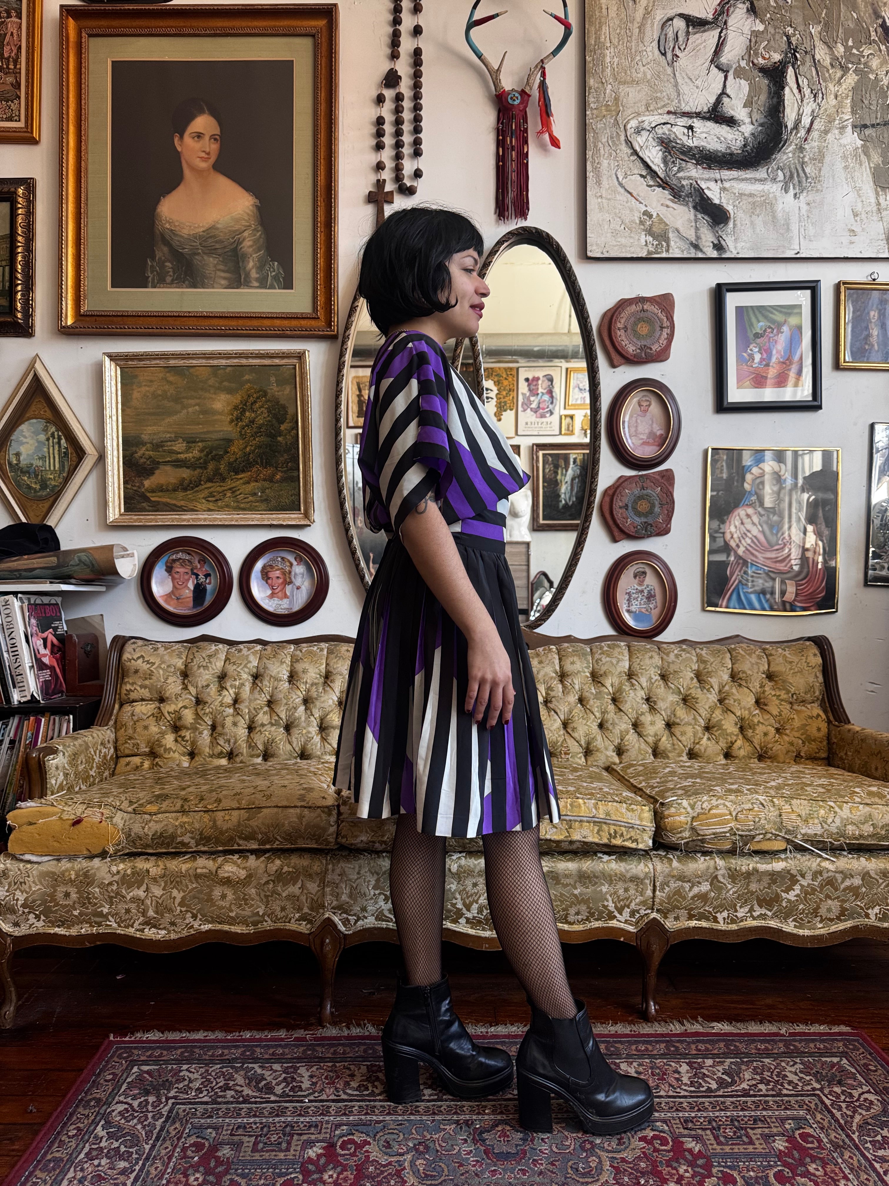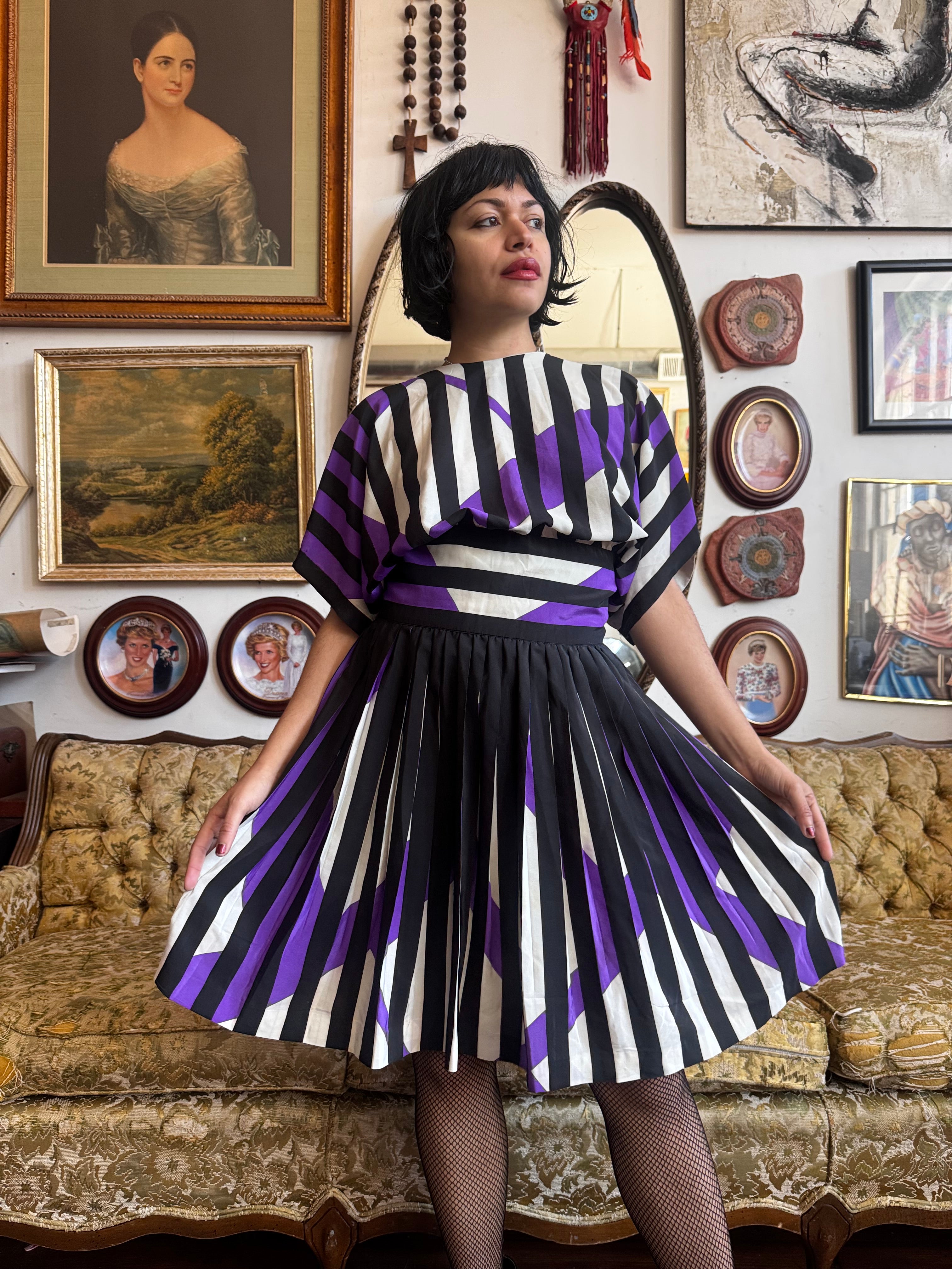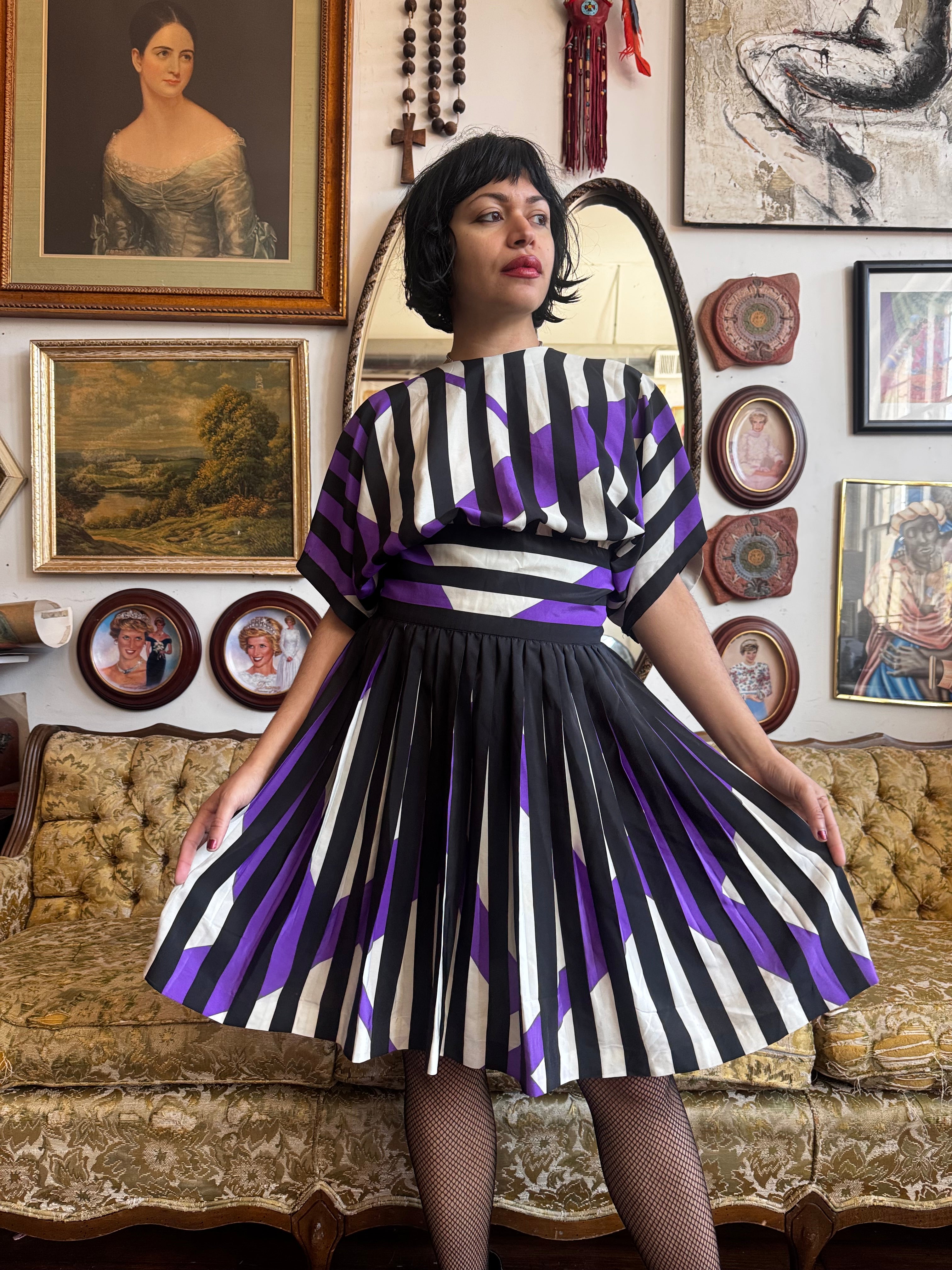 80s Vintage Pleated Button Back Graphic Dress Size M