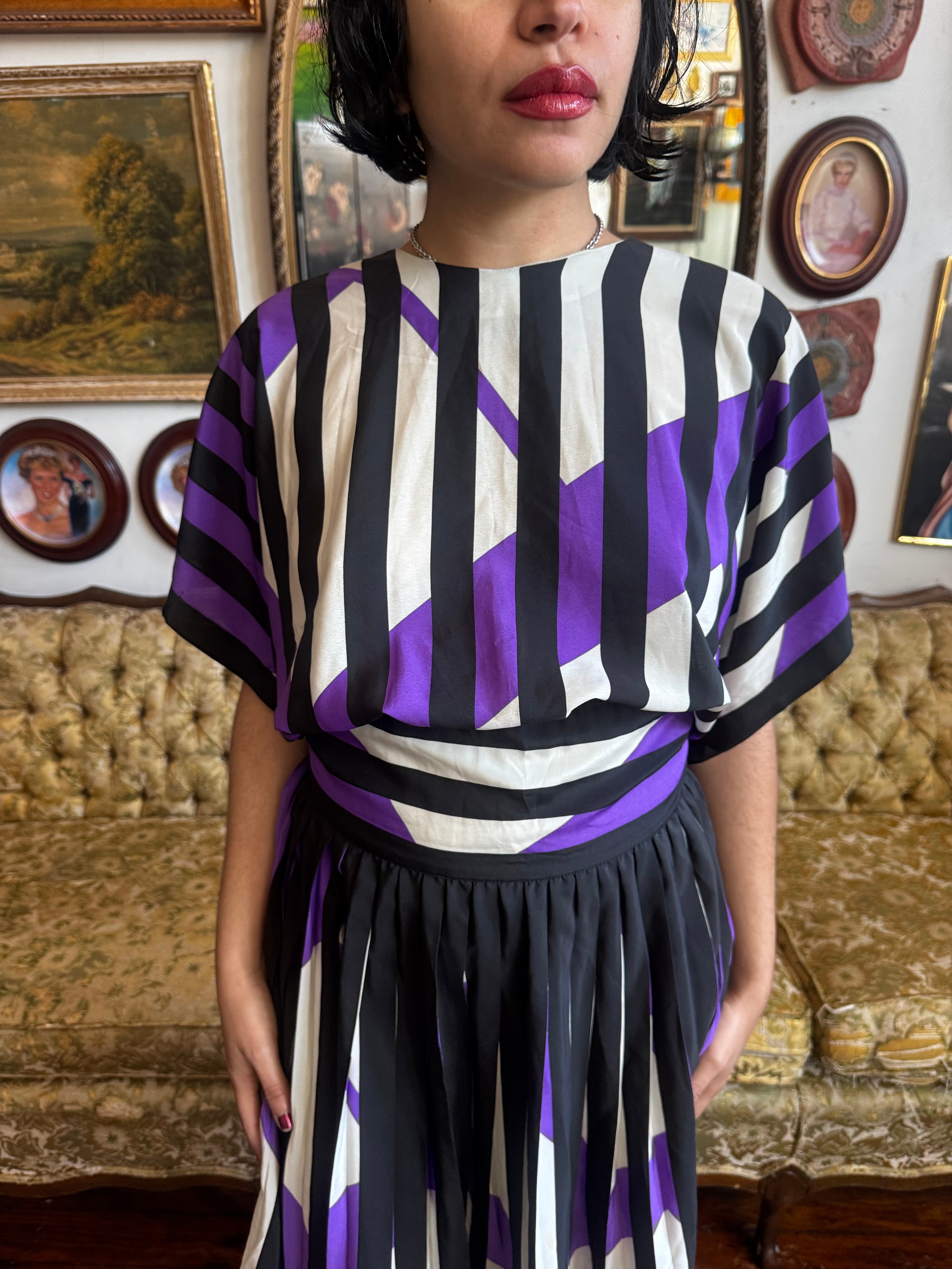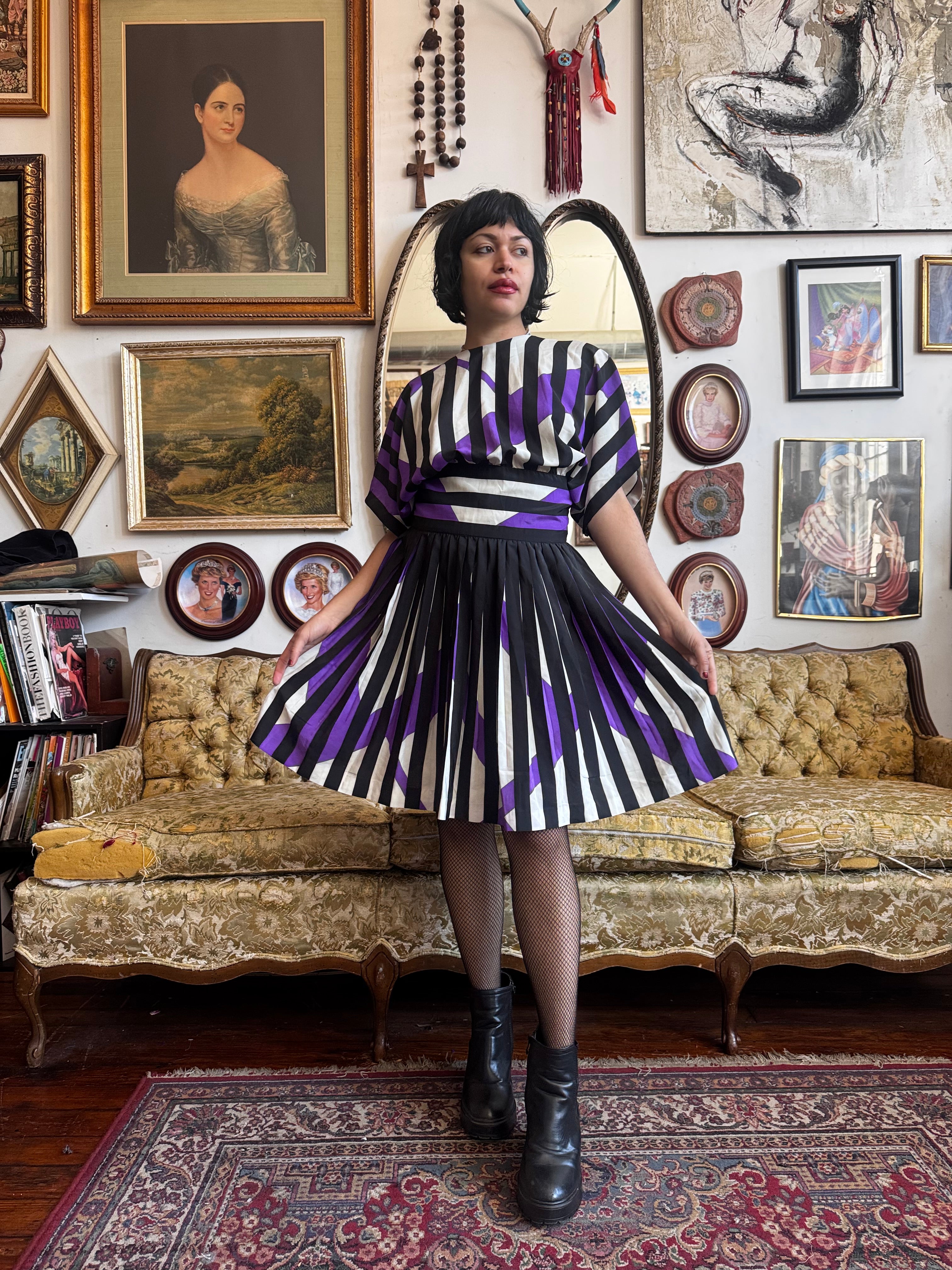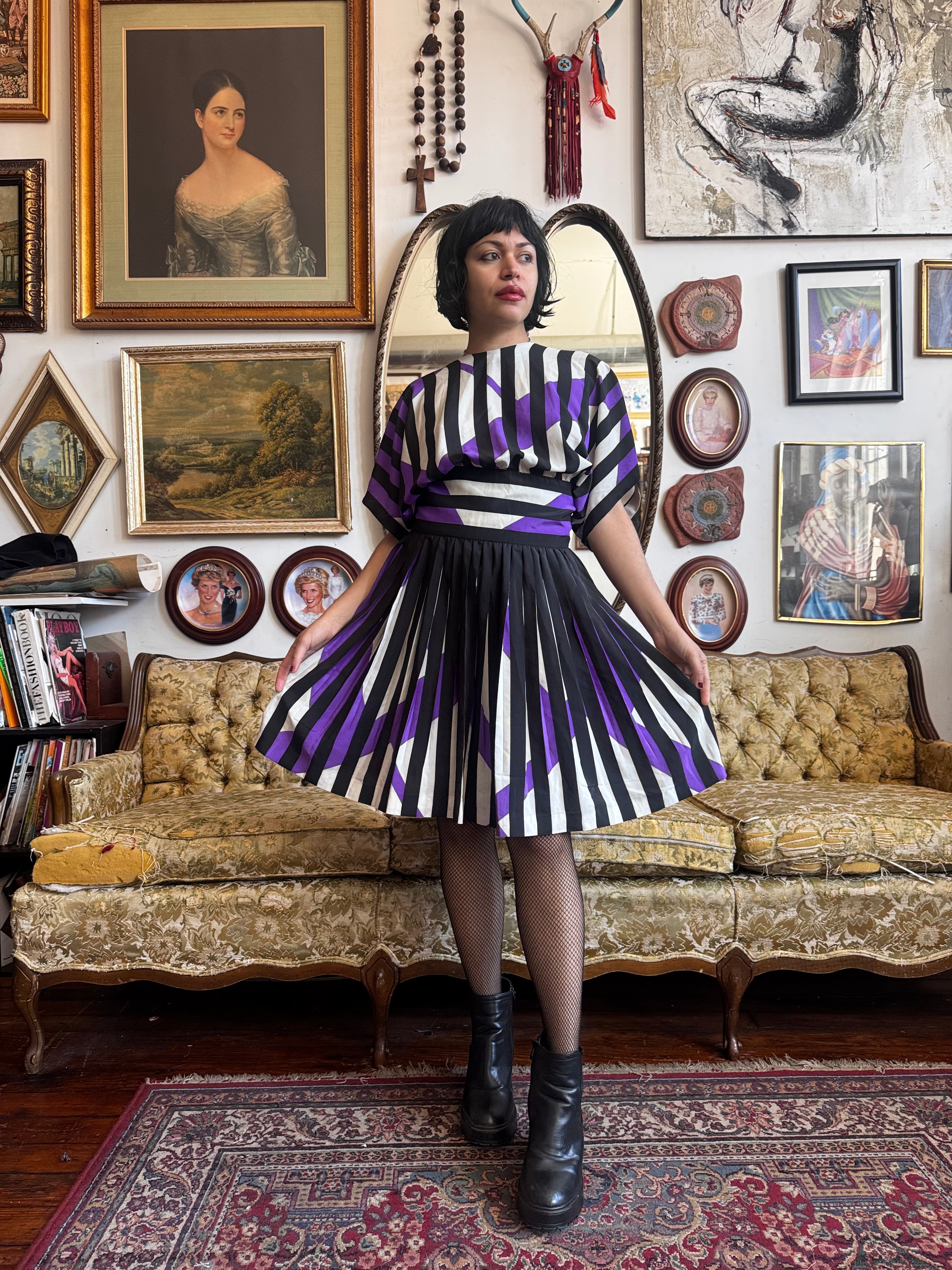 80s Vintage Pleated Button Back Graphic Dress Size M