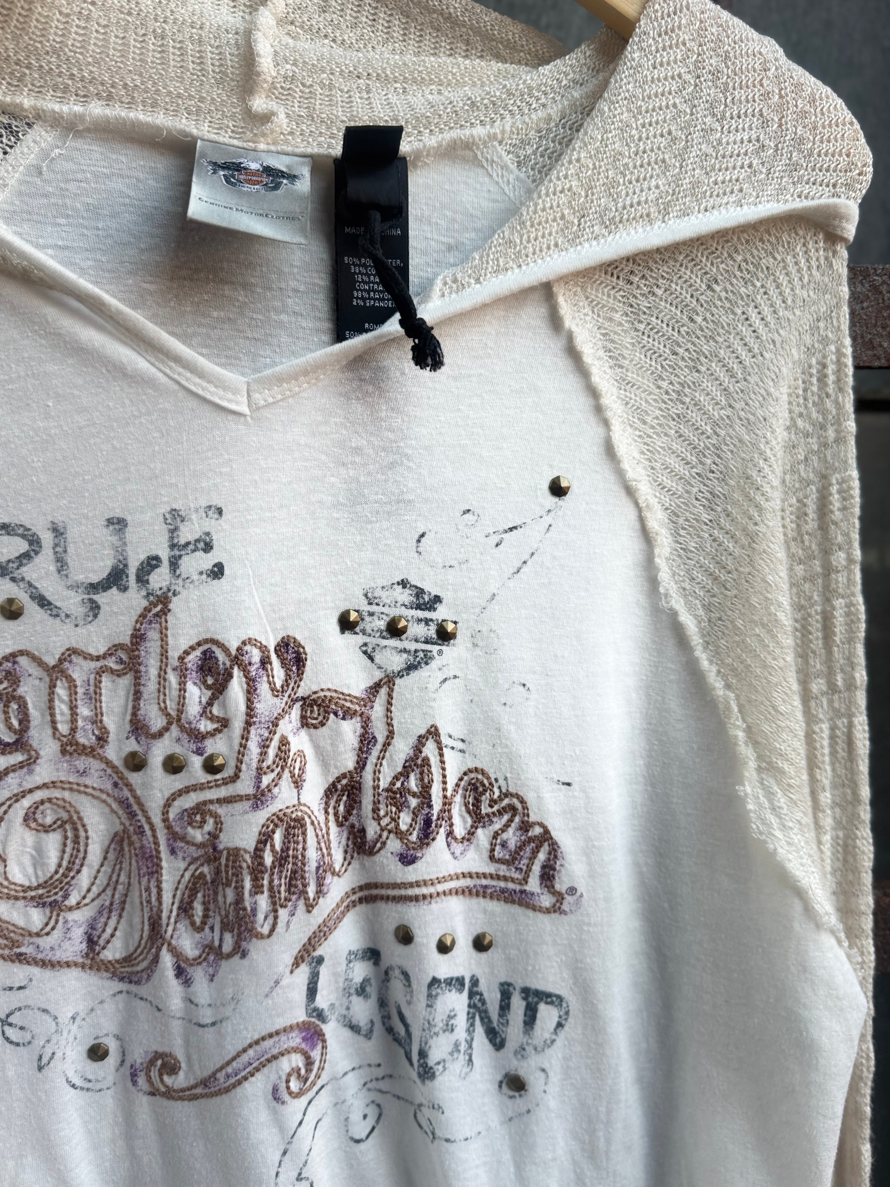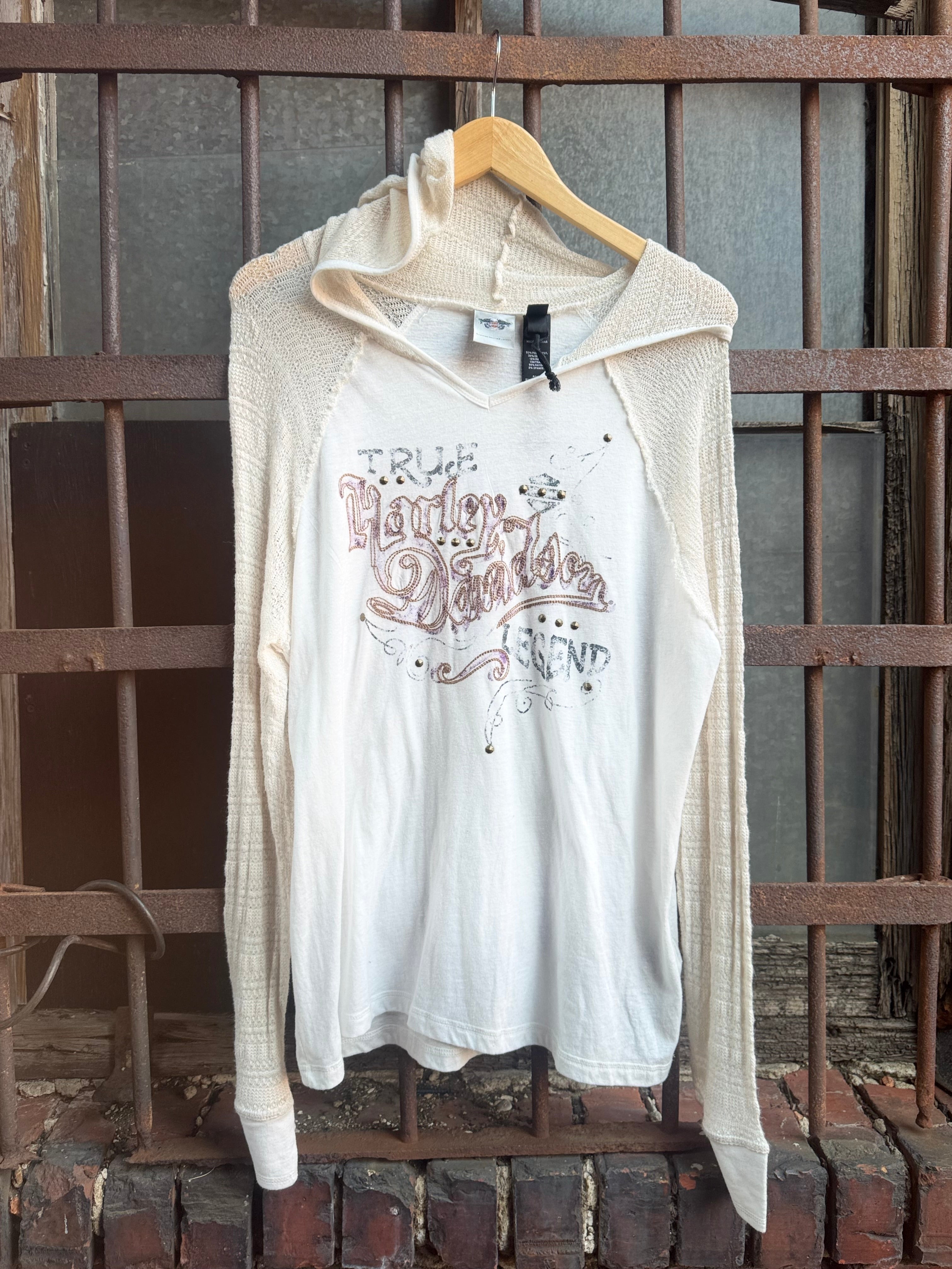 2000s Harley Davidson Distressed White Hooded Long Sleeve Top Ladies 2X ASIS