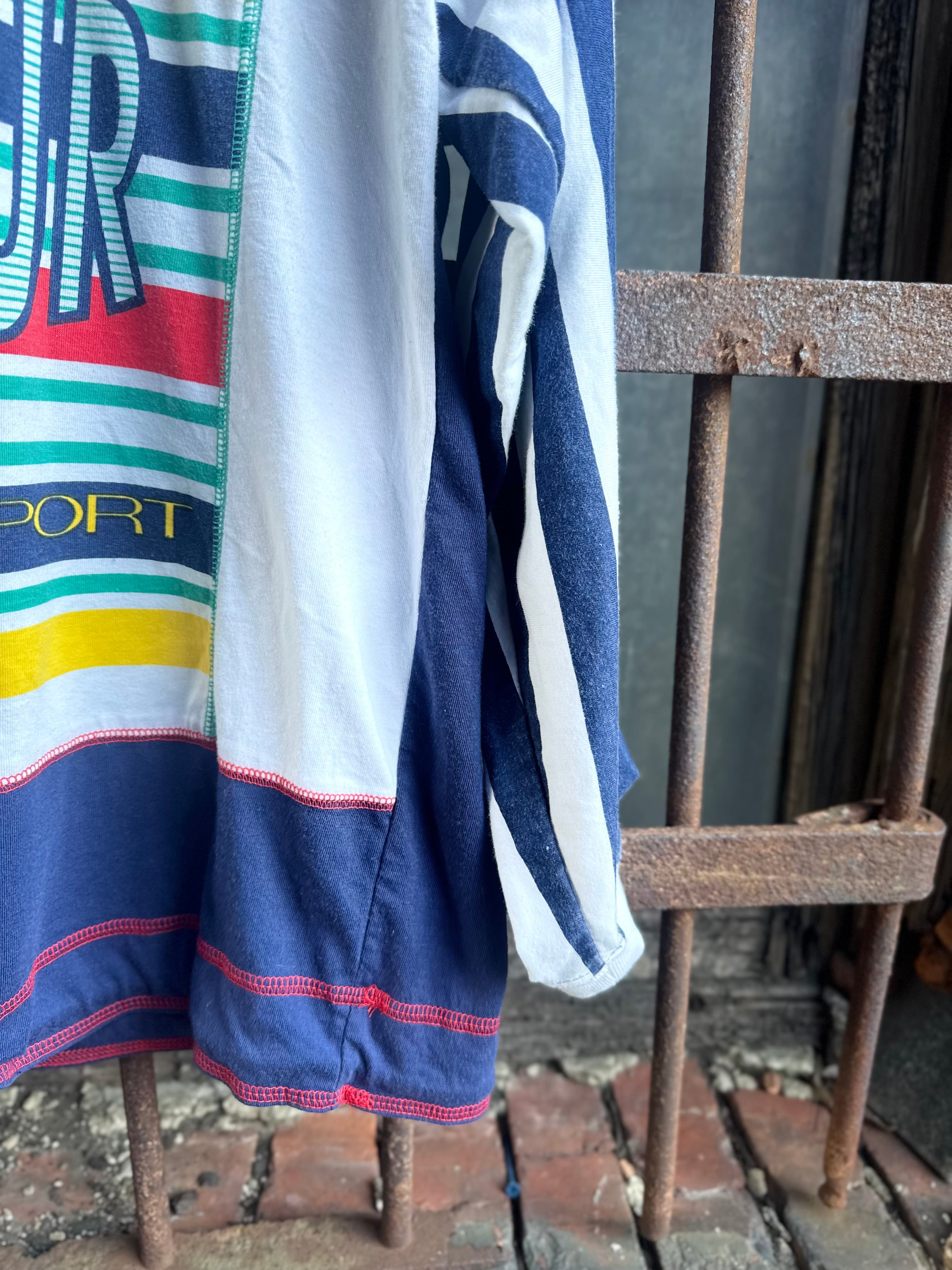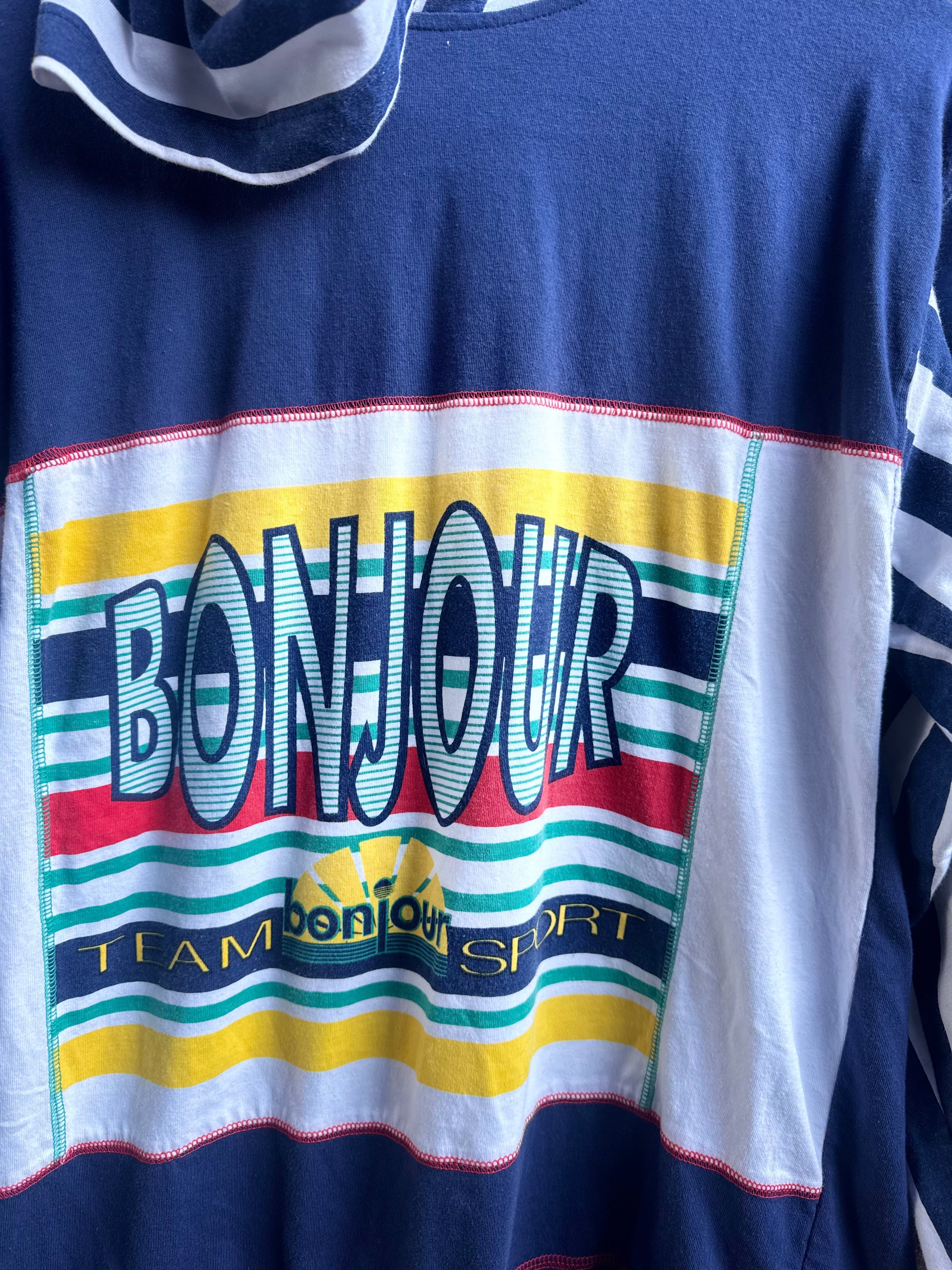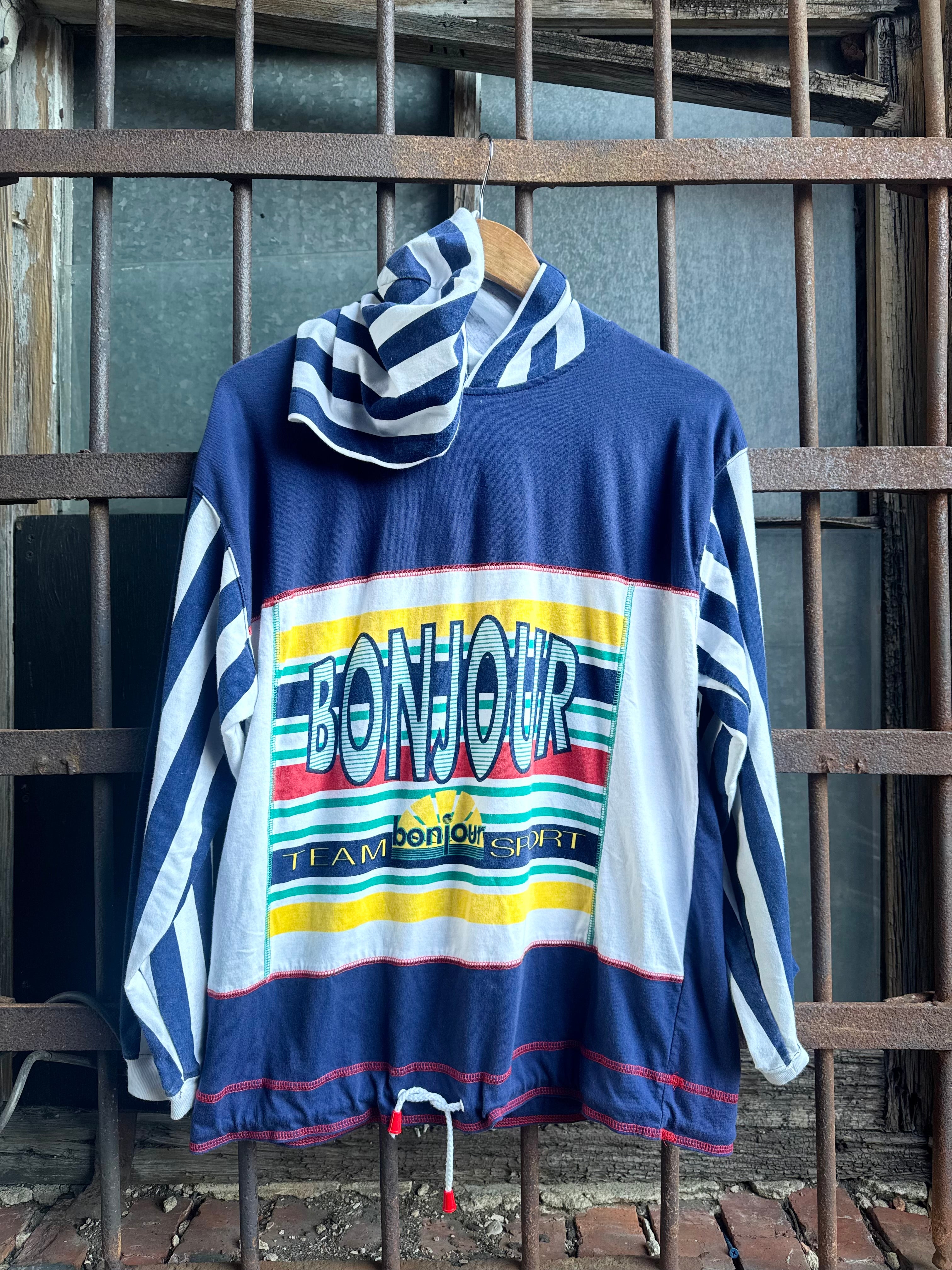 Description: 90's Bonjour Sports Striped Hooded Tee