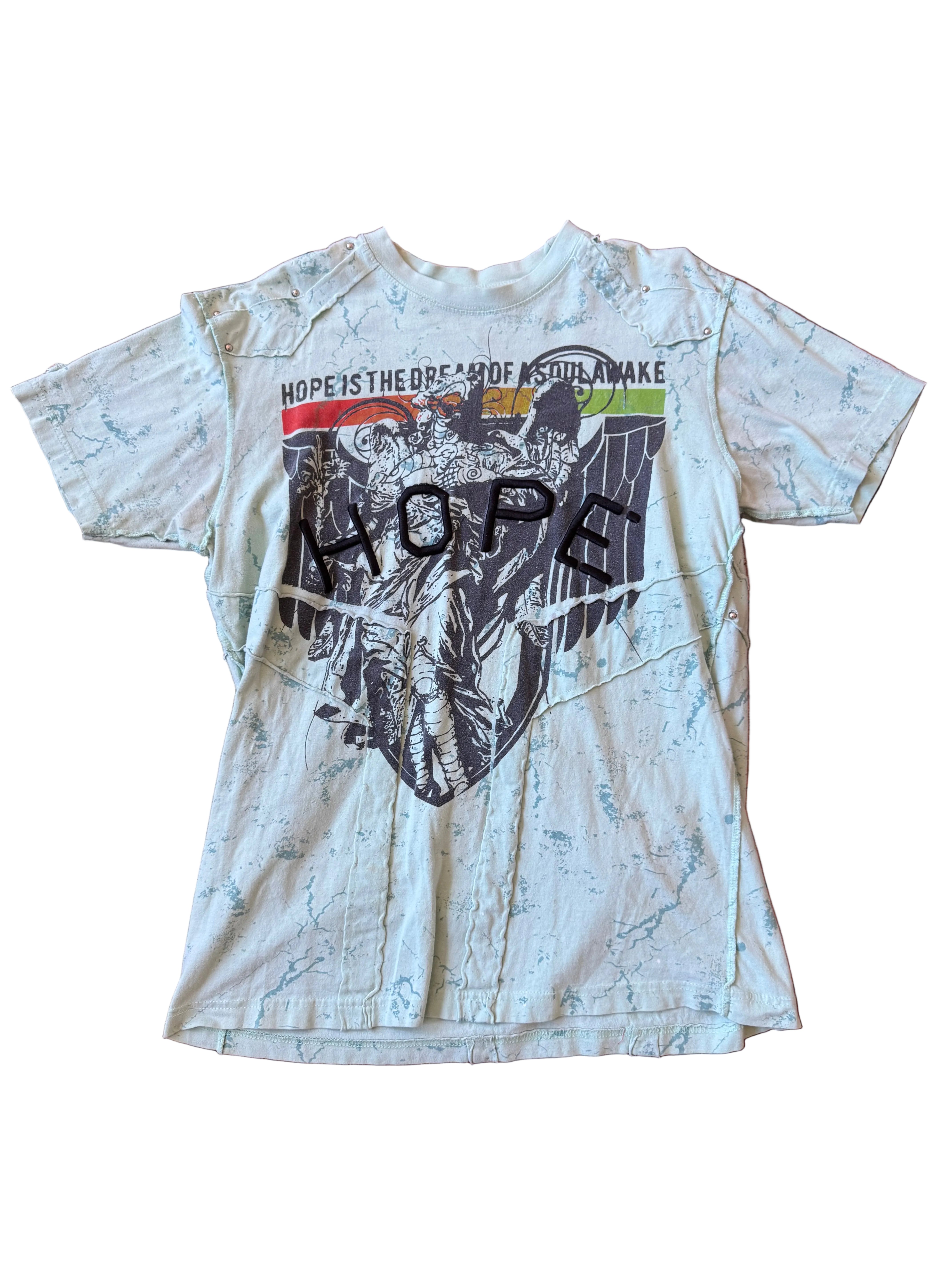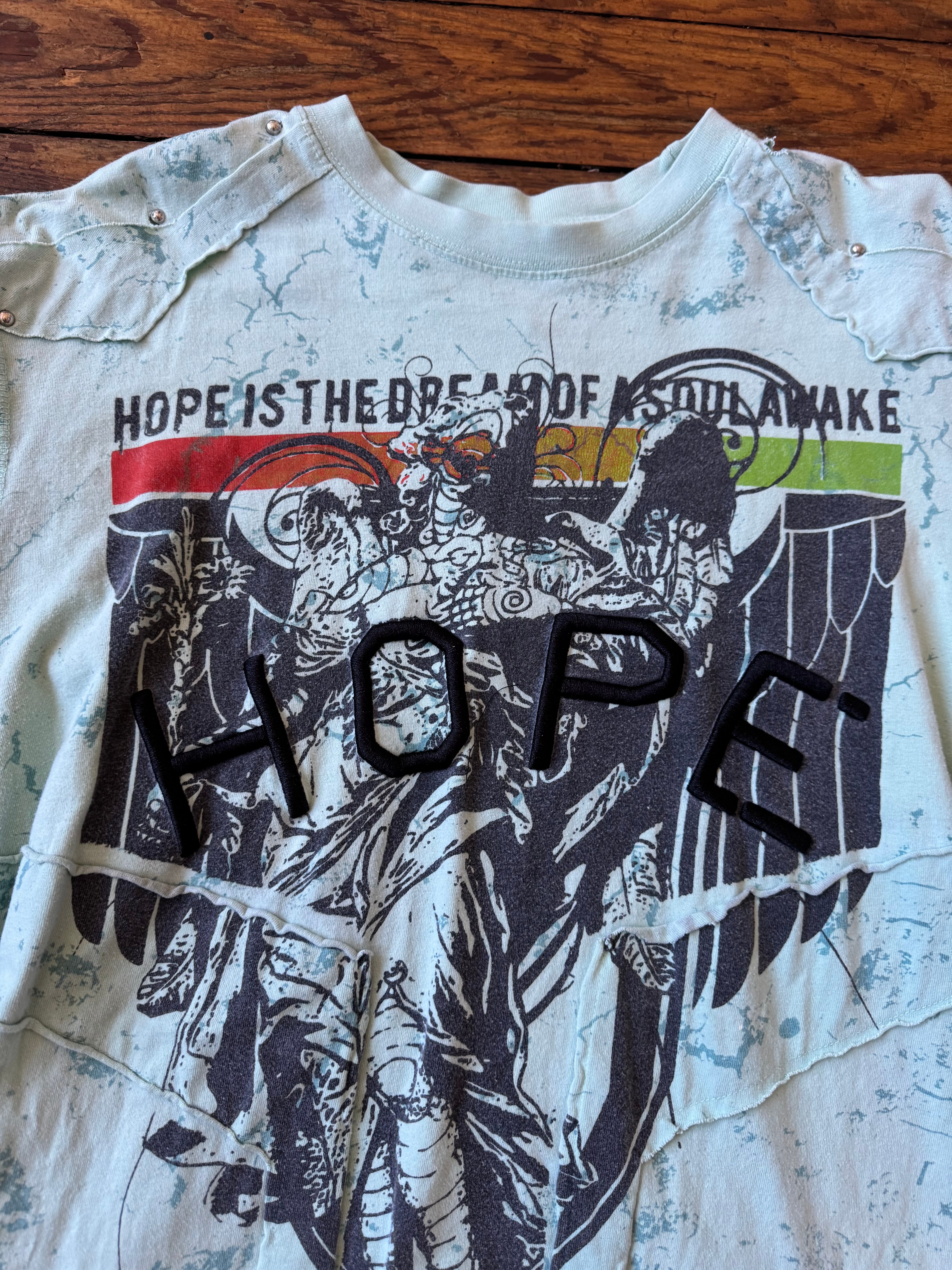 Distressed "Hope is The Dream Of a Soul Awake" Tee w Patches and Studs Mens Medium
