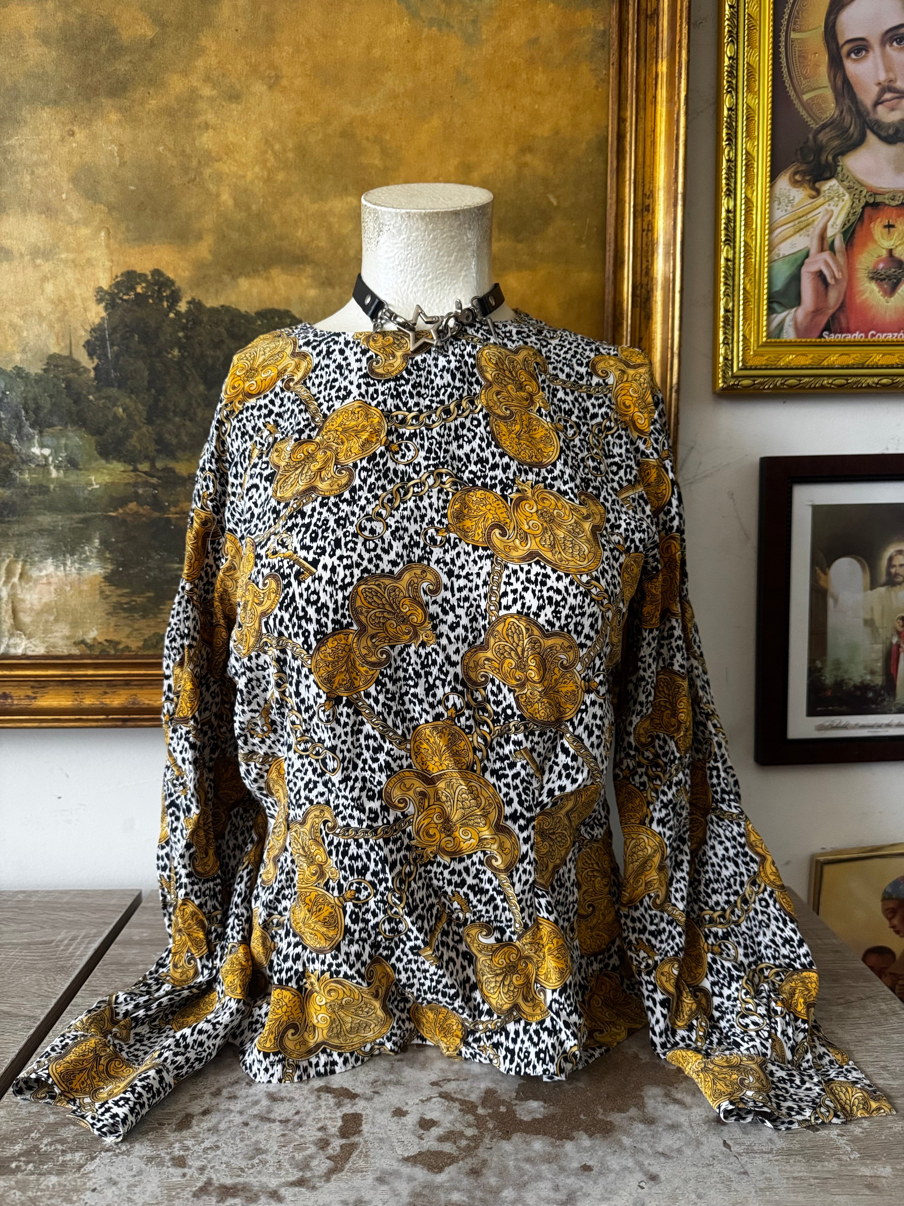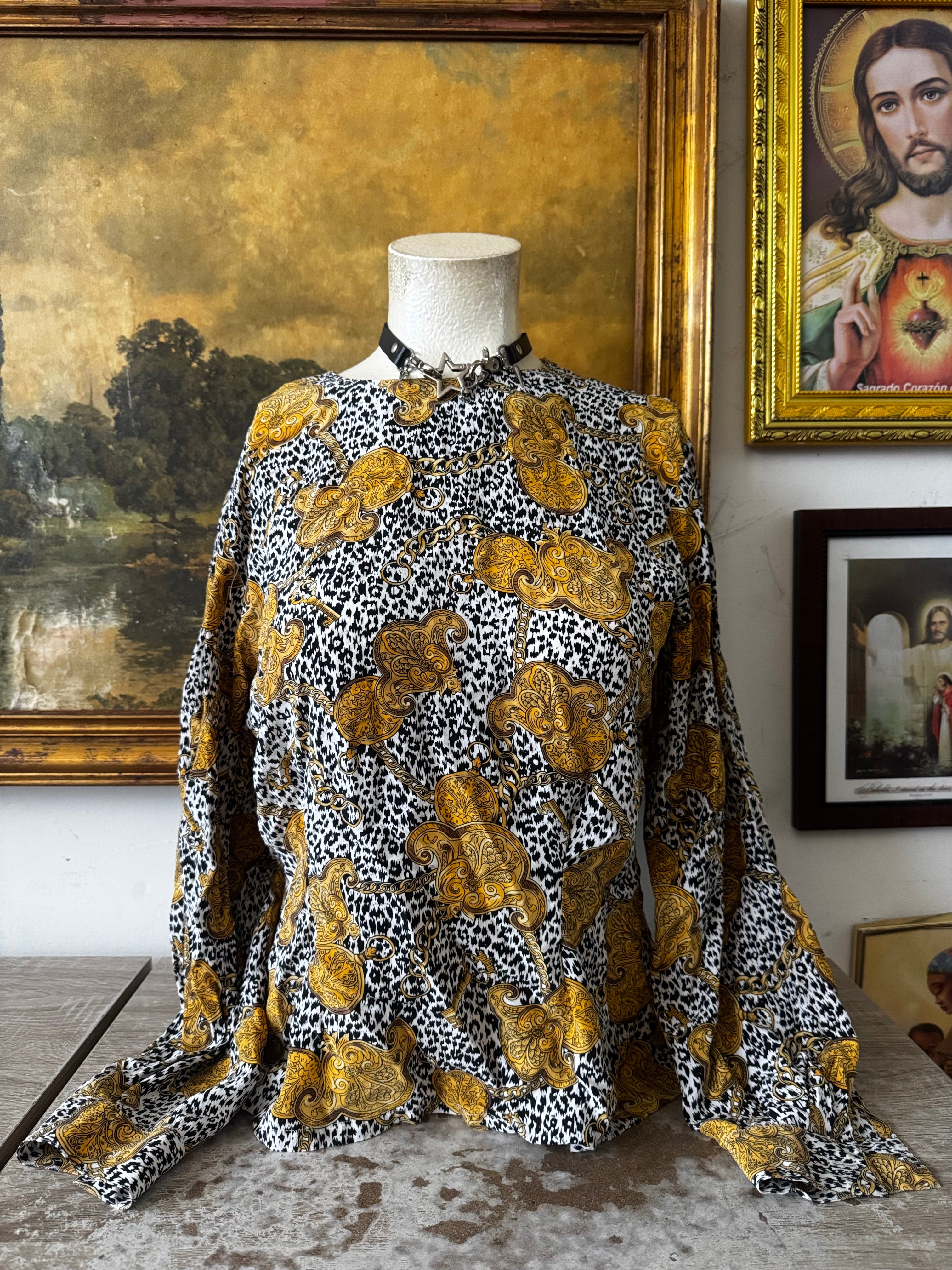 Vintage Silk Animal Print Royalty Chain Blouse w Back Buttons Petite 6